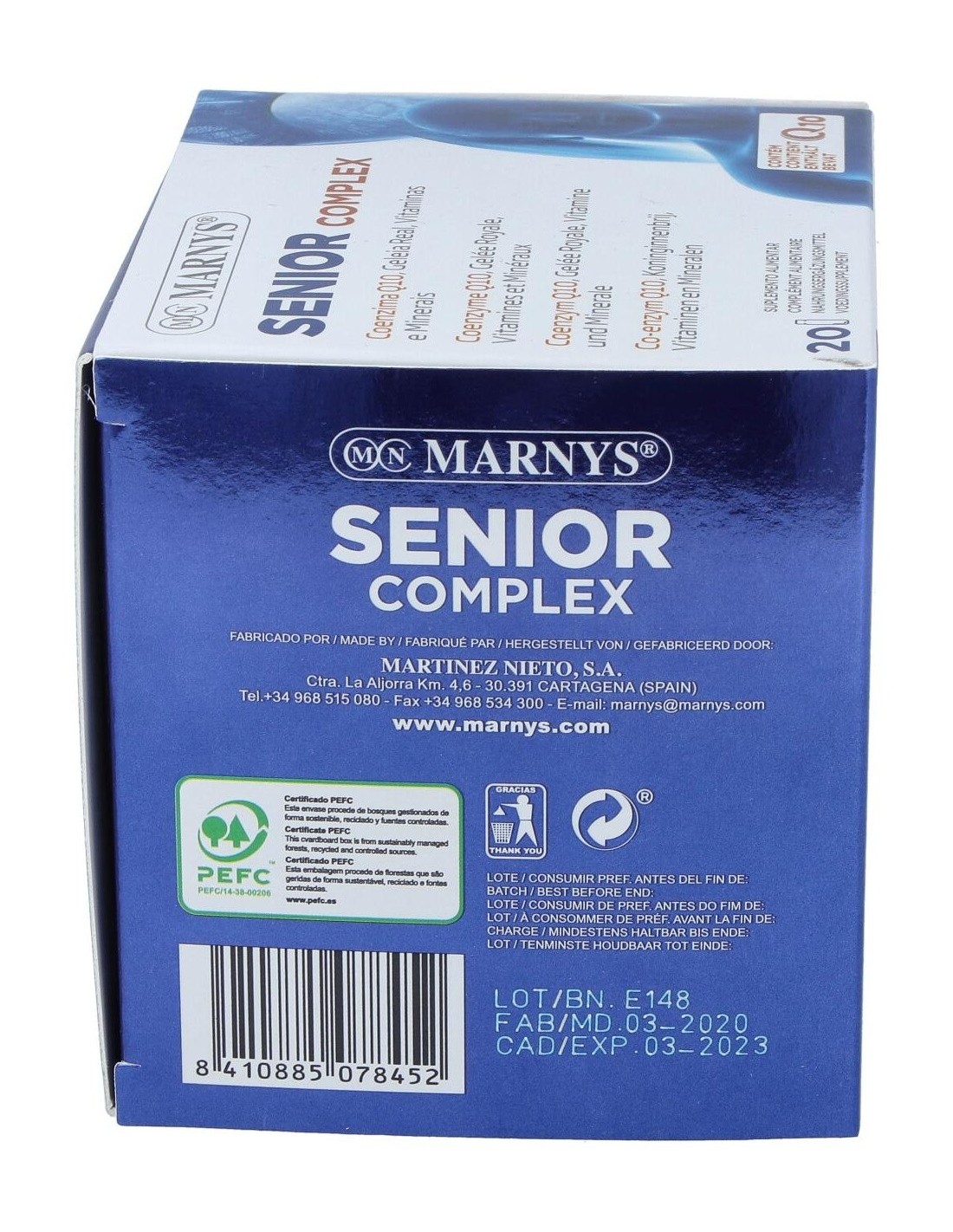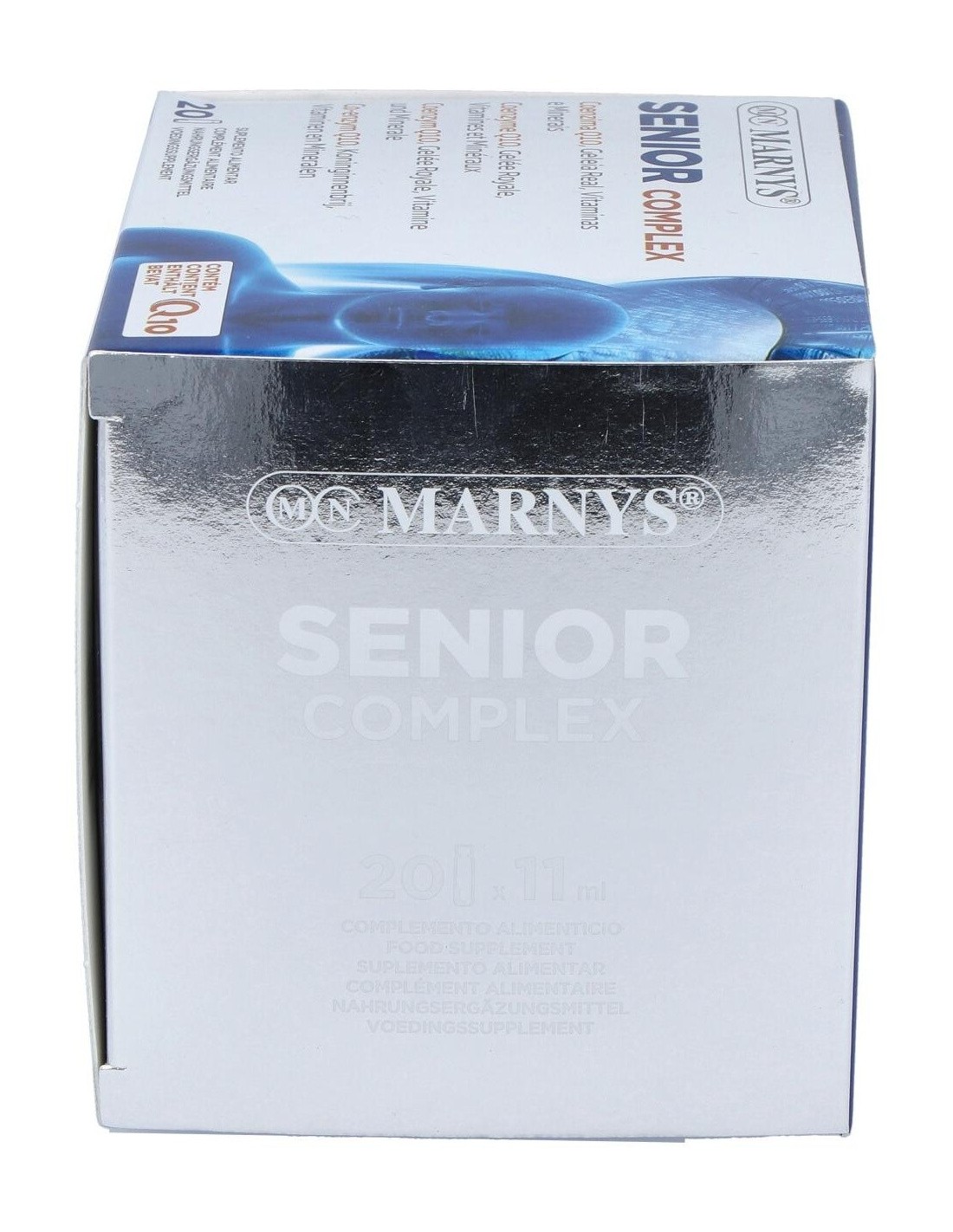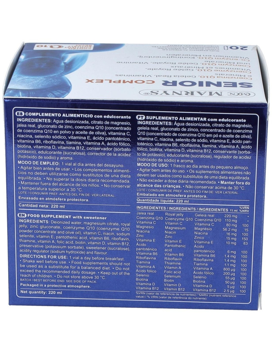Senior Complex con coenzima Q10 contiene zinc y vitaminas A, C, riboflavina, niacina y biotina, que contribuyen al mantenimiento de la piel en condiciones normales, conteniendo también selenio, que junto al zinc y las vitaminas C, E y riboflavina, contribuyen a la protección de las células frente al daño oxidativo.