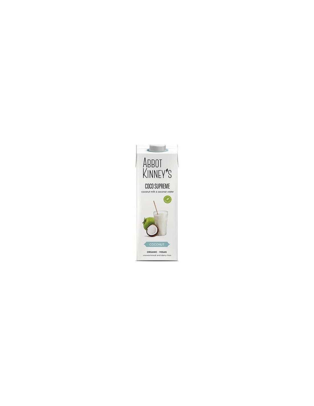 Agua, 40% Agua de coco a partir de concentrado*, 6,8% Leche de coco* (60% de coco* que corresponde al 4,8% del producto acabado, agua, estabilizador: goma guar*), Estabilizadores: goma guar*, goma xantana, Aroma natural de coco*, Sal marina. Valor nutricional por 100 g: VALOR ENERGÉTICO 81 kJ / 19 kcal GRASAS 1,3 g DE LAS CUALES SATURADAS 1,1 g HIDRATOS DE CARBONO 1,7 g DE LOS CUALES AZÚCARES 1,2 g FIBRAS 0,5 g PROTEÍNAS 0,2 g SAL 0,2 g (*)= de cultivo biológico.