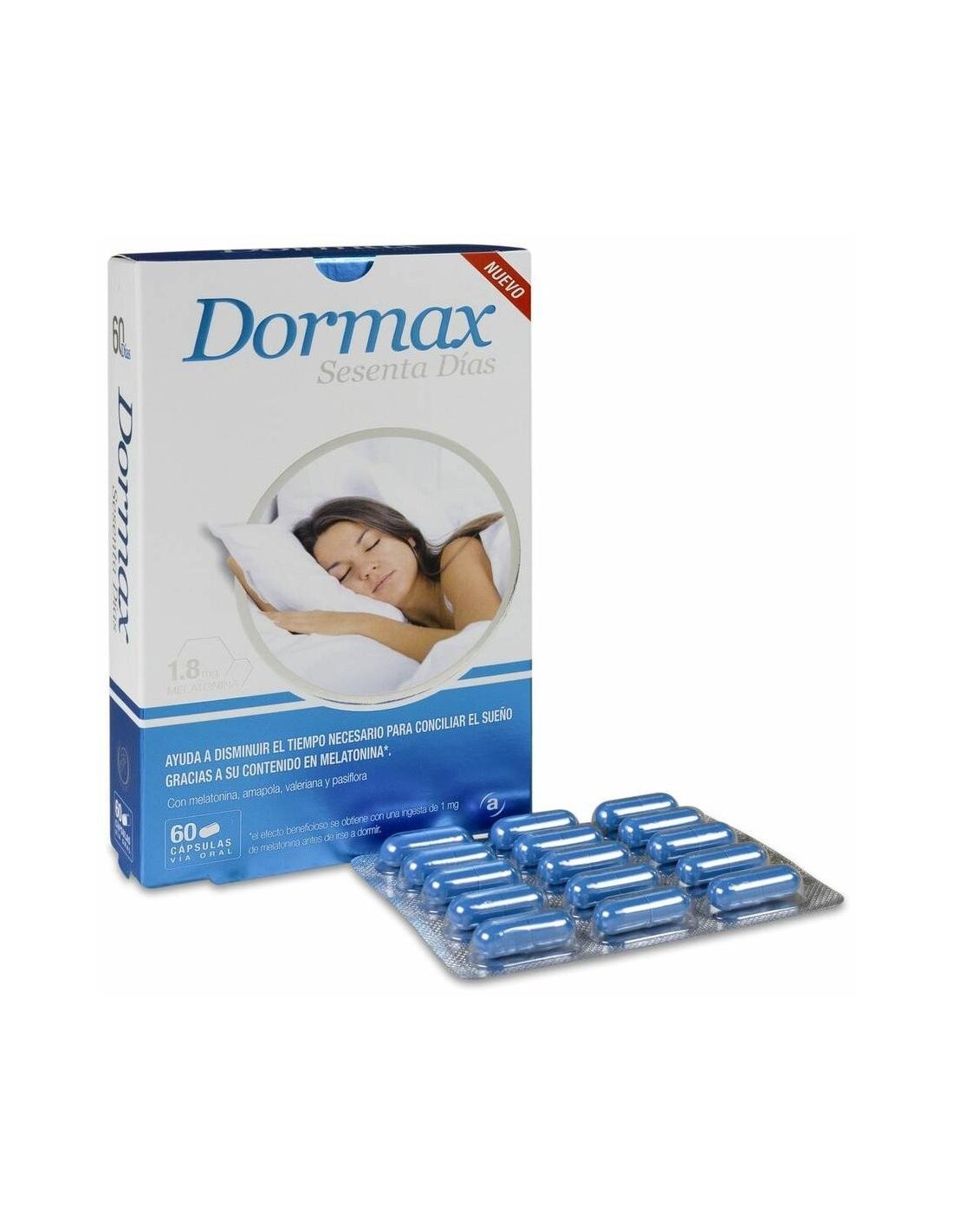 Ingredientes:Extracto seco de pasiflora (Passiflora incarnata L.), extracto seco de valeriana (Valeriana officinalis L.), extracto seco de amapola (Eschscholzia californica Cham.), estabilizantes (E-460i y E-470b), melatonina. Cápsula: gelatina, colorantes (E-171 y E-132).Modo de empleo:Tomar 1 cápsula al día 1 hora antes de acostarse.Presentación:Envase de 30 cápsulas.Recomendaciones y advertencias:No contiene lactosa ni gluten. No utilizar durante el embarazo o la lactancia ni en niños menores de 12 años.