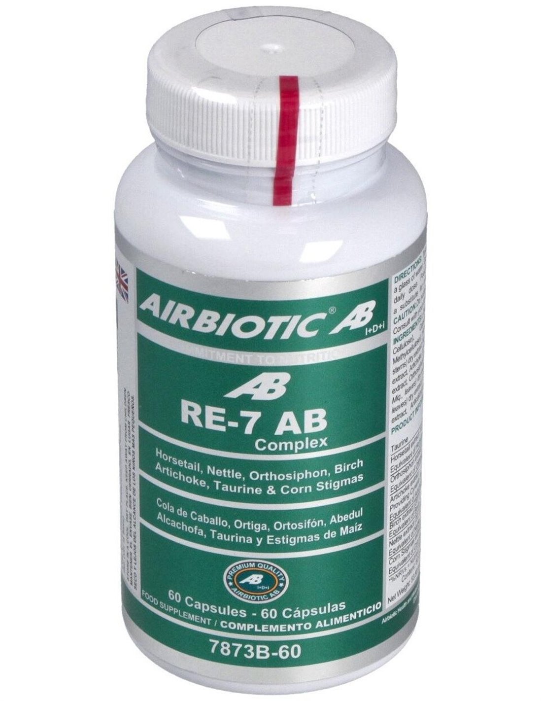 RE-7 de Airbiotic® es una fórmula exclusiva que combina 7 nutrientes a unas concentraciones muy superiores a las habitualmente presentes en productos similares. Aporta 250 mg del aminoácido taurina, 1.600 mg de cola de caballo (Equisetum arvense), 1.000 mg de ortosifón (Orthosiphon stamineus), 1.250 mg de alcachofa (Cynara scolymus), 1.000 mg de abedul (Betula pendula), 1.000 mg de ortiga (Urtica dioica) y 50 mg de estigmas de maíz (Zea mays). Hay muchos productos parecidos, pero no encontrarás ninguno con esta selección de nutrientes y a estas concentraciones. Si buscas lo mejor, tienes que probarlo. Ingredientes activos por cápsula: