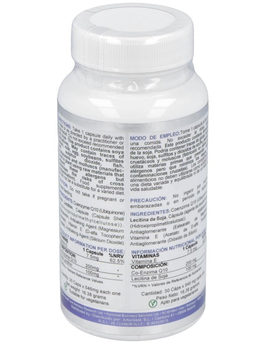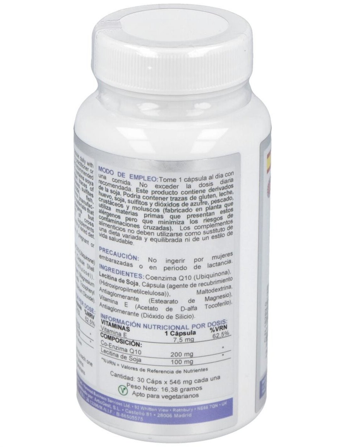 Coenzima Q10 (ubiquinona), lecitina de soja, cápsula (agente de recubrimiento (hidroxipropilmetilcelulosa)), maltodextrina, antiaglomerante (estearato de magnesio), vitamina E (acetato de D-alfa tocoferilo). Antiaglomerante (Dióxido de silicio).