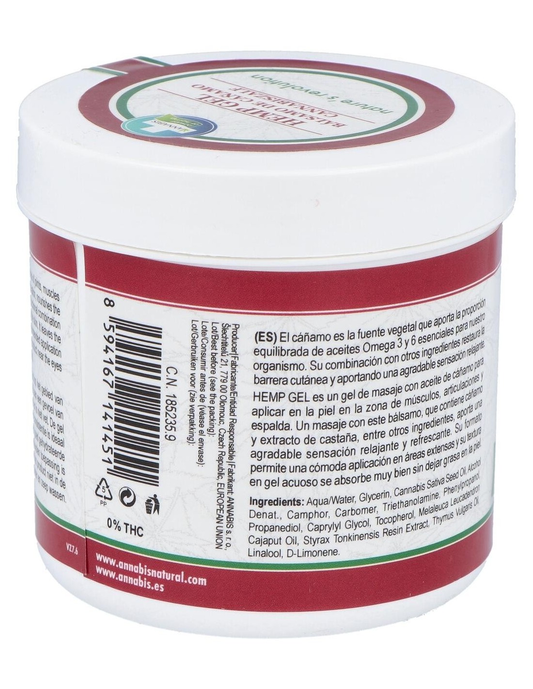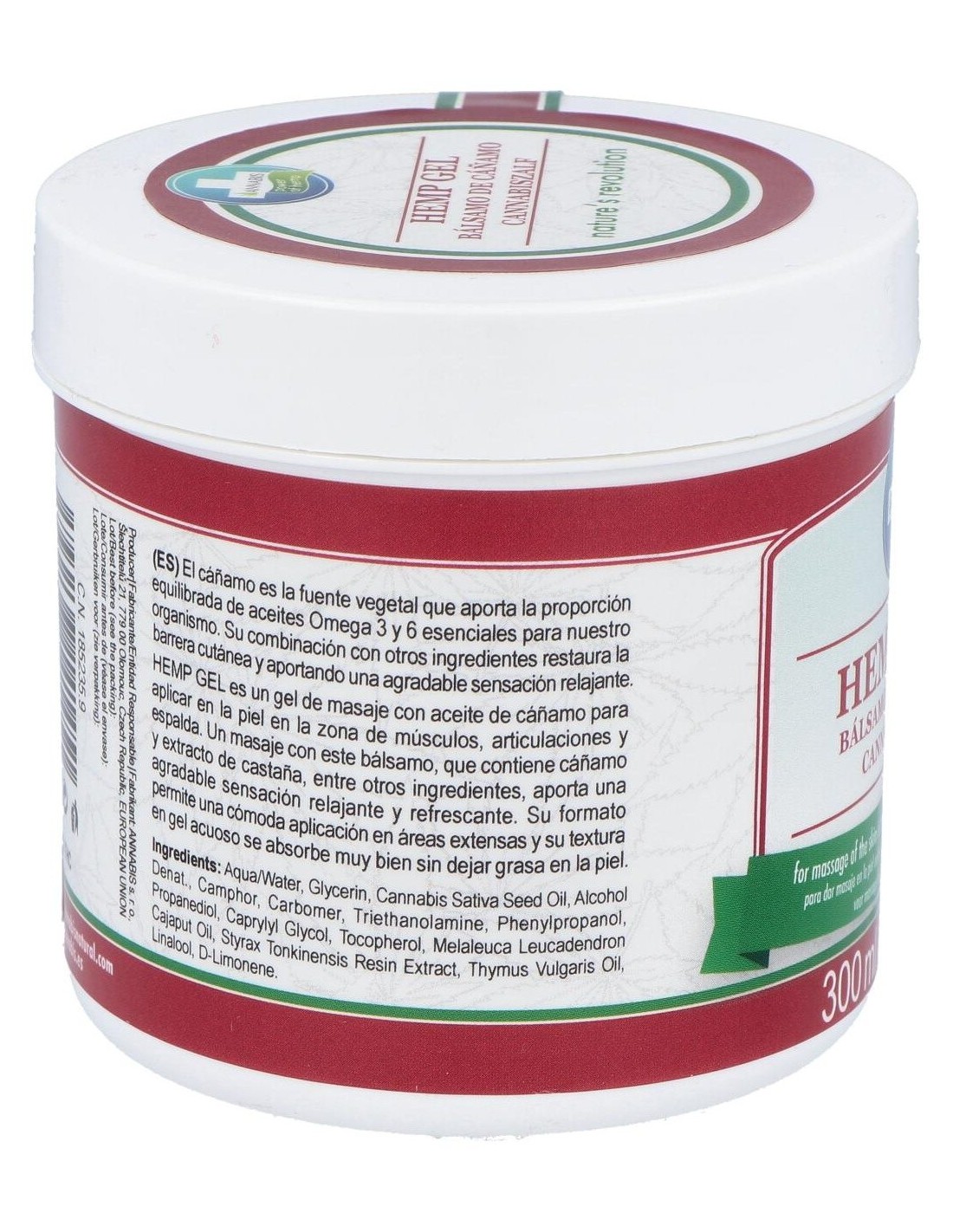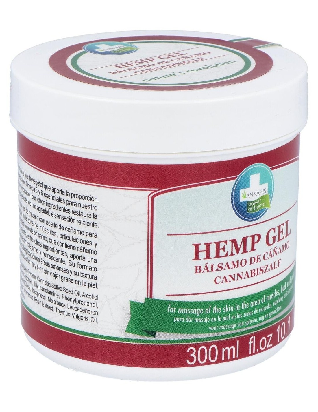 Aqua, Glycerin, Cannabis Sativa Seed Oil, Alcohol Denat., Camphor, Carbomer, Triethanolamine, Phenylpropanol, Propanediol, Caprylyl Glycol, Tocopherol, Melaleuca Leucadendron Cajaputi Oil, Styrax Tonkinensis Resin Extract, Thymus Vulgaris Oil.