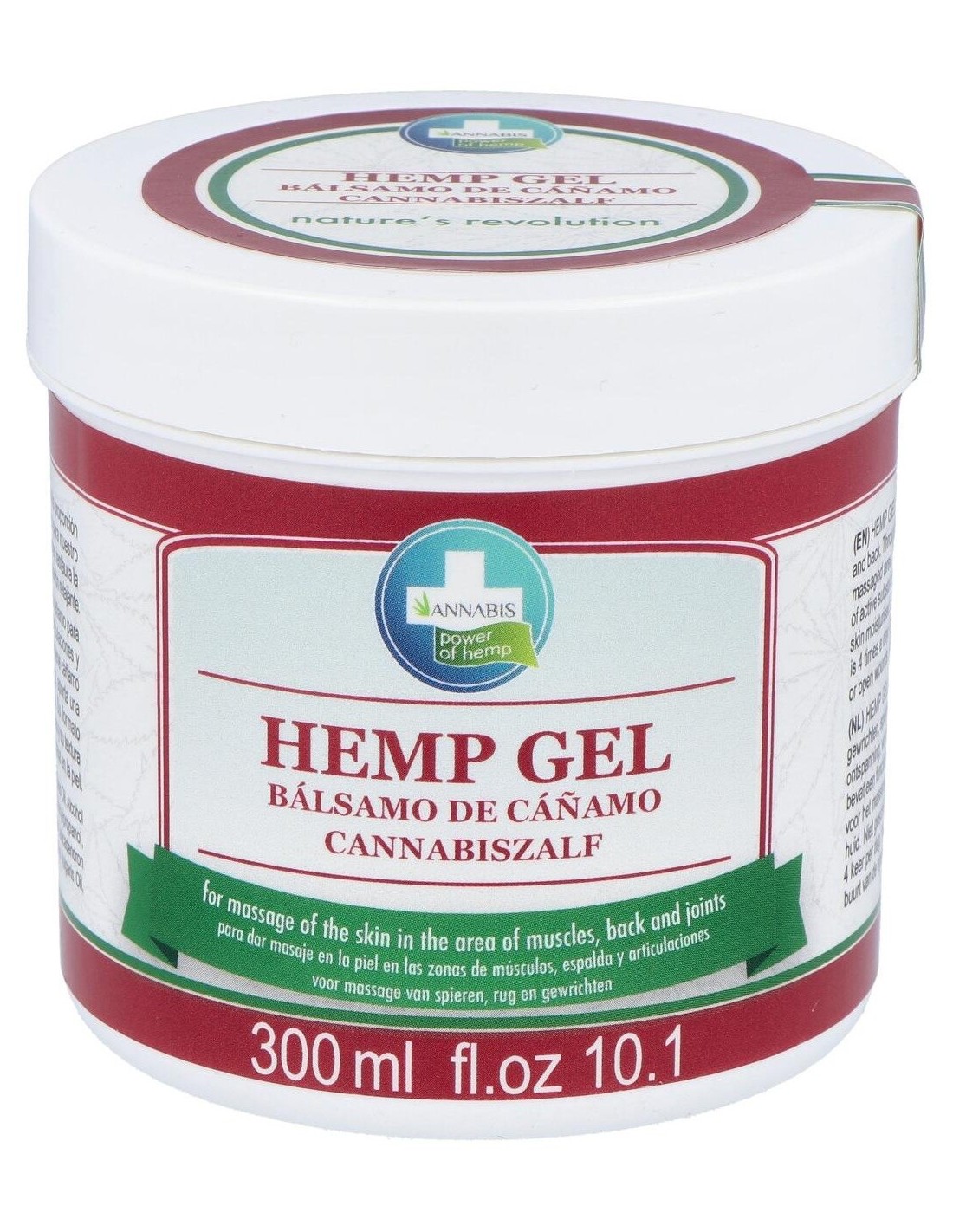 Gel de masaje a base de cáñamo para la piel en zonas amplias, tales como las piernas o la espalda, o bien para aplicación frecuente en la piel de las zonas de músculos, tendones y articulaciones, para ayudar a aliviar la sensación de dolor.
