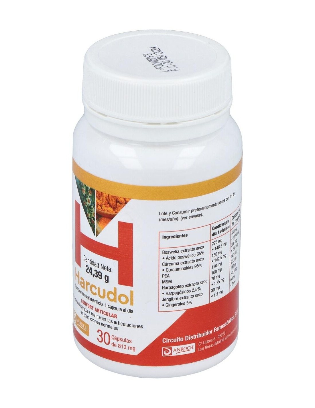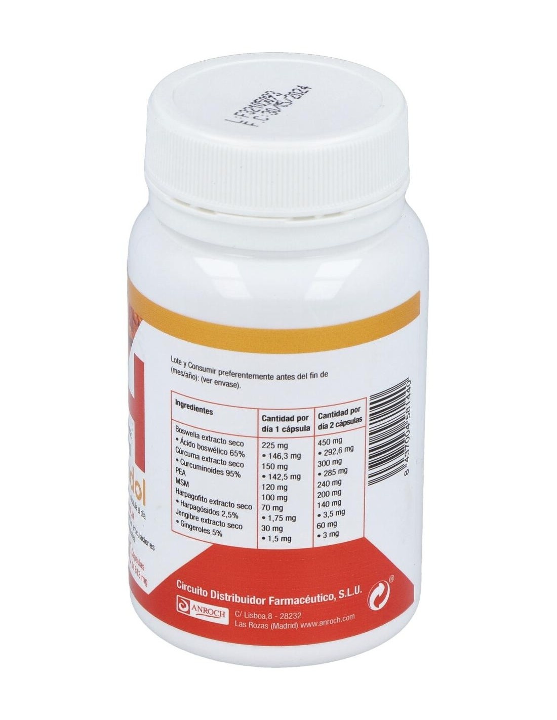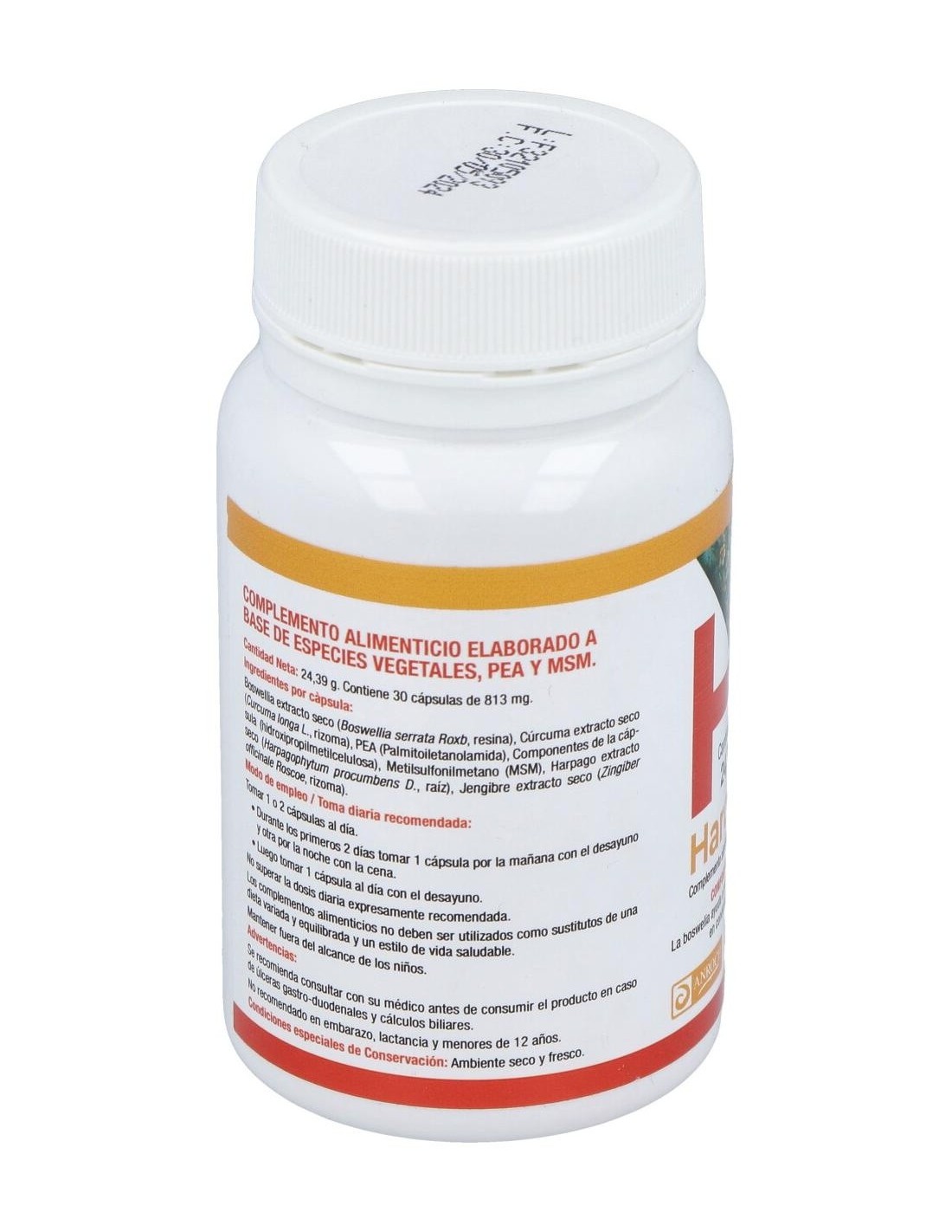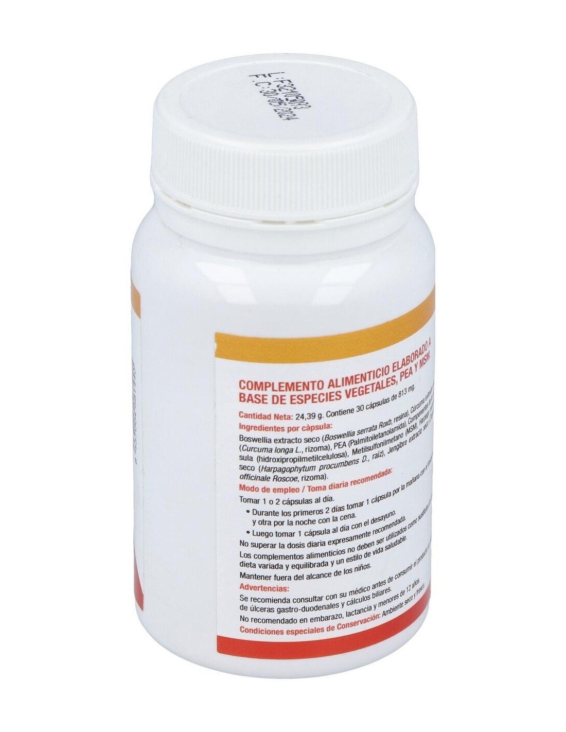 Boswellia extracto seco (Boswellia serrata Roxb, resina), Cúrcuma extracto seco (Curcuma longa L., rizoma), PEA (Palmitoiletanolamida), Componentes de la cápsula (hidroxipropilmetilcelulosa), Metilsulfonilmetano (MSM), Harpago extracto seco (Harpagophytum procumbens D., raíz), Jengibre extracto seco (Zingiber officinale Roscoe, rizoma).