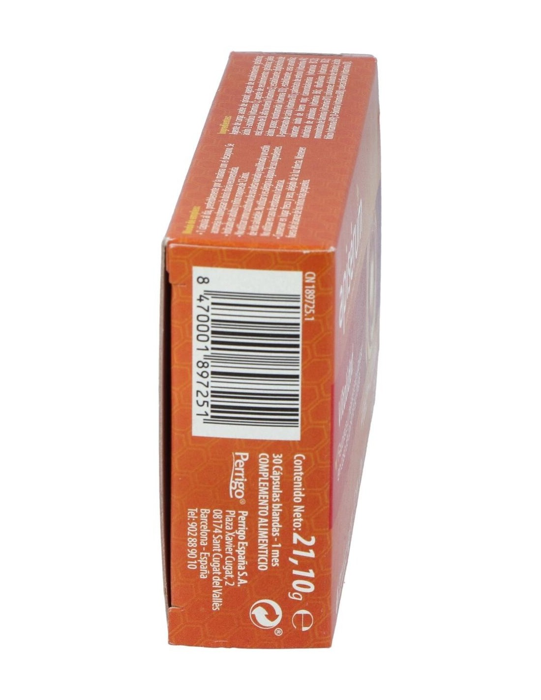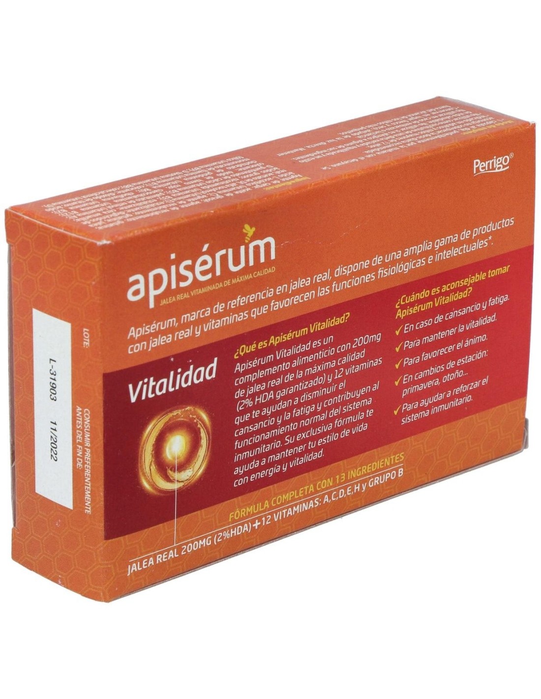 Jalea Real 200 mg, Vitamina B1 1,1 mg, Vitamina B2 1,4 mg, Vitamina B3 16 mg, Vitamina B5 6 mg, Vitamina B6 1,4 mg, Vitamina B9 o Ácido fólico 0,2 mg, Vitamina B12 2,5 mcg, Biotina 50 mcg, Vitamina C 80 mg, Vitamina A 0,8 mg, Vitamina D 5 mcg, Vitamina E 12 mg.