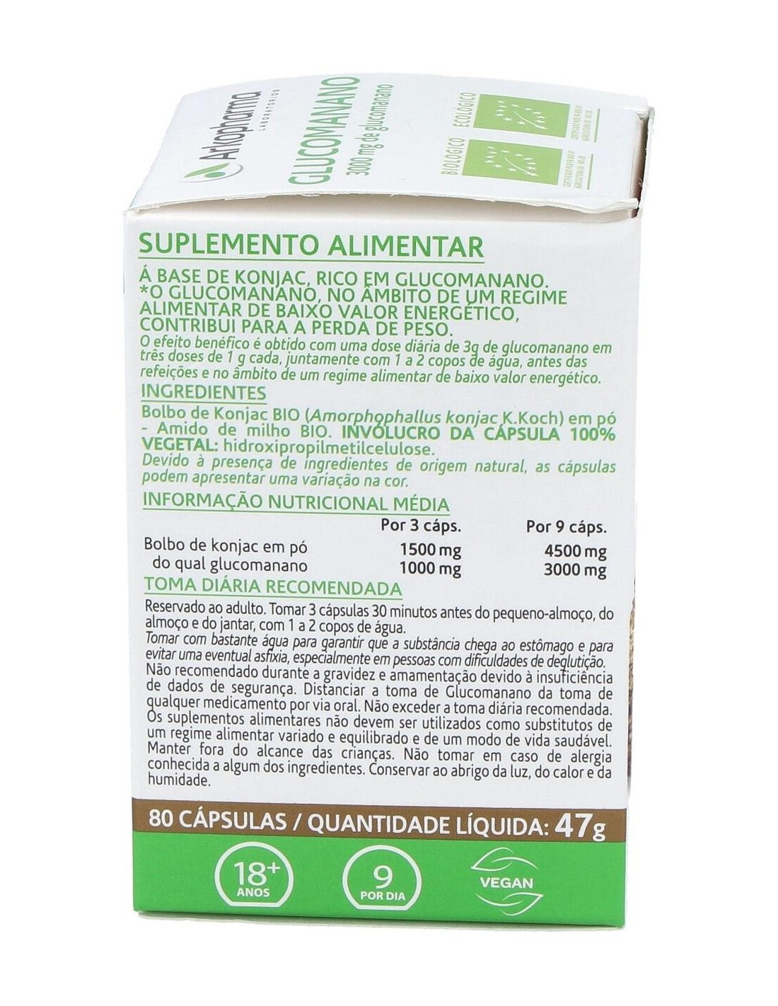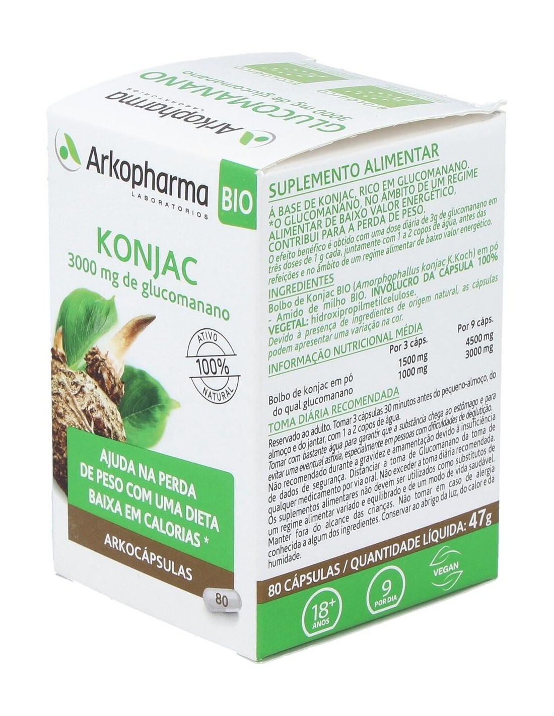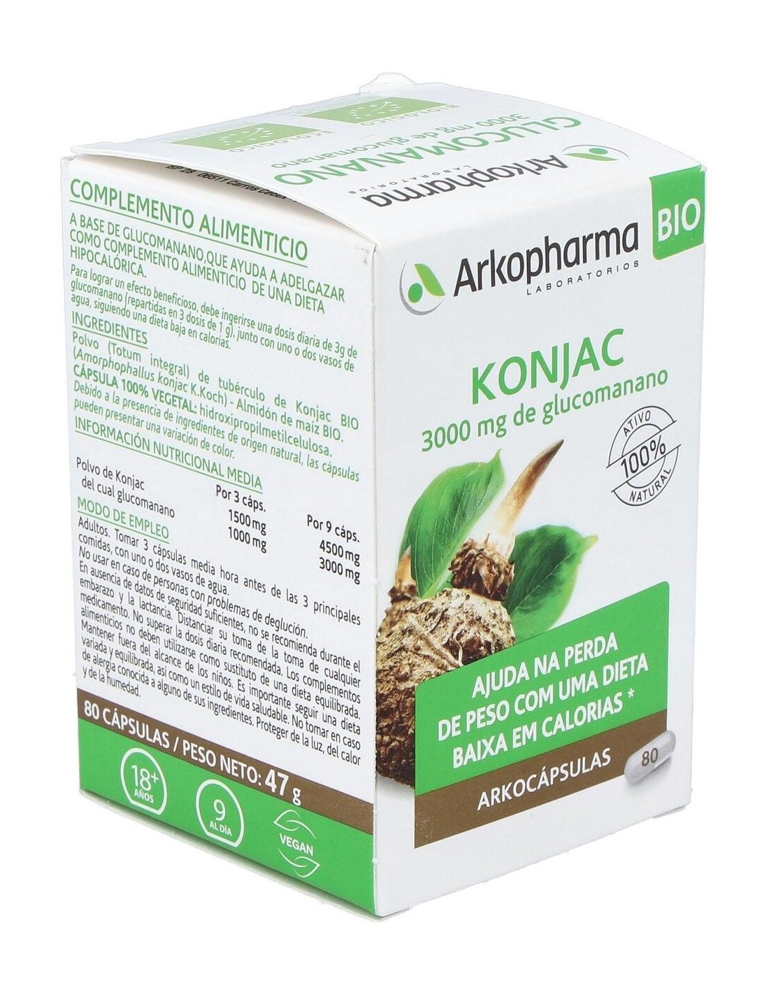 Polvo (Totum integral) de tubérculo de Konjac BIO (Amorphophallus konjac K. Koch). Almidón de maíz BIO. Cápsula 100% vegetal: Hidroxipropilmetilcelulosa. Por 3 cápsulas: Polvo de konjac 1500 mg del cual Glucomanano 1000 mg