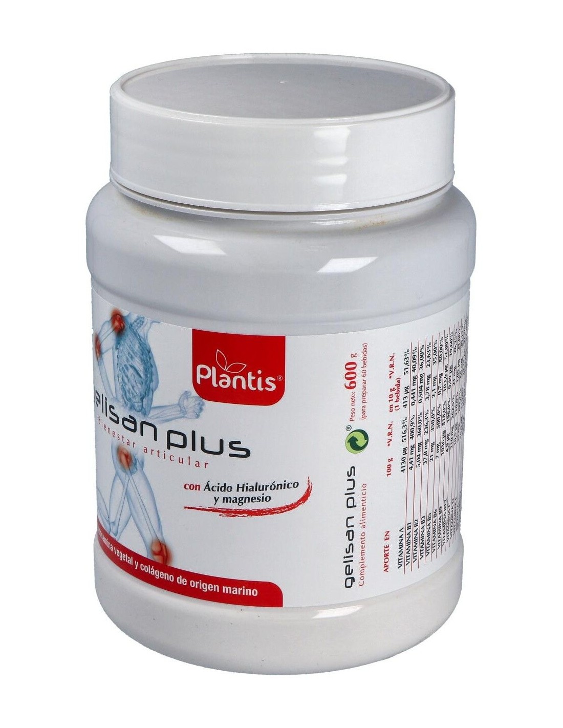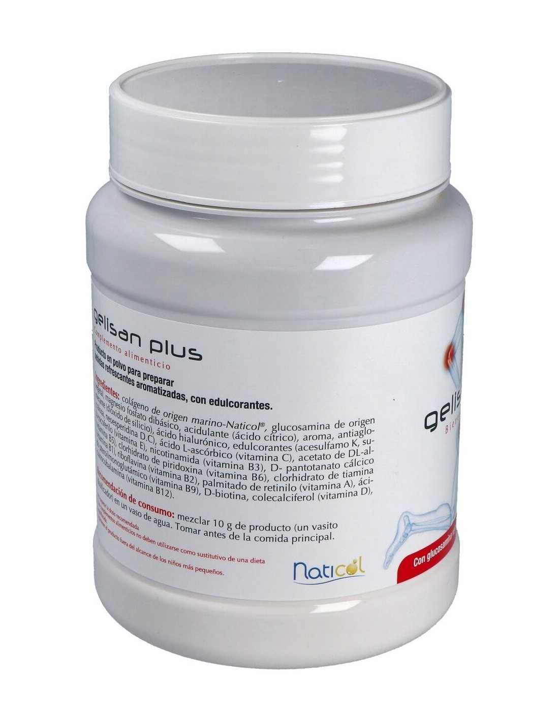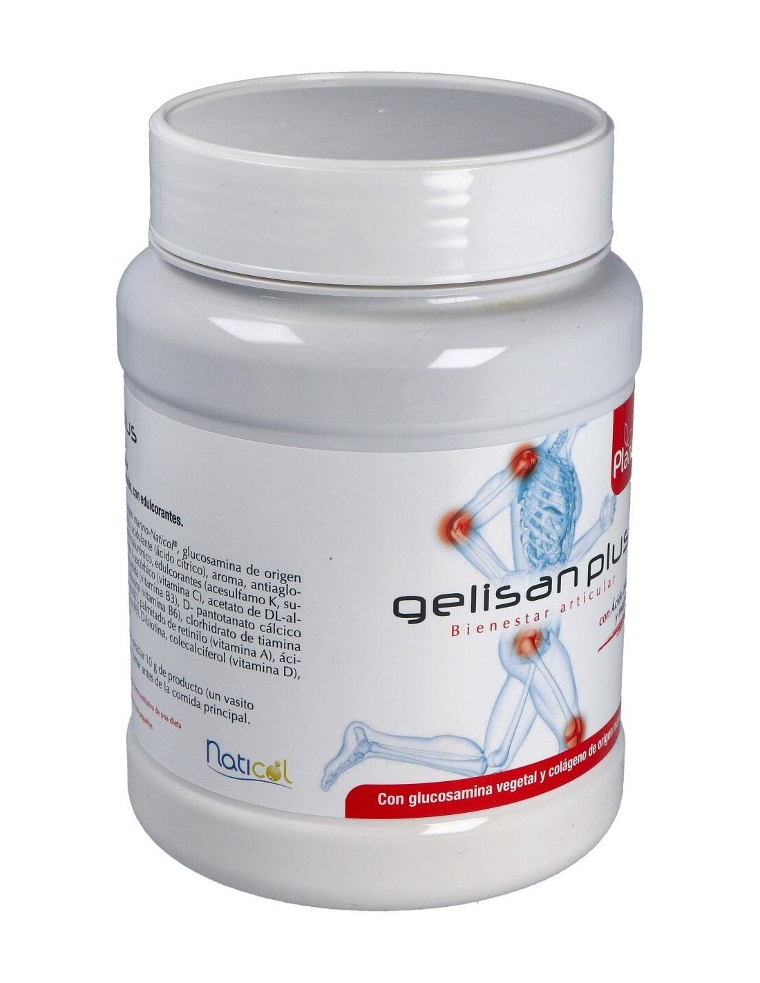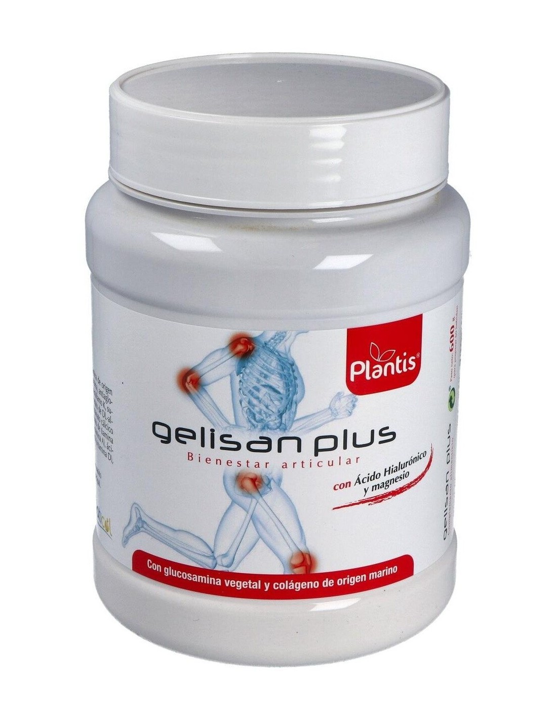 Gelisan Plus es un compuesto que conjuga todos los elementos que inciden de manera positiva en los problemas articulares producidos por un exceso trabajo de las articulaciones como en el caso de los deportistas, o como consecuencia de la acción de enfermedades degenerativas como artritis, artrosis o reuma.La base del preparado es colágeno de origen marino, ácido hialurónico y glucosamina de origen vegetal complementados con un complejo vitamínico que aporta todas las vitaminas y magnesio.El colágeno de origen marino se caracteriza por un elevado contenido en prolina e hidroxiprolina aminoácidos fundamentales para la normal formación y mantenimiento del cartílago y por contener también un 25.16% de glicina, aminoácido que junto a otros es un componente principal de numerosos tejidos.La glucosamina es un componente aminomonosacárido de los proteoglicanos del cartílago articular. La glucosamina puede favorecer la reparación del cartílago articular estimulando su producción y aumentado su grosor. El efecto más inmediato es una disminución de dolor en las articulaciones y a largo plazo consigue retardar la progresión de los procesos artrósicos.El ácido hialurónico contiene un 90% de polisacáridos del tipo glycosaminglicanos (GAGs) y se caracteriza por su gran capacidad para retener agua. En nuestro organismo es un elemento natural del líquido sinovial y actúa en las articulaciones como lubrificante para los cartílagos y ligamentos, también actúa como protector frente a las fuerzas mecánicas.Gelisan Plus se refuerza con magnesio que cumple con diversas funciones metabólicas y juega un papel importante en la producción y el transporte de energía. El magnesio también es necesario para la contracción y la relajación muscular.Composición activa por 10 grs: