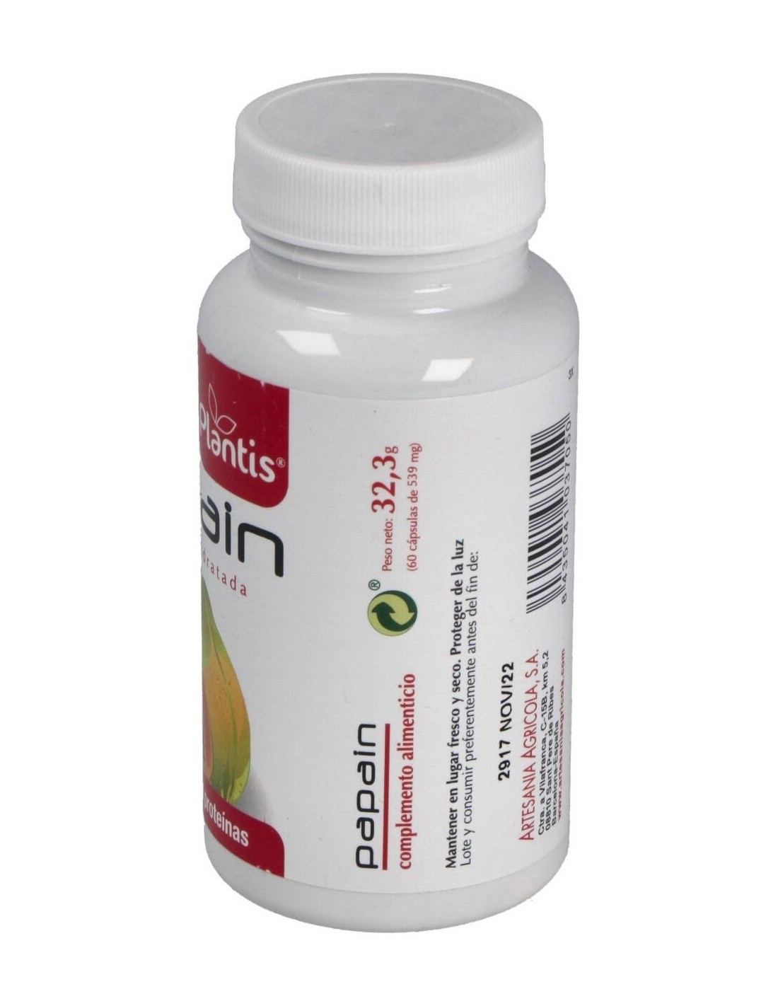 La papaya (Carica papaya L.) es un árbol de 4-8 m con un ramillete terminal de hojas lo que hace que se asemeje a una palmera, sus frutos son bayas de gran tamaño muy apreciados por su sabor. De los frutos antes de su madurez se obtiene por incisión el látex que es la parte usada popularmente gracias a sus beneficiosas propiedades digestivas.El látex es rico en enzimas proteolíticas como la papaína, y la quimopapaína que favorecen la digestión de las proteínas, así como en vitaminas y carotenos.Tradicionalmente la papaya se ha utilizado para el tratamiento de dispepsias, úlcera péptica, gastritis, insuficiencia pancreática exocrina, infecciones parasitarias intestinales (ascaridiasis, enterobiasis, teniasis, toxocariasis o tricuriasis).Papain de Plantis son cápsulas vegetales con un 94% de papaya deshidrata enriquecida con papaína para así potenciar los efectos de los enzimas naturales de la papaya.Actualmente nuestra alimentación no siempre es equilibrada y nuestra dieta comporta un consumo excesivo de proteínas que dificultan el proceso digestivo desencadenando en digestiones pesadas acompañadas de ardor de estómago, sensación de pesadez, etc. Con la ingesta antes de las comidas de cápsulas de Papain, favorecemos la digestión de las proteínas y por tanto el proceso digestivo.Ingredientes:Papaya deshidratada (67.5%), cápsula vegetal [espesante (hidroxipropil metil celulosa), colorantes (óxidos e hidróxidos de hierro)], papaina emulgente (sales magnésicas de ácidos grasos), antiaglomerante (dióxido de silicio).Modo de empleo:Tomar 1-3 cápsulas al día antes de las comidas.Presentación:Envase de 60 cápsulas.
