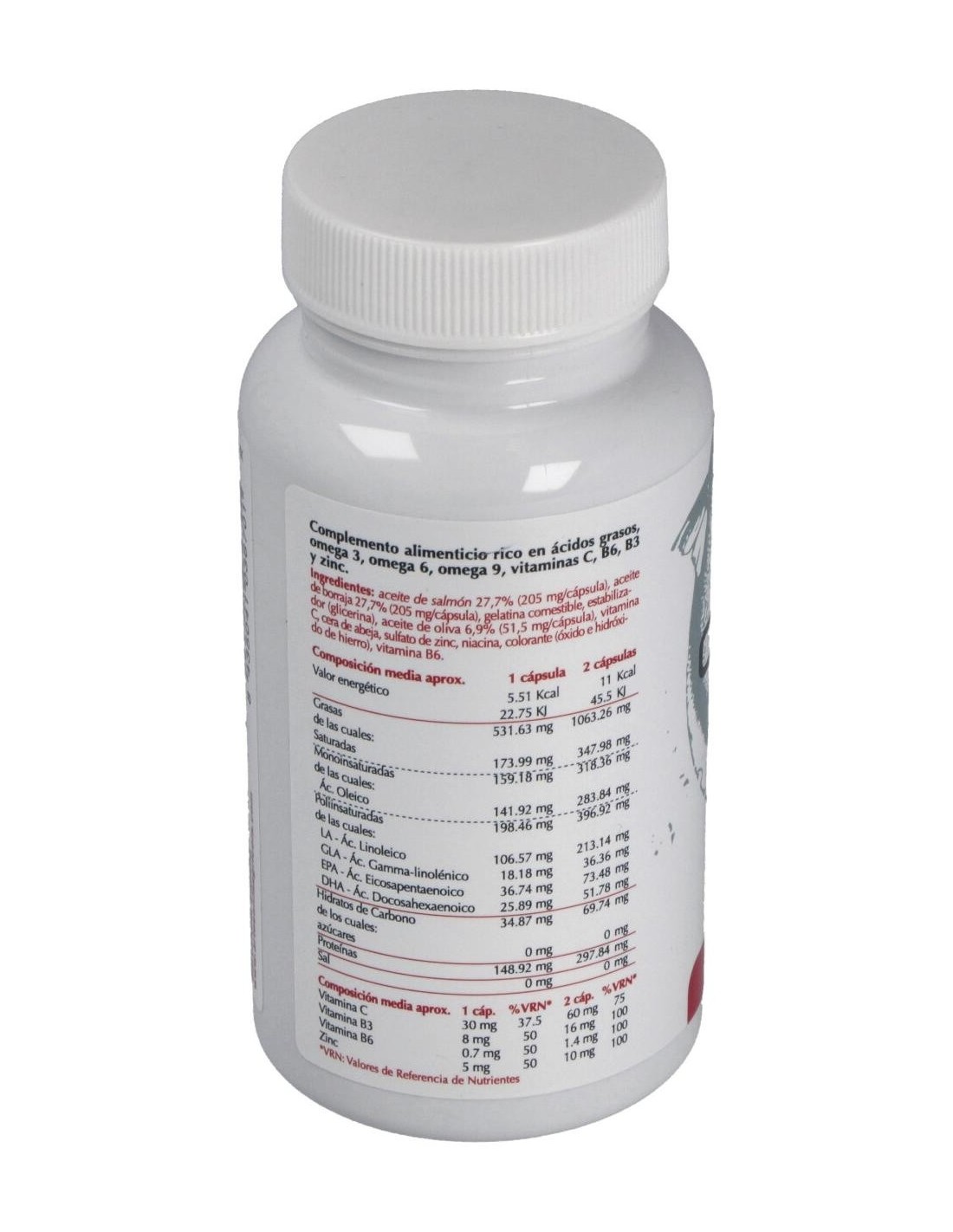 En una sola cápsula podemos encontrar los beneficios de diferentes activos todos ellos encaminados a evitar los trastornos circulatorios:Aceite de salmón: es rico en aceites grasos poliinsaturados de la familia omega 3 (EPA, DHA) que colaboran en la prevención de la arteriosclerosis y en la enfermedad coronaria cardíaca.Aceite de borraja: es rico en ácido linoleico (LA) que pertenece a la familia de los ácidos grasos poliinsaturados omega 6. los ácidos grasos omega-6 rebajan los trigliceridos, disminuyen el colesterol, previenen la formación de coágulos en las arterias al impedir la agregación plaquetaria y disminuyen levemente la presión arterial.Aceite de oliva: tiene un alto contenido en ácido oleico, aceite graso poliiinsaturado de la familia de los omega 9 que le hace muy útil para regular el colesterol: propicia el aumento del colesterol HDL que ejerce un papel protector y ayuda a reducir el colesterol LDL (colesterol malo) colaborando así en la prevención de la arteriosclerosis y sus consecuencias.Las vitaminas C, B3 y B6 contribuye al metabolismo energético normal. El zinc contribuye al metabolismo normal de los ácidos grasos. La vitamina C y el zinc además contribuyen a la protección de las células frente al daño oxidativo.Composición activa por cápsula: