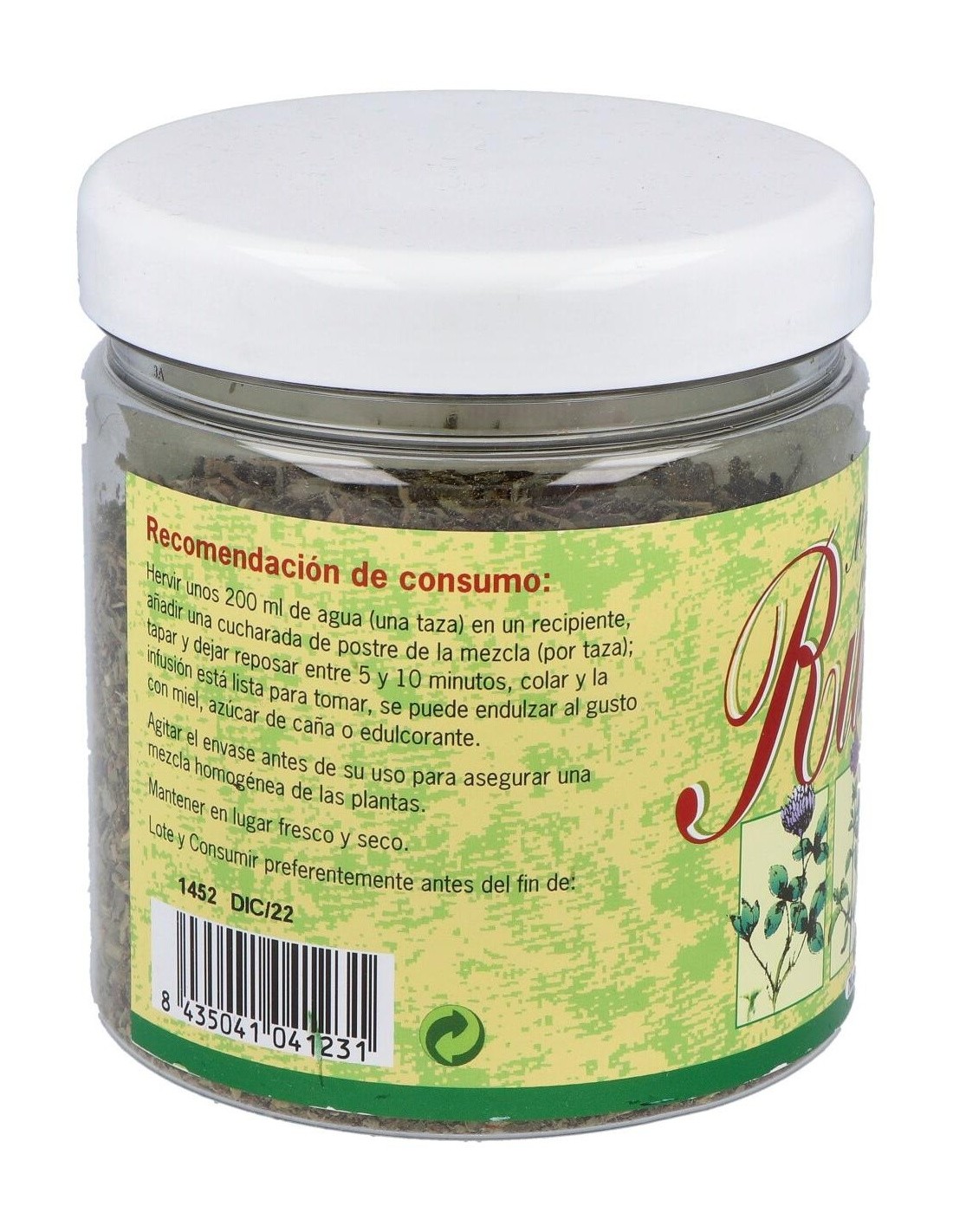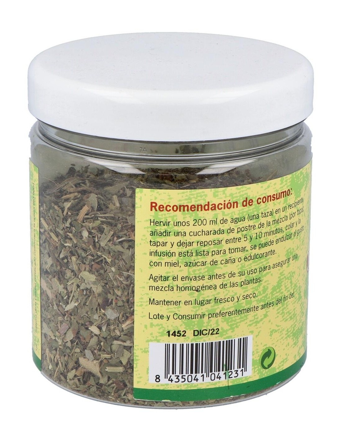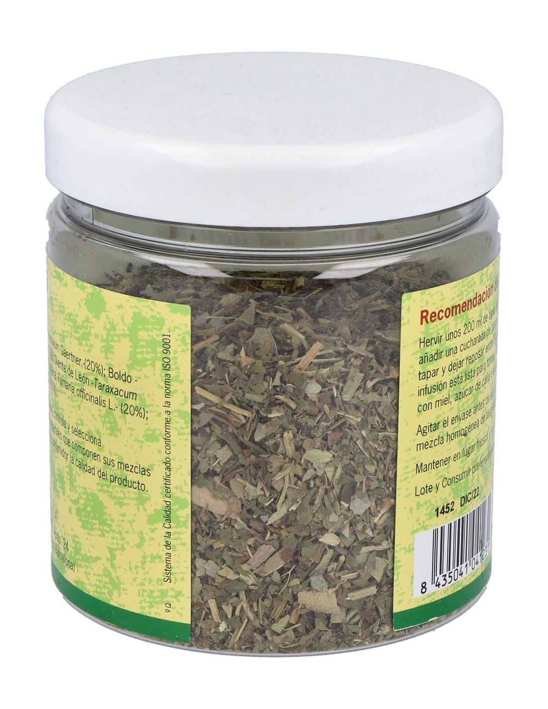Ingredientes:Fumaria - Fumaria officinalis 35 %, Boldo - Peumus boldus 20 %, Diente de león - Taraxacum officinale 20 %, Menta - Mentha piperita 15 %, Manzanilla amarga - Matricaria chamomilla 10 %, Ajenjo - Artemisia absinthium 10 %.Modo de empleo:Hervir unos 200 ml. de agua (1 taza) en un recipiente, añadir una cucharada de postre de la mezcla; tapar y dejar reposar 5-10 minutos, colar y está lista para tomar, se puede endulzar al gusto.Presentación:Envase de 70 gramos.