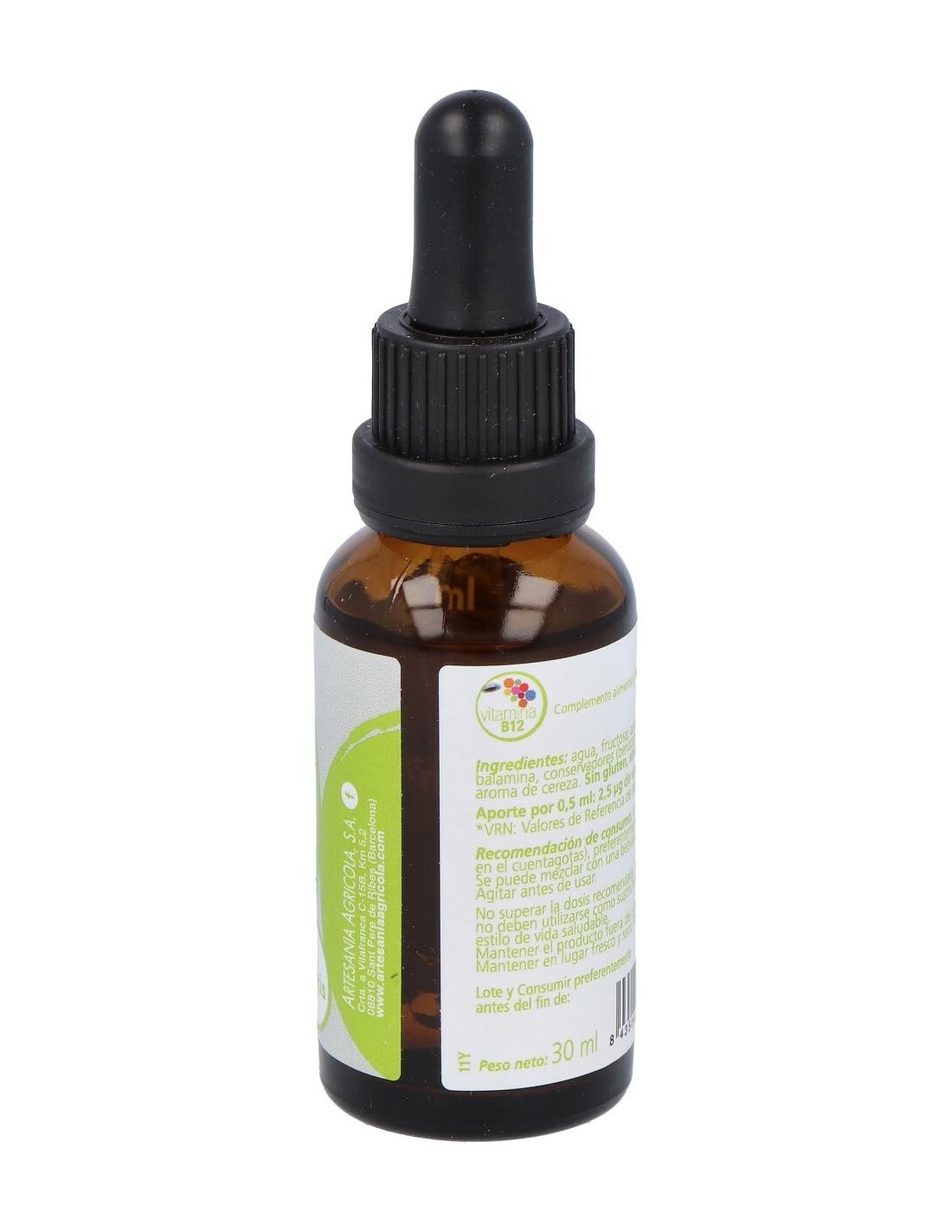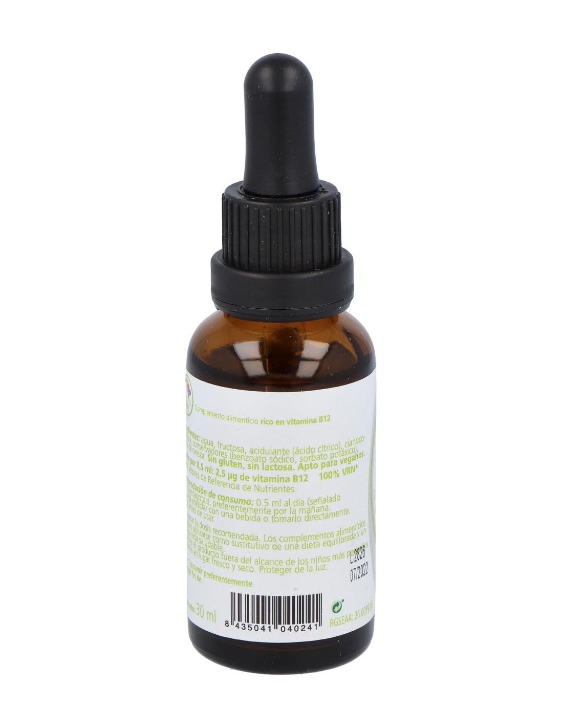 La vitamina B12 es una vitamina hidrosoluble que se sintetiza por un gran número de bacterias intestinales que se hallan de modo habitual en el organismo humano, sin embargo, el aprovechamiento de la vitamina B12 es mínimo, ya que la síntesis ocurre en sitios muy alejados del lugar de absorción fisiológica de la vitamina, por tanto, su ingesta a través de los alimentos es muy necesaria.La vitamina B12 sólo se encuentra en carnes y lácteos y es por ello que veganos y vegetarianos suelen necesitar una suplementación para compensar su déficit. Es necesaria para la elaboración de las células, la síntesis de la hemoglobina y el sistema nervioso nervioso.Composición activa por 0,5 ml:2,5 mcg de vitamina B12.Ingredientes:Agua, fructosa, acidulante (ácido cítrico), cianocobalamina, conservadores (benzoato sódico, sorbato potásico), aroma de cereza.Modo de empleo:Tomar 0.5 ml al día (señalado en el cuenta gotas), preferentemente por la mañana. Se puede mezclar con una bebida o tomarlo directamente. Agitar antes de usar.Presentación:Envase de 30 ml.Recomendaciones y advertencias:No contiene gluten, lactosa. Apto para veganos.