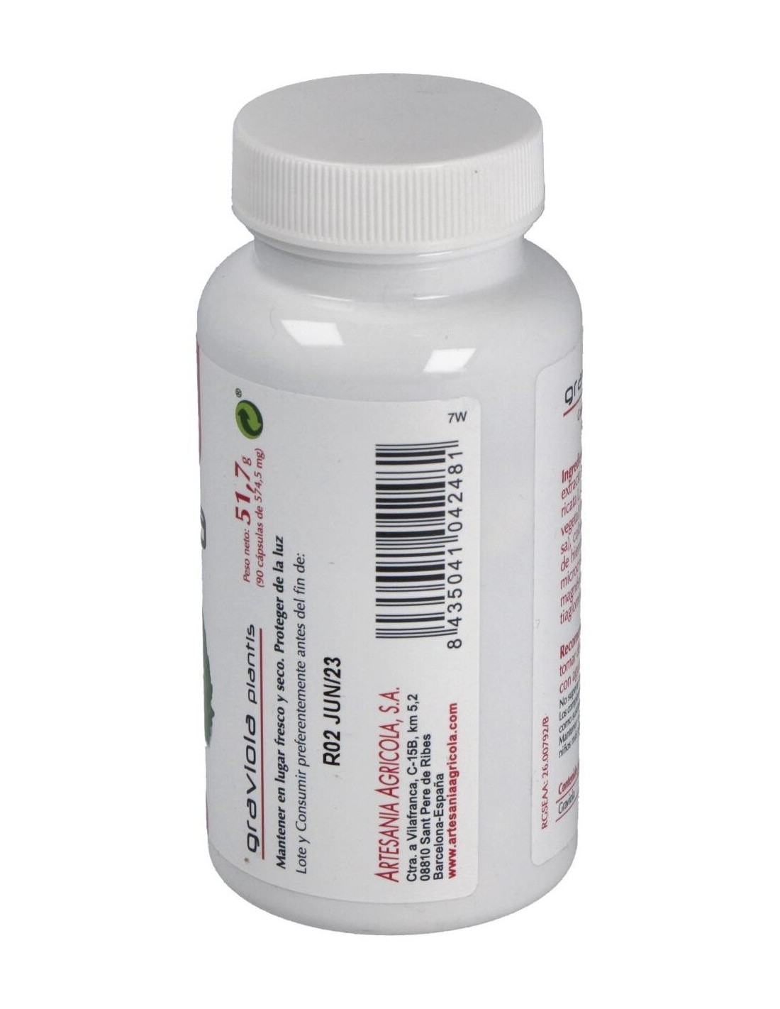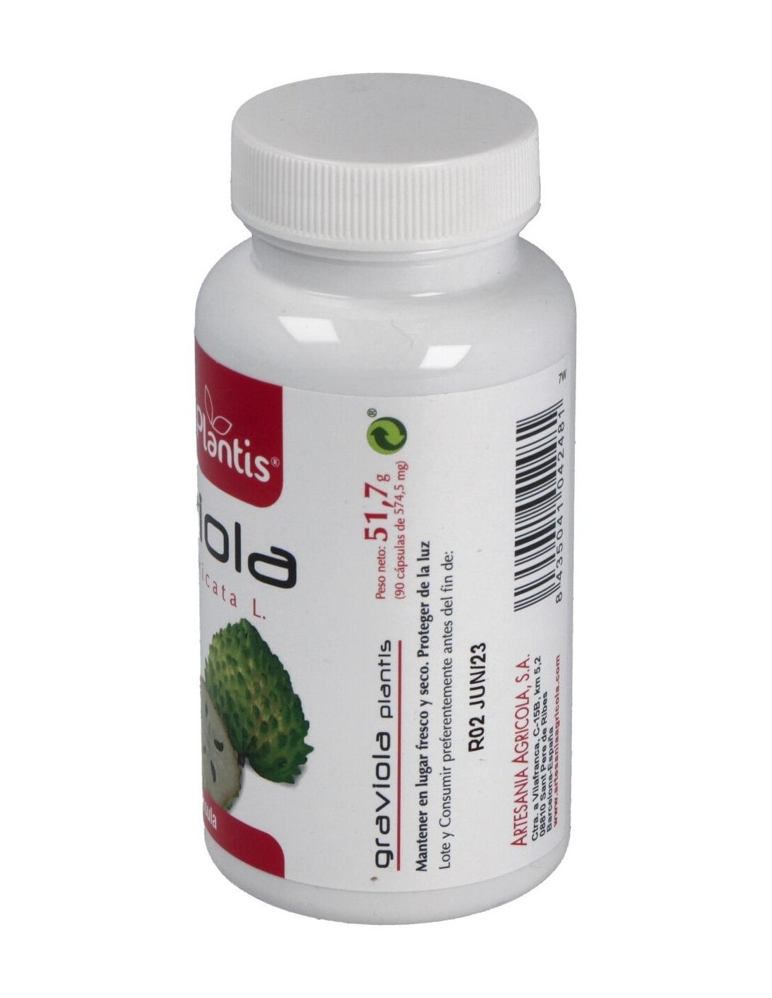 La graviola (Annona muricata) también conocida como guanabana es un árbol cuyo fruto es parecido a la chirimoya, su pulpa es blanda y de color blanco, su textura carnosa, cremosa y jugosa, su sabor es aromático y ácido. La graviola es rica en carbohidratos, fibra, potasio, sodio, magnesio, fósforo, hierro y vitamina C.La graviola se conoce desde el Perú prehispánico y se ha usado tradicionalmente en casos de diabetes, raquitismo, catarros, indigestión y parasitosis intestinal por sus propiedades astringentes, depurativas y digestivas.Más recientemente, diversas investigaciones han sacado a la luz que las hojas de Graviola tienen mayor riqueza en ácido ascórbico, ácido láctico y málico que el fruto como también una mayor cantidad de hierro, fósforo, calcio y vitaminas A, B1 y B.; sin embargo es su riqueza en acetogeninas, consideradas un principio activo anticancerígeno o citostatico, que ha abierto la posibilidad de su utilización como coadyuvante en tratamientos tumorales.Composición activa por cápsula:400 mg de graviola.Ingredientes:Extracto seco de hojas de Annona muricata L- Graviola (69.6%), cápsula vegetal [(hidroxipropil metil celulosa), colorante (óxidos e hidróxidos de hierro)], estabilizador (celulosa microcristalina); emulgente (sales magnésicas de ácidos grasos), antiaglomerante (dióxido de silicio).Modo de empleo:Tomar de 3 a 6 cápsulas al día, con agua.Presentación:Envase de 90 cápsulas.