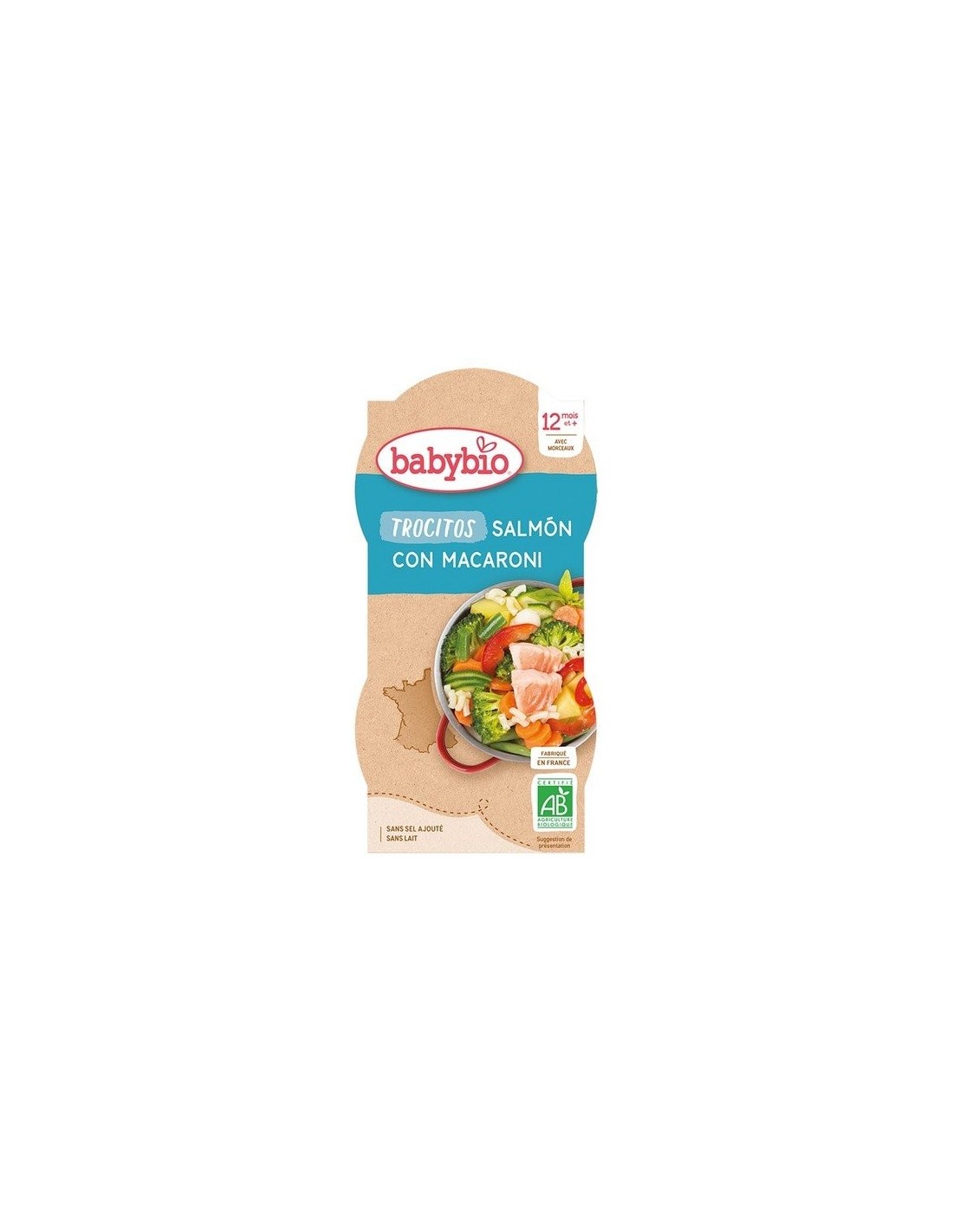 Disfruta de una comida nutritiva y deliciosa con el Menú de Día TROCITOS Salmón Macarrones 2x200g de BABYBIO. Ideal para los más pequeños, combina trocitos suaves de salmón con macarrones, ofreciendo un plato equilibrado y fácil de digerir. Elaborado con ingredientes naturales y de alta calidad, este menú aporta proteínas y energía para el crecimiento saludable de tu bebé. Perfecto para una comida rápida y completa, que cuida el sabor y la nutrición en cada bocado.