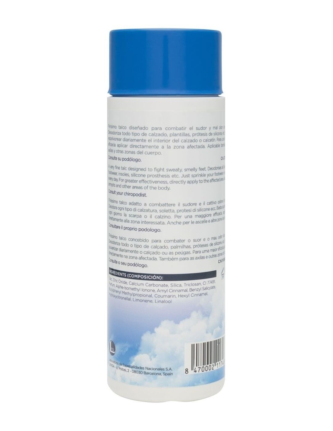 Talco que absorbe la humedad y evita el mal olor de pies. Desodoriza todo tipo de calzado, plantillas, prótesis de silicona, etc.; prolongando la duración de estos materiales. Evita irritaciones mecánicas por lo que es muy recomendado para calzado deportivo. Indicado para hiperhidrosis y bromhidrosis. Para desodorizar cualquier tipo de calzado, plantillas o prótesis de silicona. Recomendado para todo tipo de pieles y edades (incluido los niños).