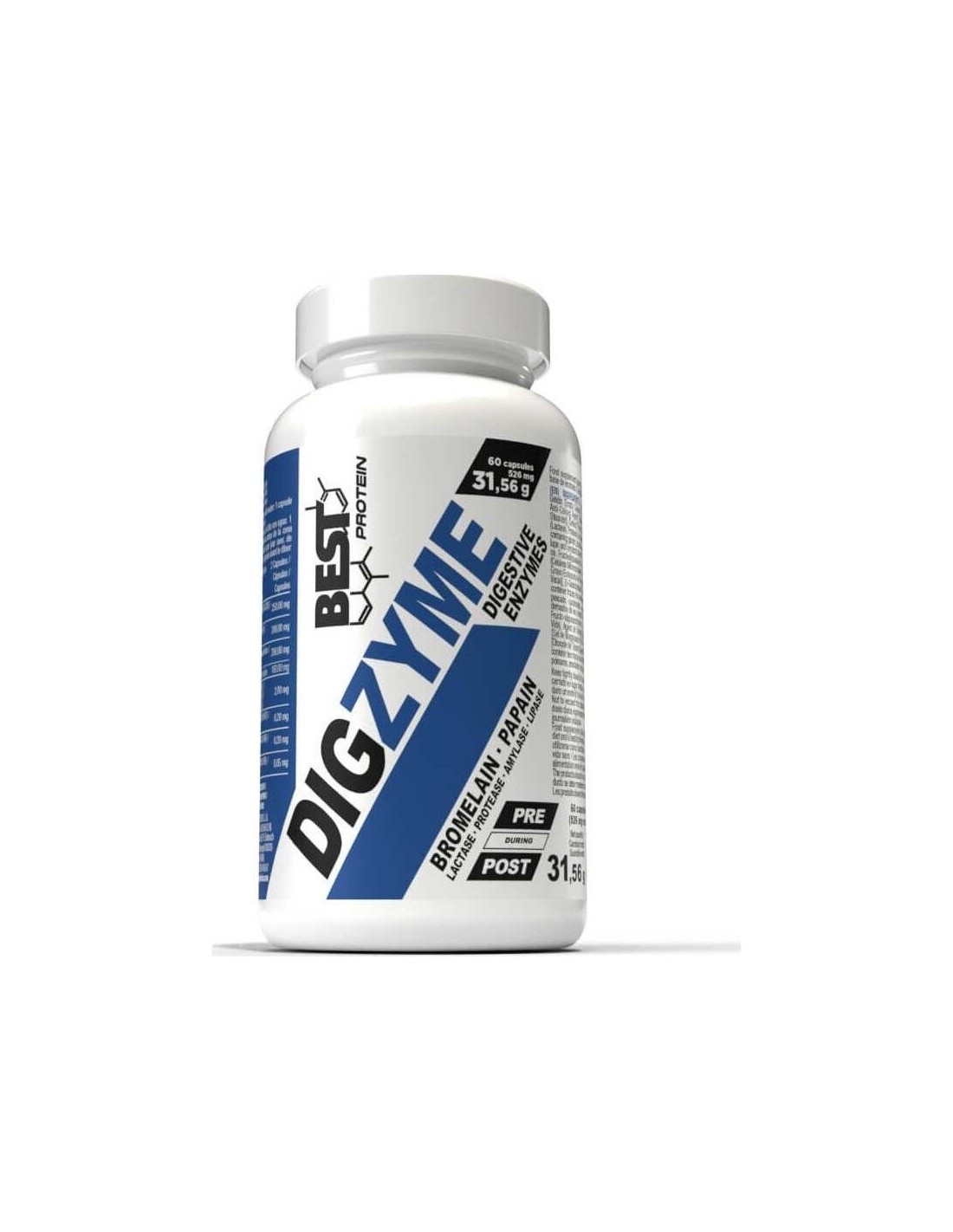 Complemento alimenticio a base de enzimas. Contiene bromelaína, papaína, prebióticos y diversas enzimas digestivas que pueden contribuir al aumento de la asimilación de nutrientes y a la normal recuperación muscular. DIGZYME es el complemento ideal para aquellas personas que padecen de malabsorción o sufren de malas digestiones.