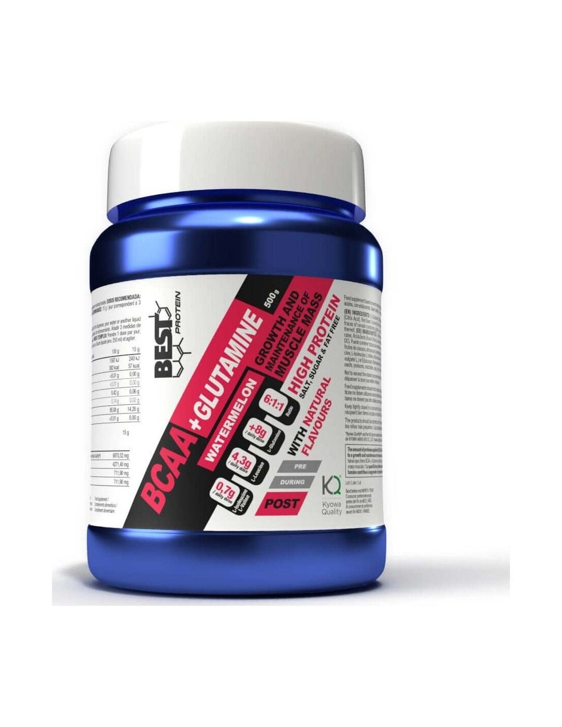 BCAA + GLUTAMINE 6.1.1 es un producto con una combinación de aminoácidos ramificados y glutamina. Todos estos aminoácidos son esenciales en el anabolismo proteico y el retraso de la aparición de la fatiga, que ayuda a mantenr la intensidad del ejercicio.