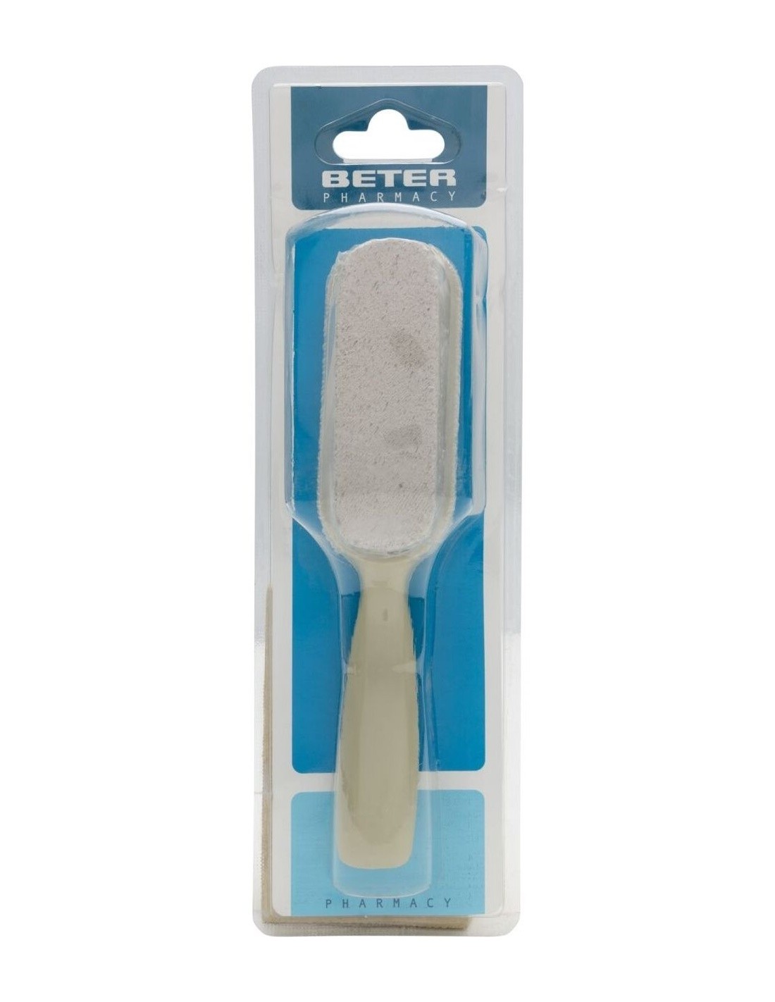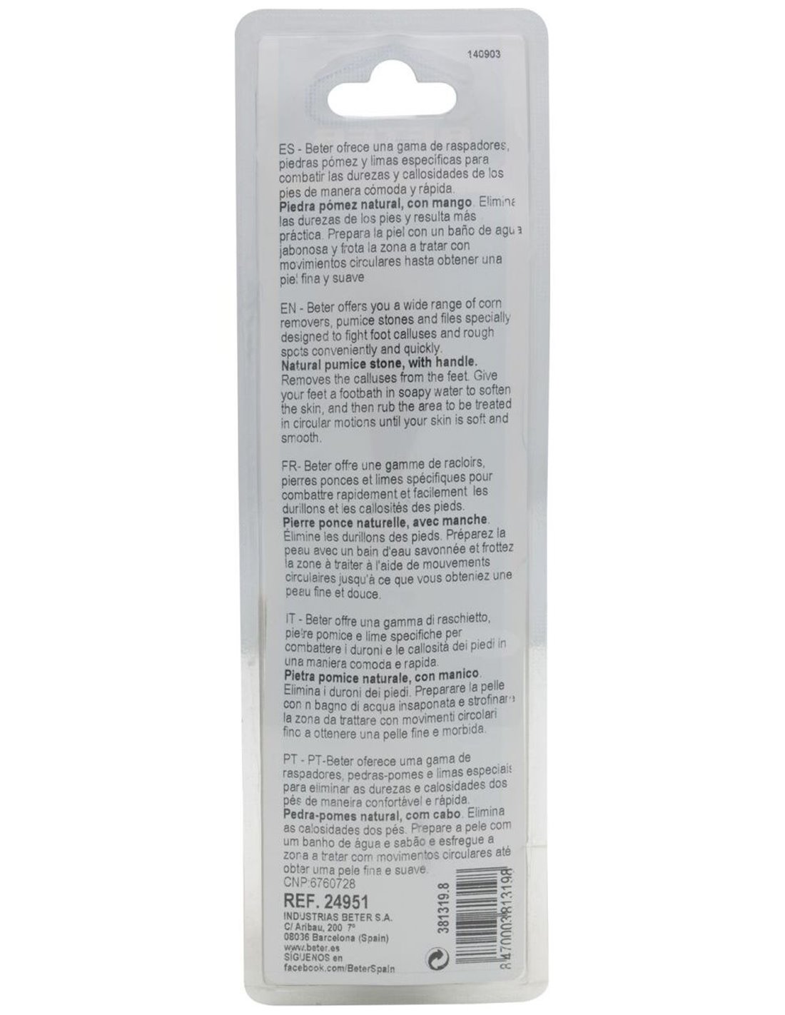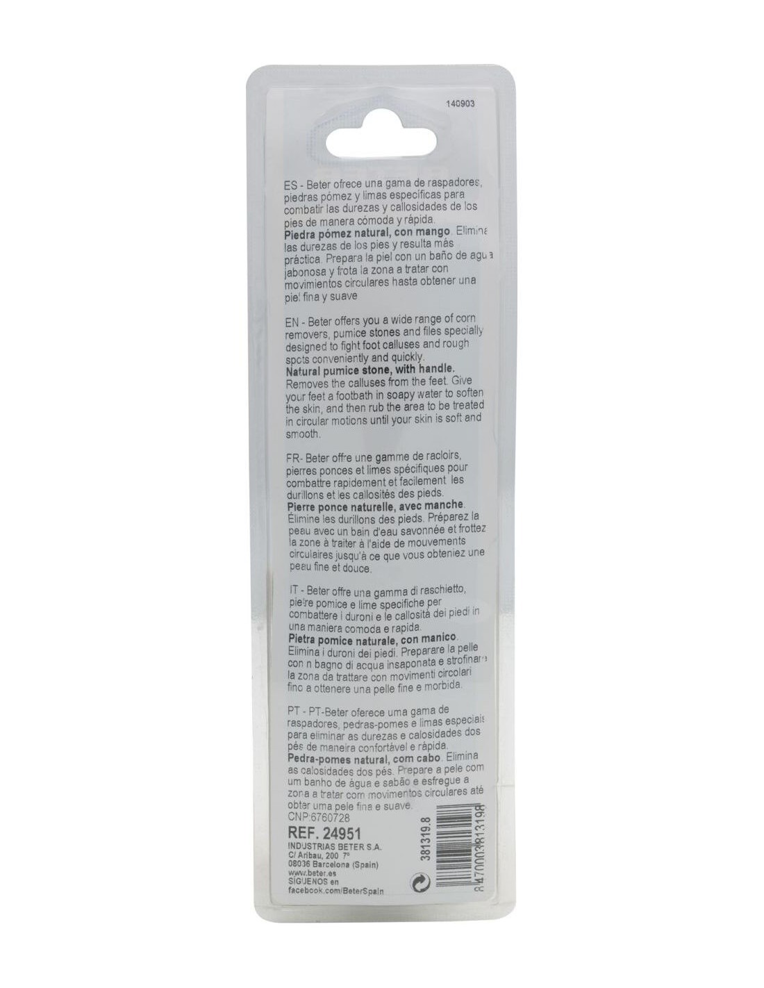 "DescripciónBETER | Beter piedra pómez natural con mango 17cmSeguramente habrás oído hablar de los tratamientos de piedra pómez para las durezas y sequedad de los pies.La piedra pómez natural con mango de Beter reduce de forma rápida y práctica las durezas que se generan en los pies.