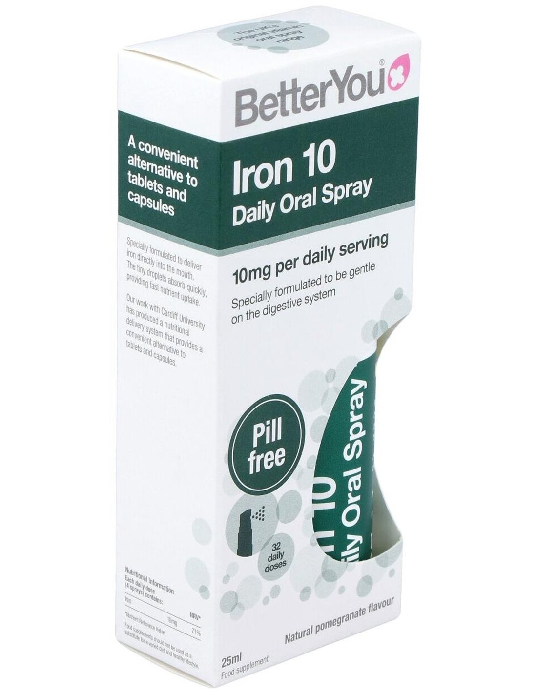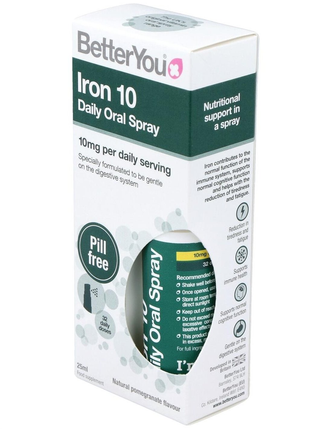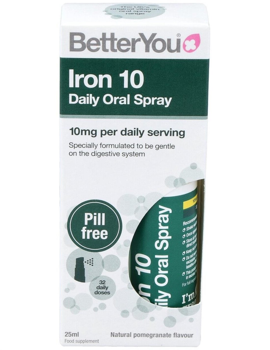 Iron 10 Hierro Spray Oral 25 ml de BETTER YOU es una forma práctica y rápida de aportar hierro a tu organismo. Su fórmula en spray facilita la absorción y es ideal para quienes buscan un suplemento sin pastillas. Perfecto para mantener niveles óptimos de hierro, ayuda a combatir la fatiga y mejora la energía diaria. Su presentación compacta lo hace fácil de llevar a cualquier lugar. Una solución efectiva y cómoda para cuidar tu salud con la calidad de BETTER YOU.