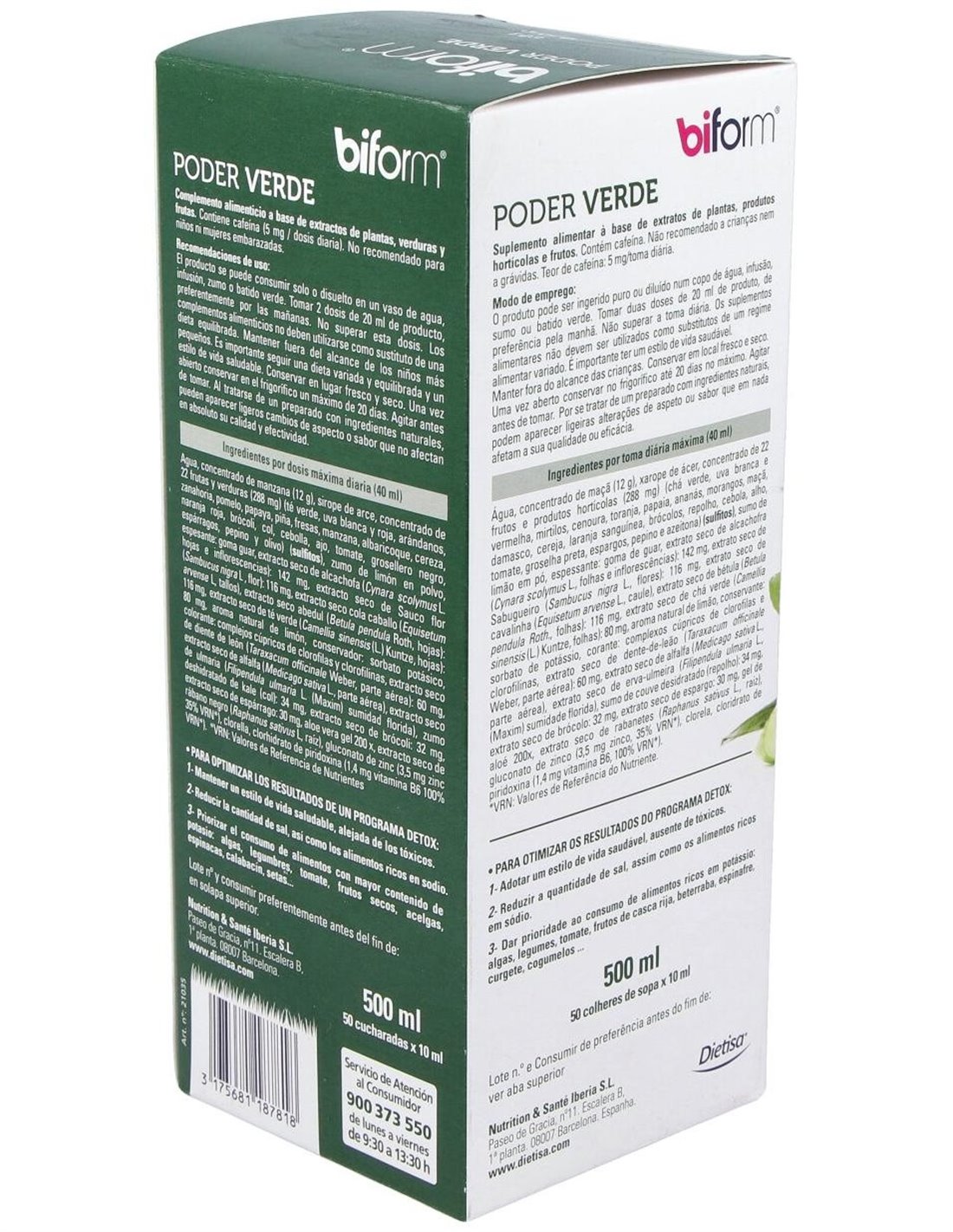 Biform Poder Verde 500ml es un complemento alimenticio que contribuye a adelgazar y eliminar los líquidos retenidos en el cuerpo.Sirve de ayuda en dietas de adelgazamiento y para depurar el organismo, sobre todo para personas que necesitan realizar dietas hipocalóricas.