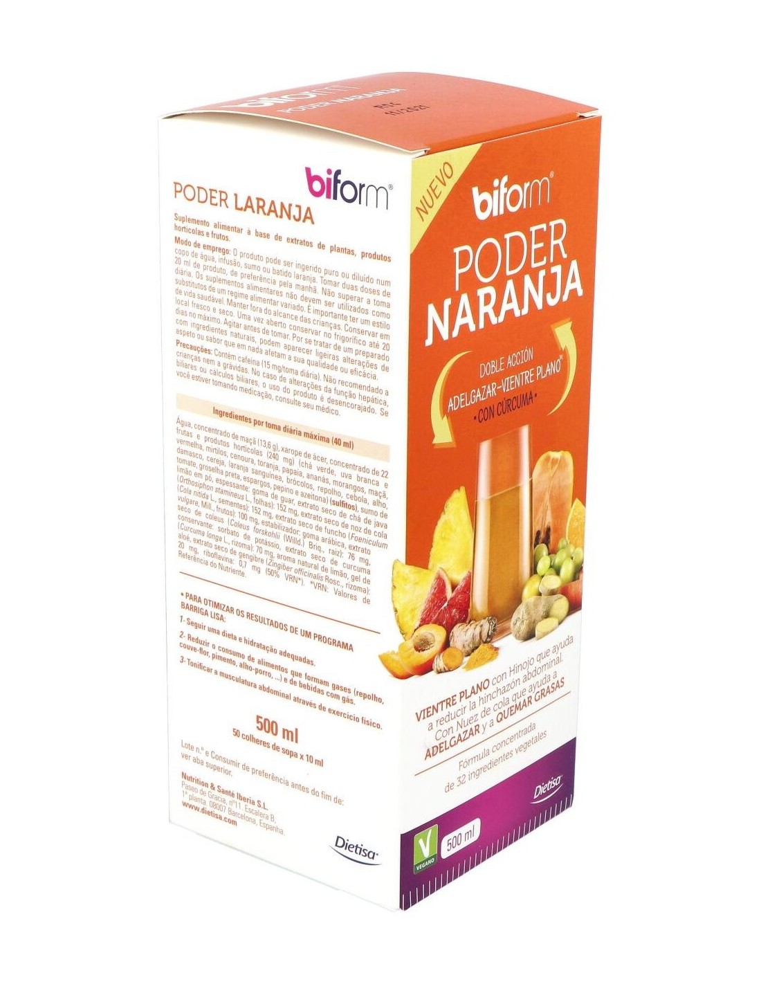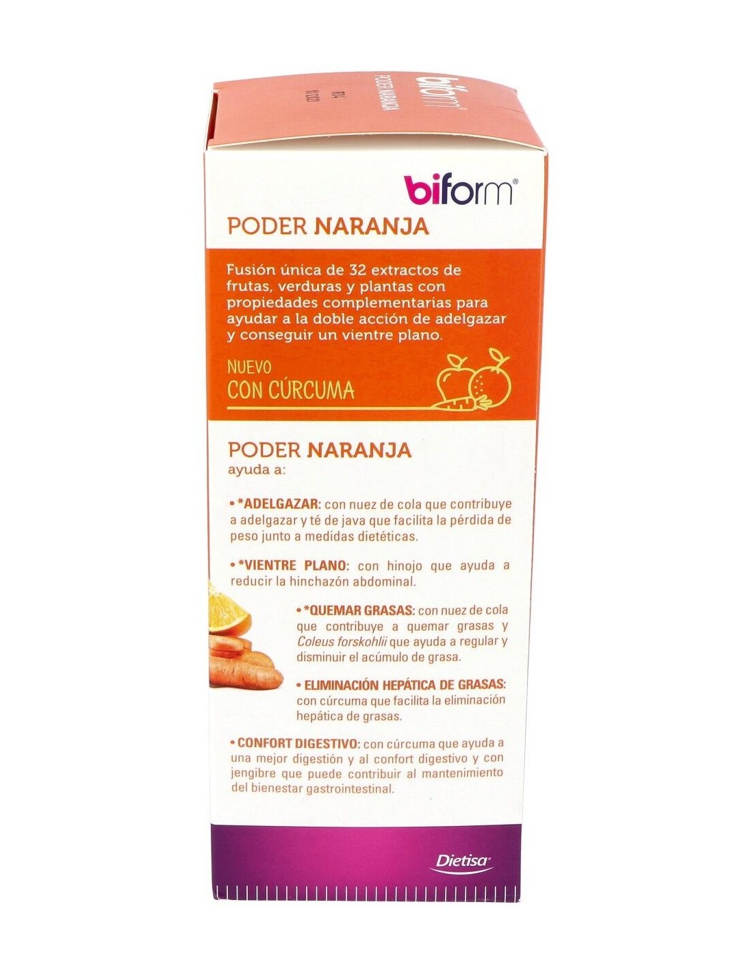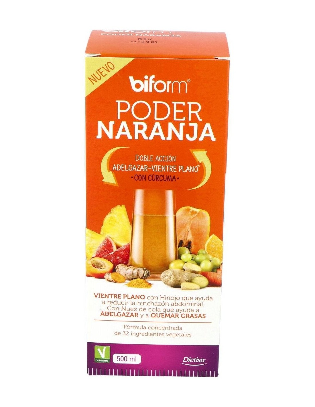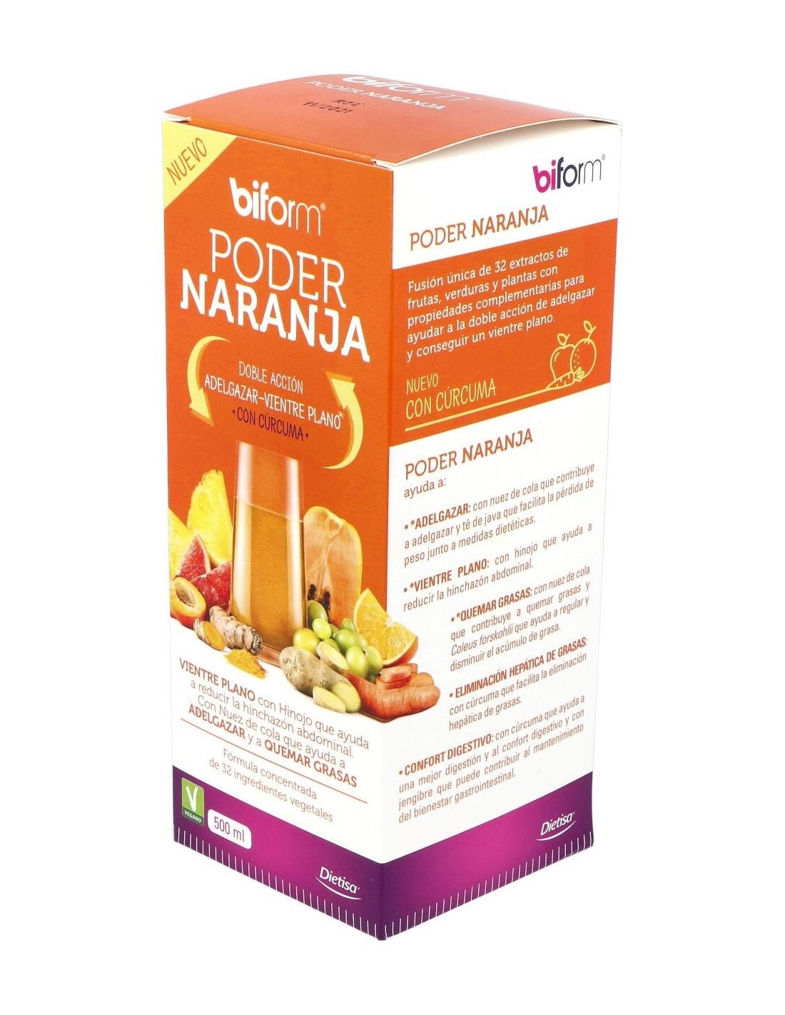 Dietisa Biform Poder Naranja 500ml es un complemento alimenticio indicado para ayudar a quemar grasas.Con ingredientes naturales, contiene té verde, uva blanca y roja, arándanos, zanahoria, pomelo, papaya, piña, fresas, manzana, albaricoque, cereza, naranja roja, brócoli, col, cebolla, ajo, tomate, grosellero negro, espárragos, pepino y olivo.