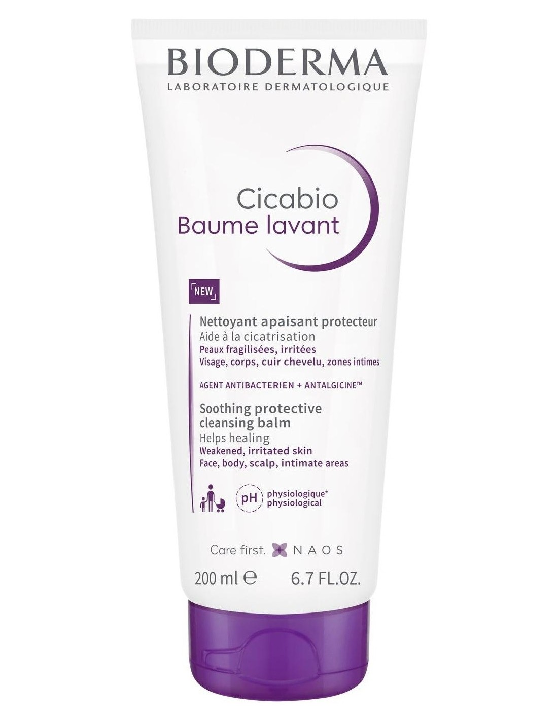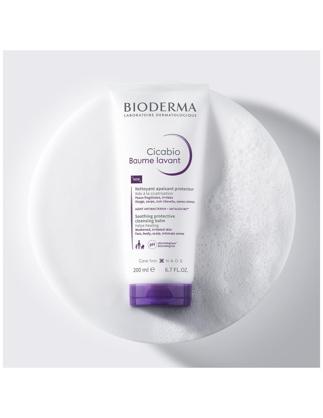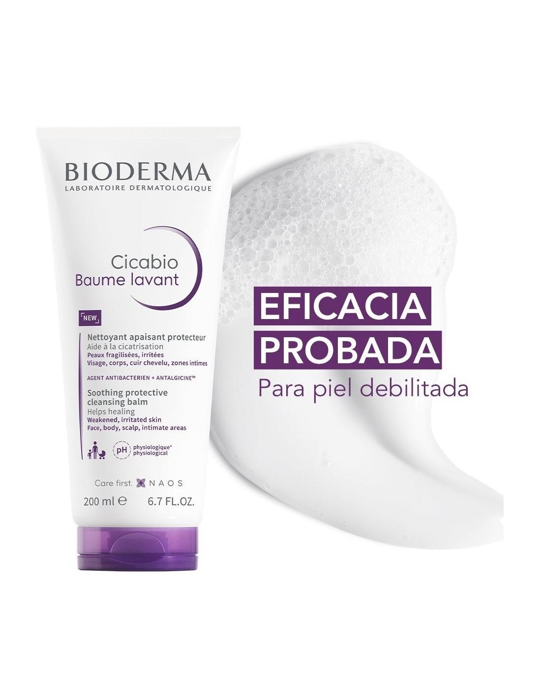 Cicabio Baume lavant es una higiene purificante y calmante en textura bálsamo especialmente concebida para todas las pieles fragilizadas con el fin de ayudar en la reparación cutánea desde la fase de higiene:\ 1. Limpia suavemente la piel gracias a un agente antimicrobiano y tensioactivos suaves. Las impurezas se eliminan para prevenir el riesgo de infección, contribuyendo a mejorar el proceso natural de cicatrización.\ 2. Calma la piel debilitada y proporciona una limpieza suave gracias a su textura de bálsamo antifricción que contiene Antalgicine(), inspirado en un ingrediente calmante presente de forma natural en el organismo. Las molestias y la sensación de picor se reducen. La limpieza diaria de la piel débil se vuelve cómoda y fácil.\ 3. Protege la piel gracias a los lípidos biomiméticos aportados por el aceite de karité y el escualeno.\ 4. Hidrata la piel gracias a un agente humectante, inspirado en los presentes de forma natural en la piel. La zona debilitada se mantiene en un entorno húmedo para favorecer la reparación.