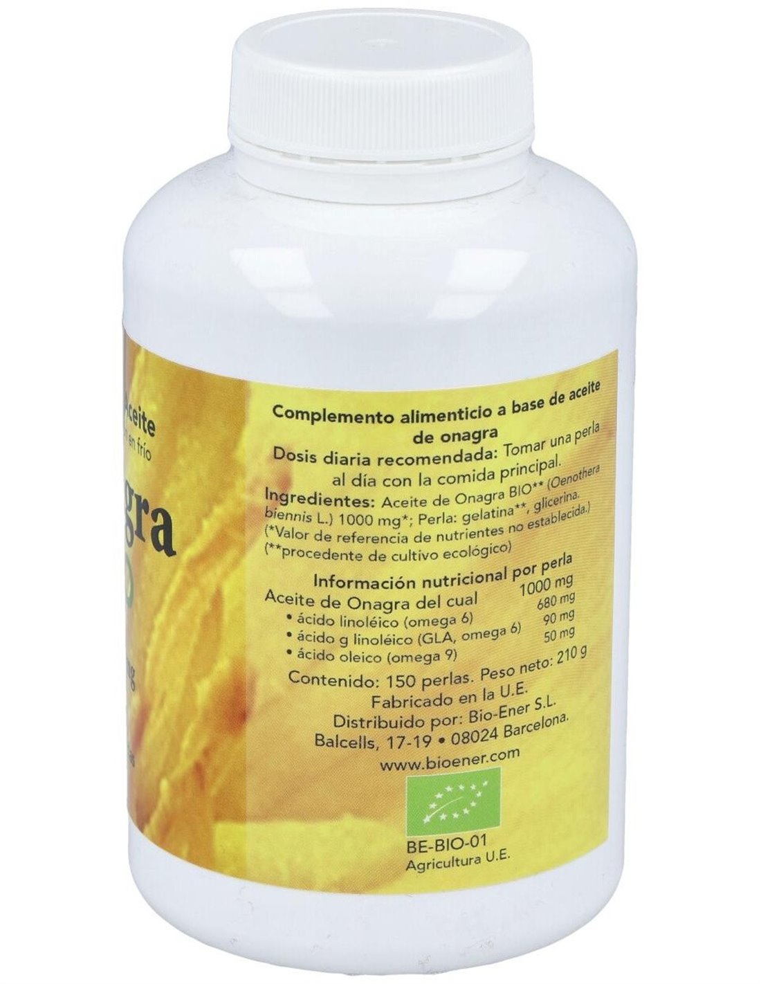 Aceite de Onagra 1000 mg en presentación de 150 perlas de BIOENER, un suplemento natural que ayuda a mantener el equilibrio hormonal y el bienestar general. Rico en ácidos grasos esenciales, contribuye a la salud de la piel, reduce molestias premenstruales y favorece la función cardiovascular. Fácil de consumir y de alta calidad, es una opción ideal para quienes buscan cuidar su cuerpo de forma natural y efectiva. Perfecto para complementar tu rutina diaria de salud y vitalidad.