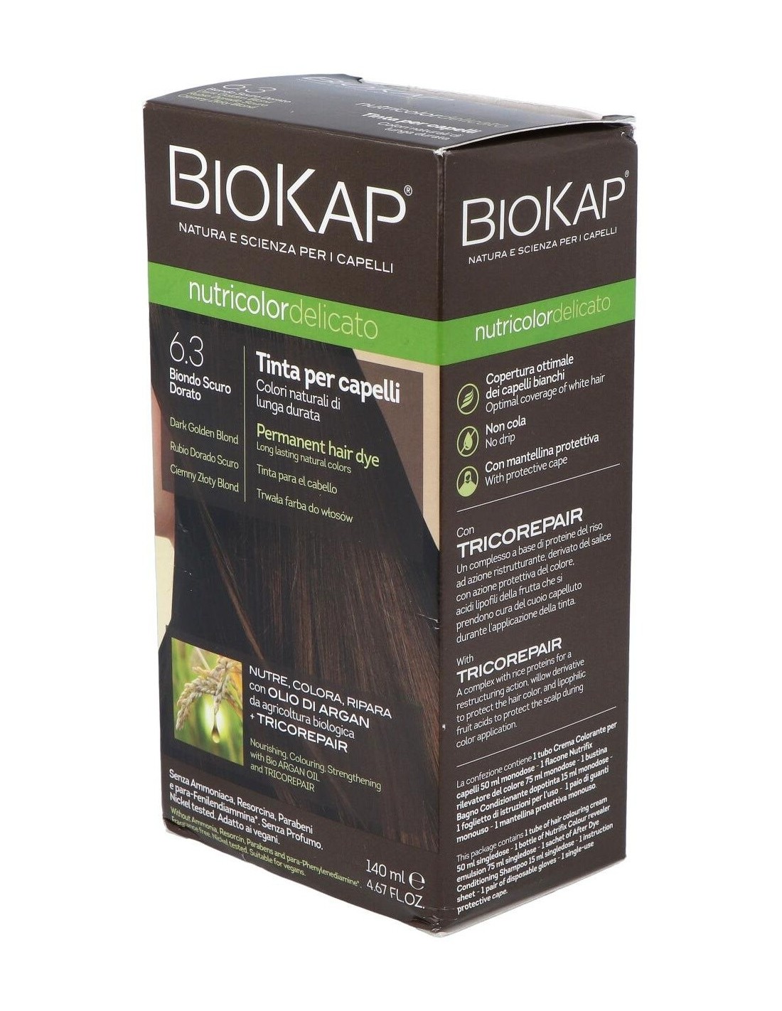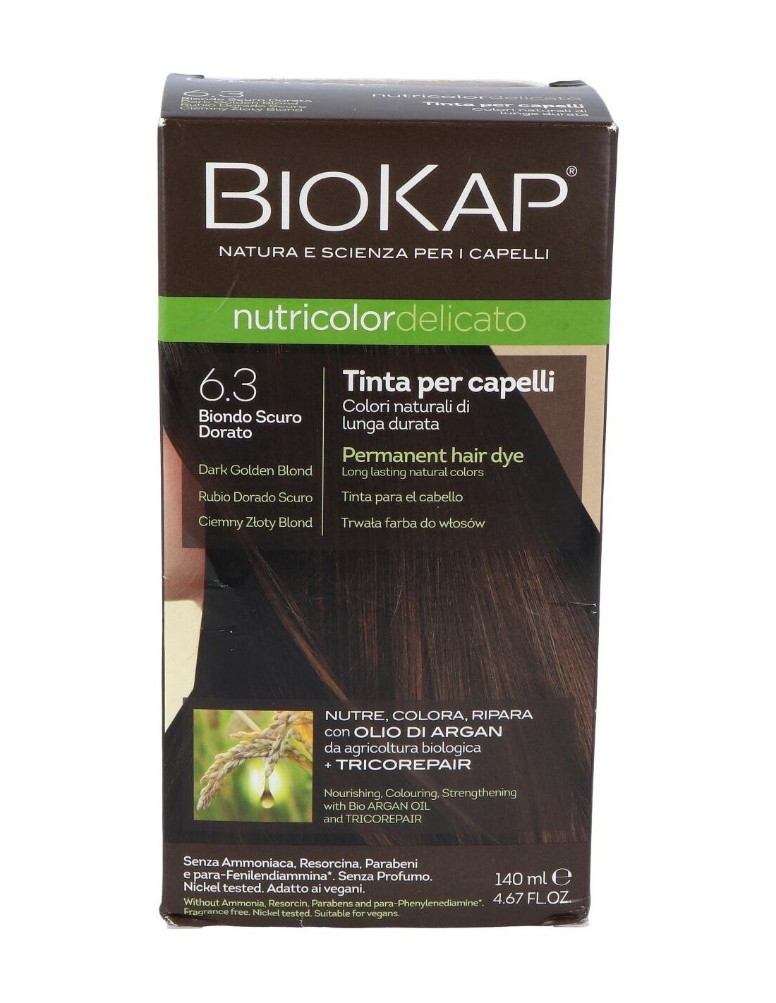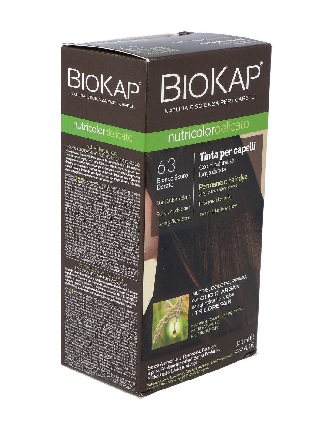 El Delicato 6.30 Rubio Dorado Oscur 140 ml de Biokap es una tintura capilar para quienes buscan un tono rubio dorado oscuro, formulada para aportar color uniforme y cuidado al cabello.