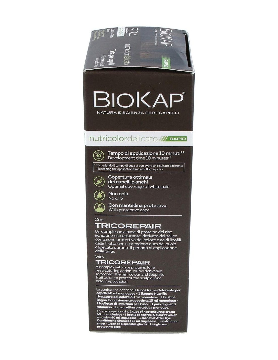 El Rapid delicato 5,34 Castaño Miel de Biokap es un tinte capilar para quienes buscan un color castaño miel natural, formulado con ingredientes que cuidan el cabello durante el proceso de coloración.