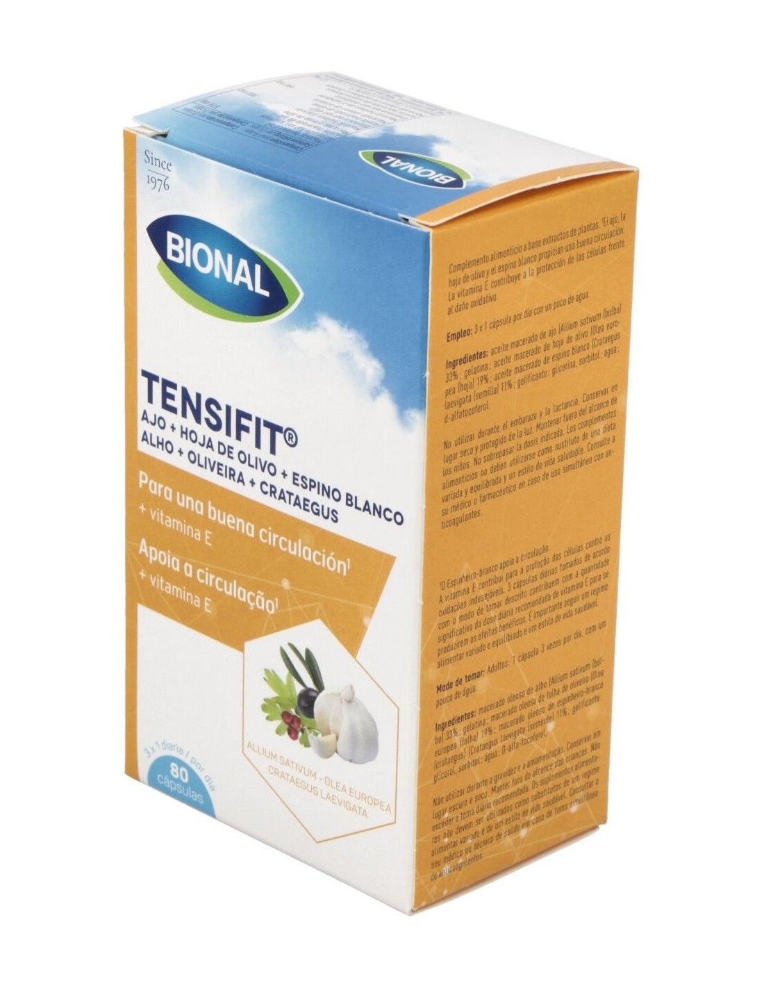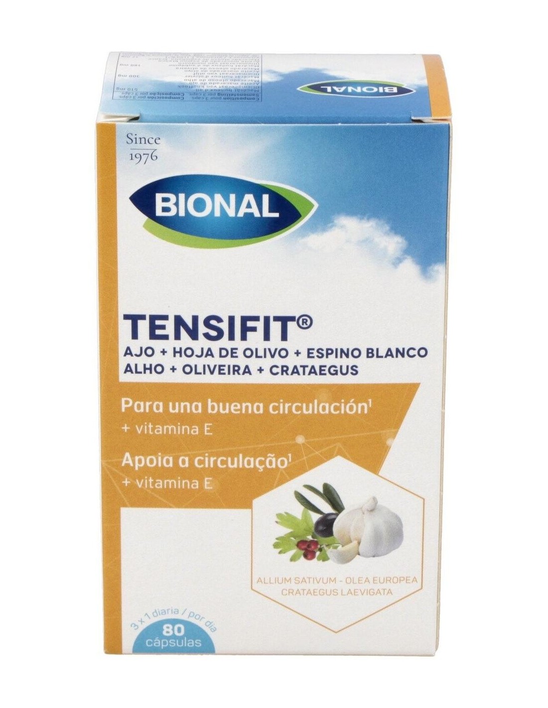 Tensifit Xtra (Ajo+Olivo+Espino Blanco) 80Cap. de Bional es un suplemento natural para adultos que contribuye al bienestar cardiovascular mediante una fórmula combinada de ajo, olivo y espino blanco.
