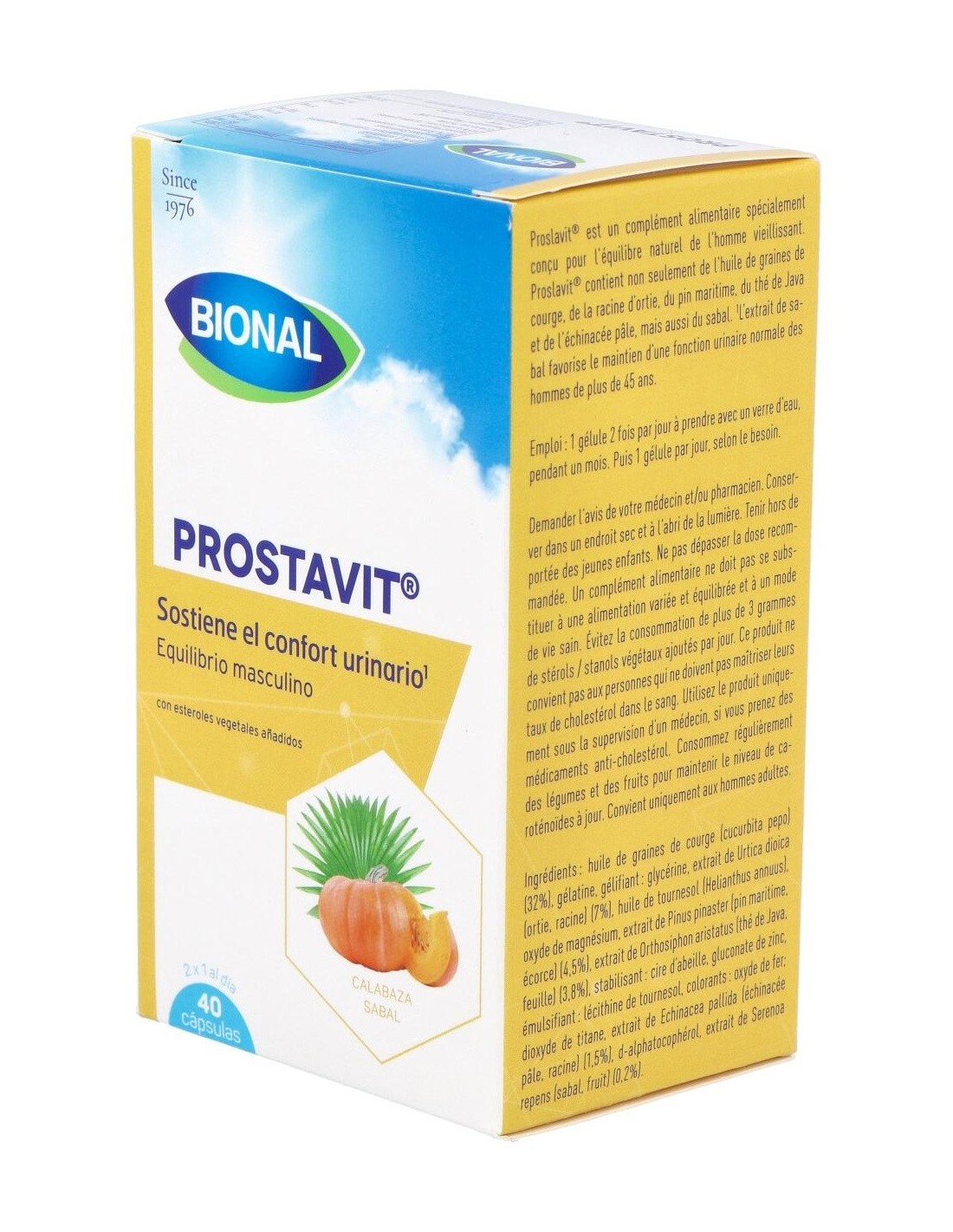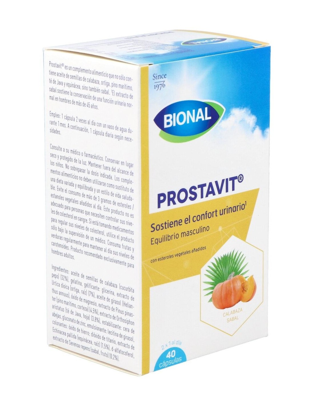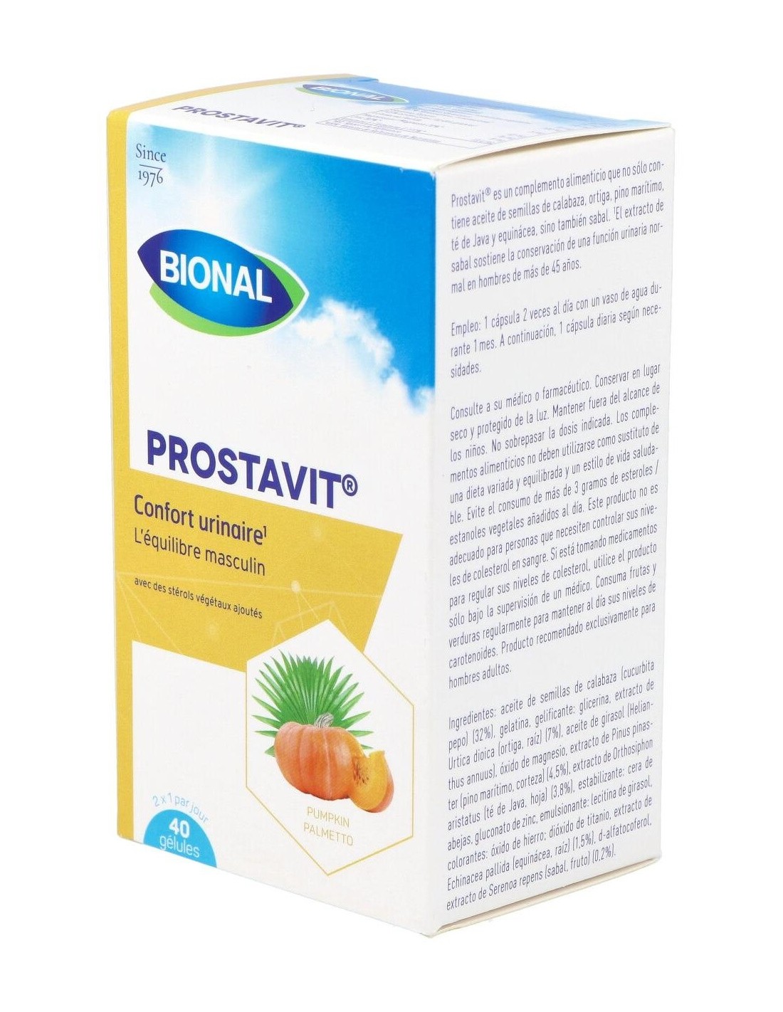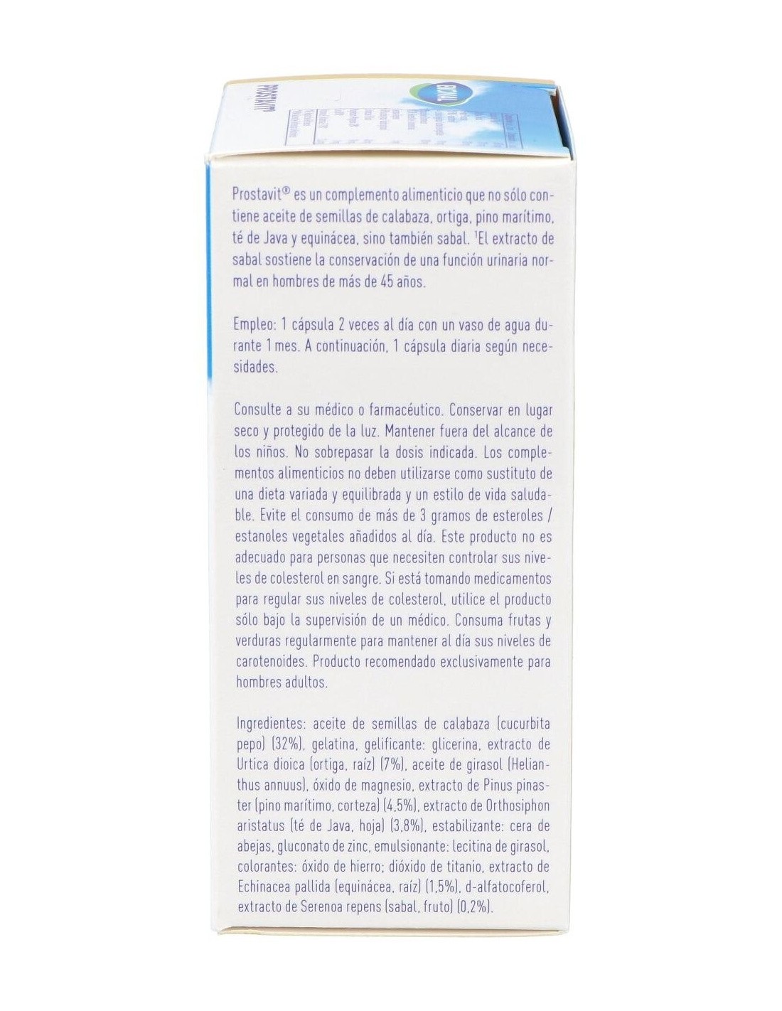Ingredientes:Aceite de semillas de calabaza (32%); gelatina; gelificante: glicerina; extracto de ortiga (7%); aceite de girasol; óxido de magnesio; extracto de pino marítimo (4,5%); extracto de té de Java (3,8%); estabilizante: cera de abejas; gluconato de zinc; emulsionante: lecitina de girasol; colorantes: óxido de hierro, dióxido de titanio; extracto de equinácea (1,5%); d-alfatocoferol; extracto de sabal (0,2%). Modo de empleo:Tomar 1 cápsula 2 veces al día. Presentación:Envase de 40 cápsulas.