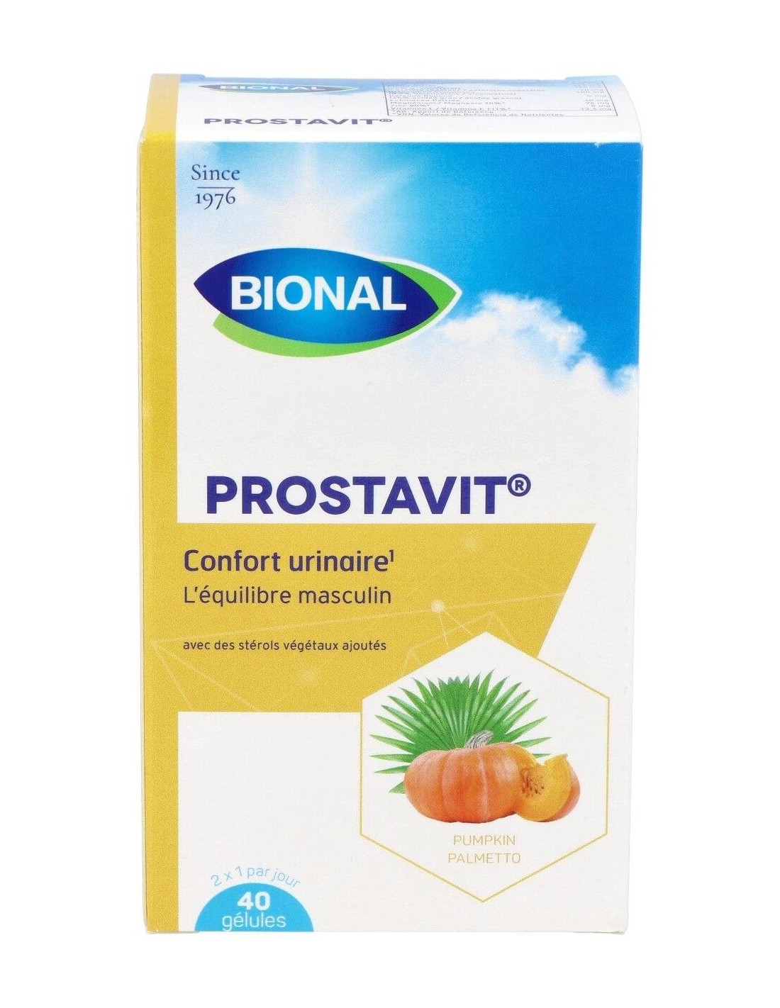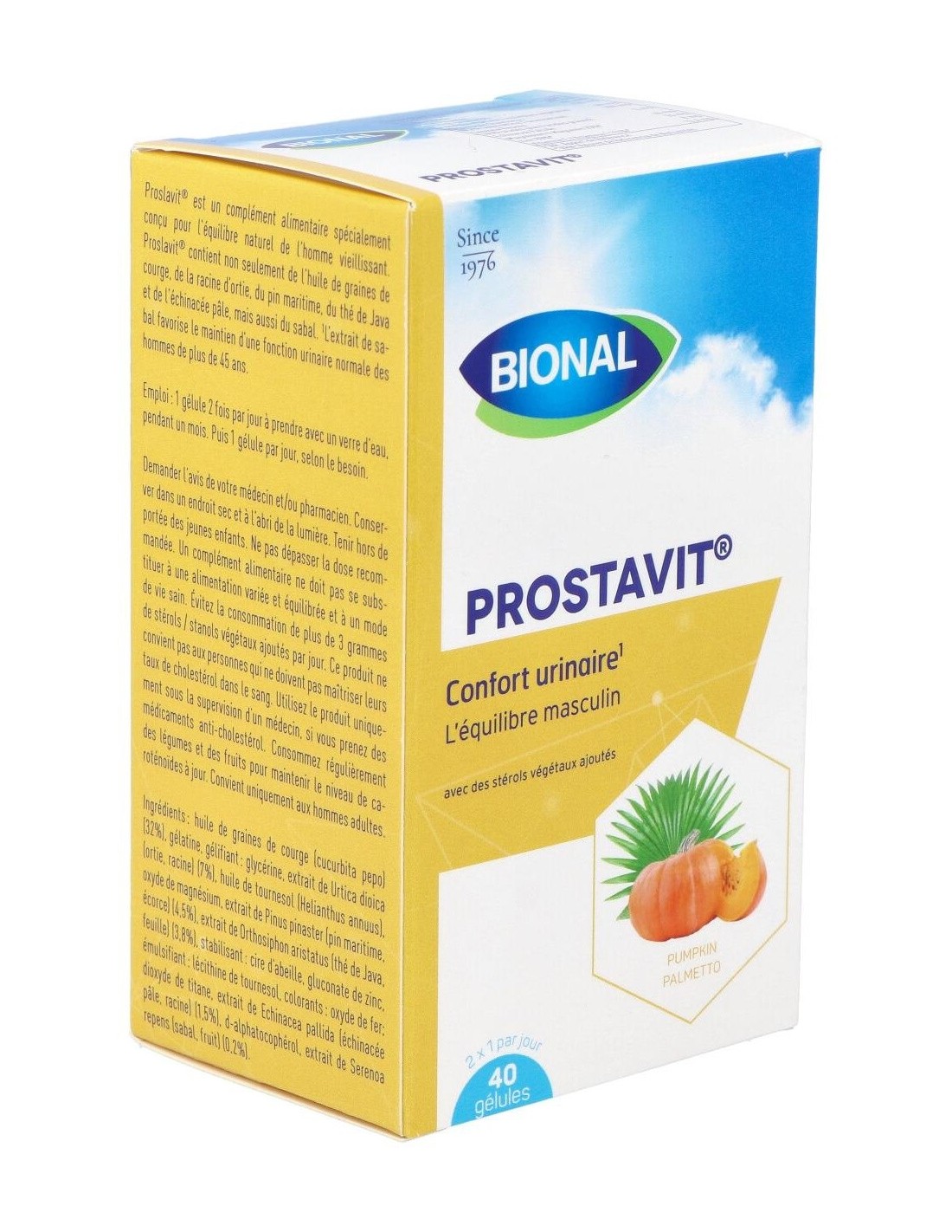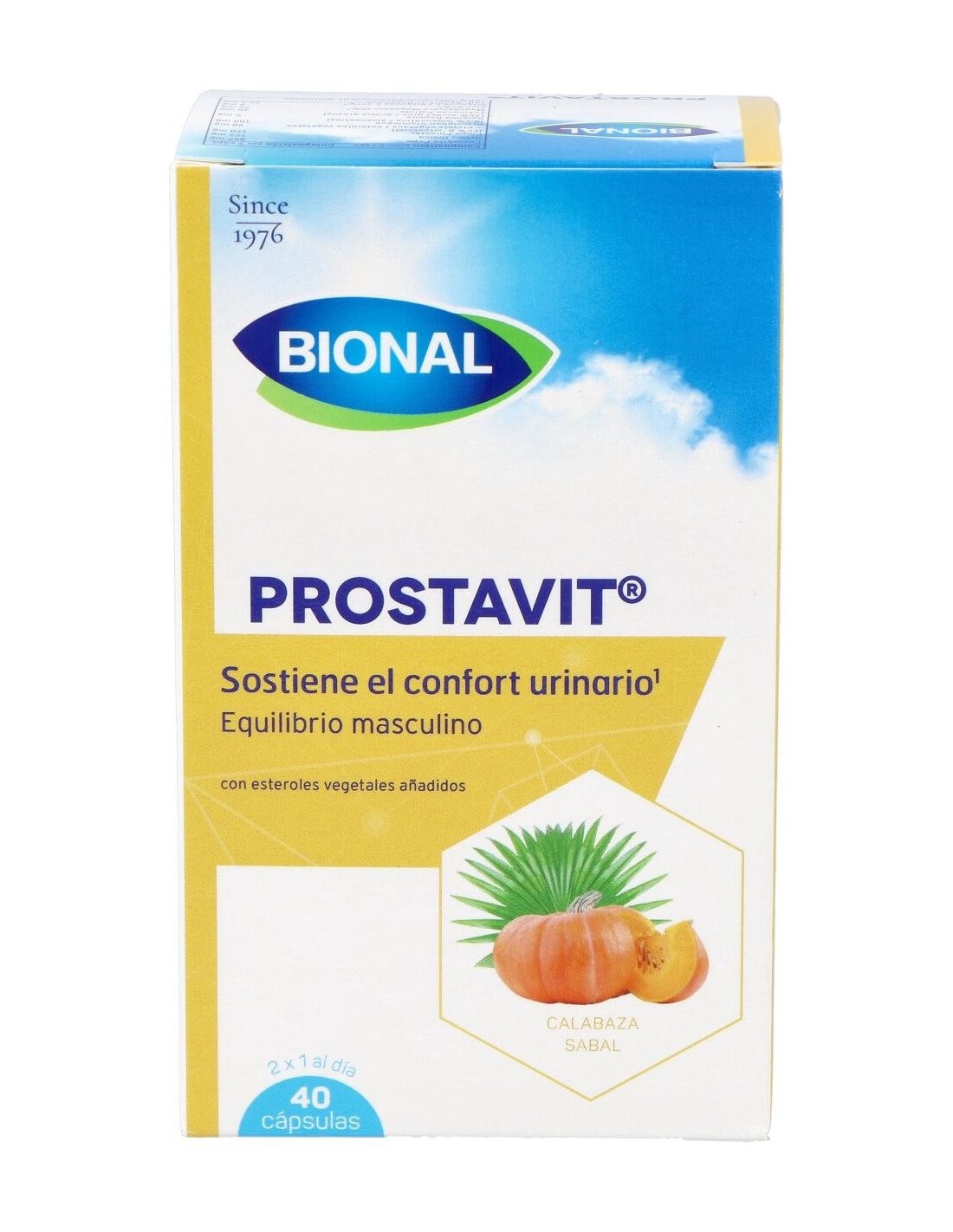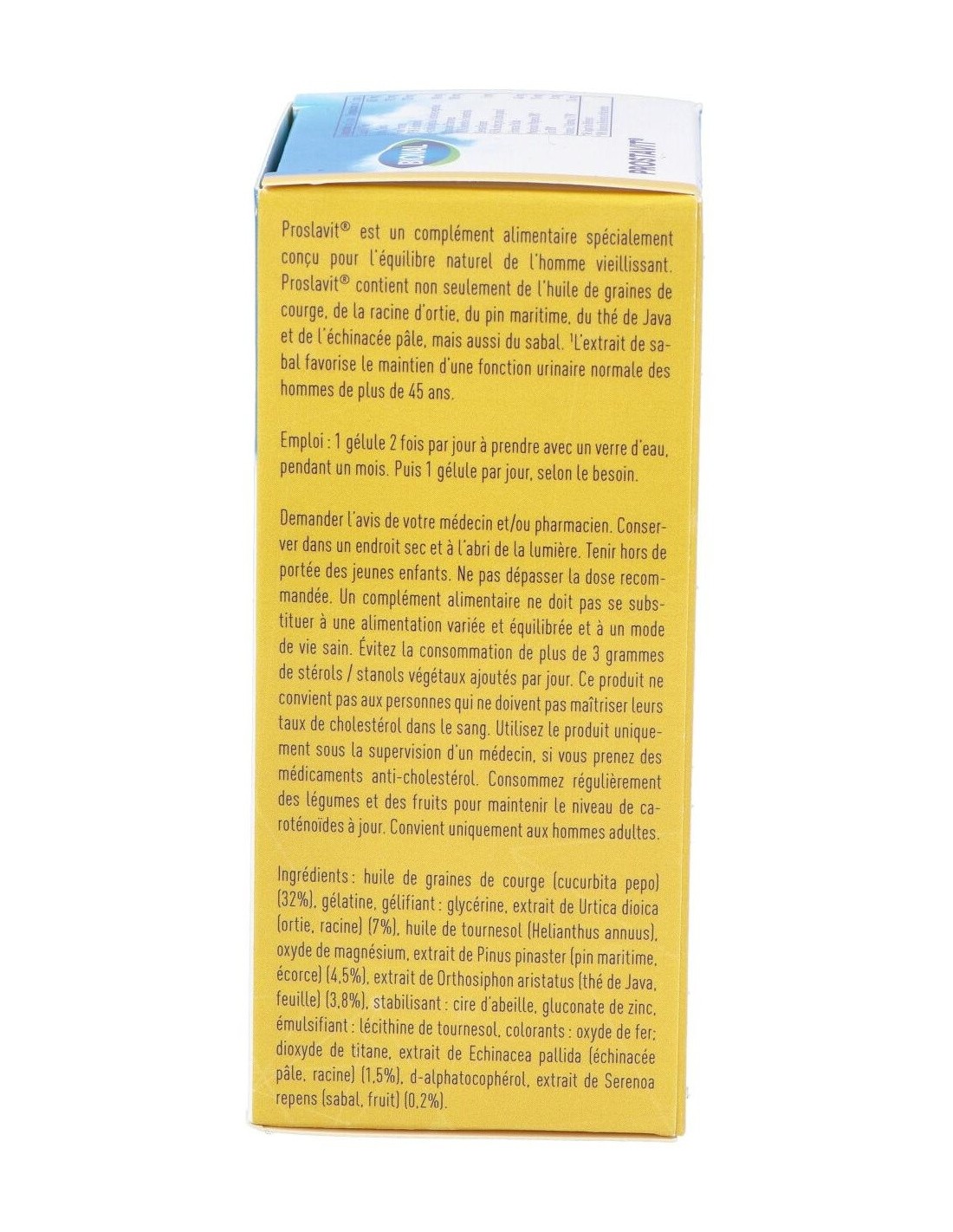 Ingredientes:Aceite de semillas de calabaza (32%); gelatina; gelificante: glicerina; extracto de ortiga (7%); aceite de girasol; óxido de magnesio; extracto de pino marítimo (4,5%); extracto de té de Java (3,8%); estabilizante: cera de abejas; gluconato de zinc; emulsionante: lecitina de girasol; colorantes: óxido de hierro, dióxido de titanio; extracto de equinácea (1,5%); d-alfatocoferol; extracto de sabal (0,2%). Modo de empleo:Tomar 1 cápsula 2 veces al día. Presentación:Envase de 40 cápsulas.