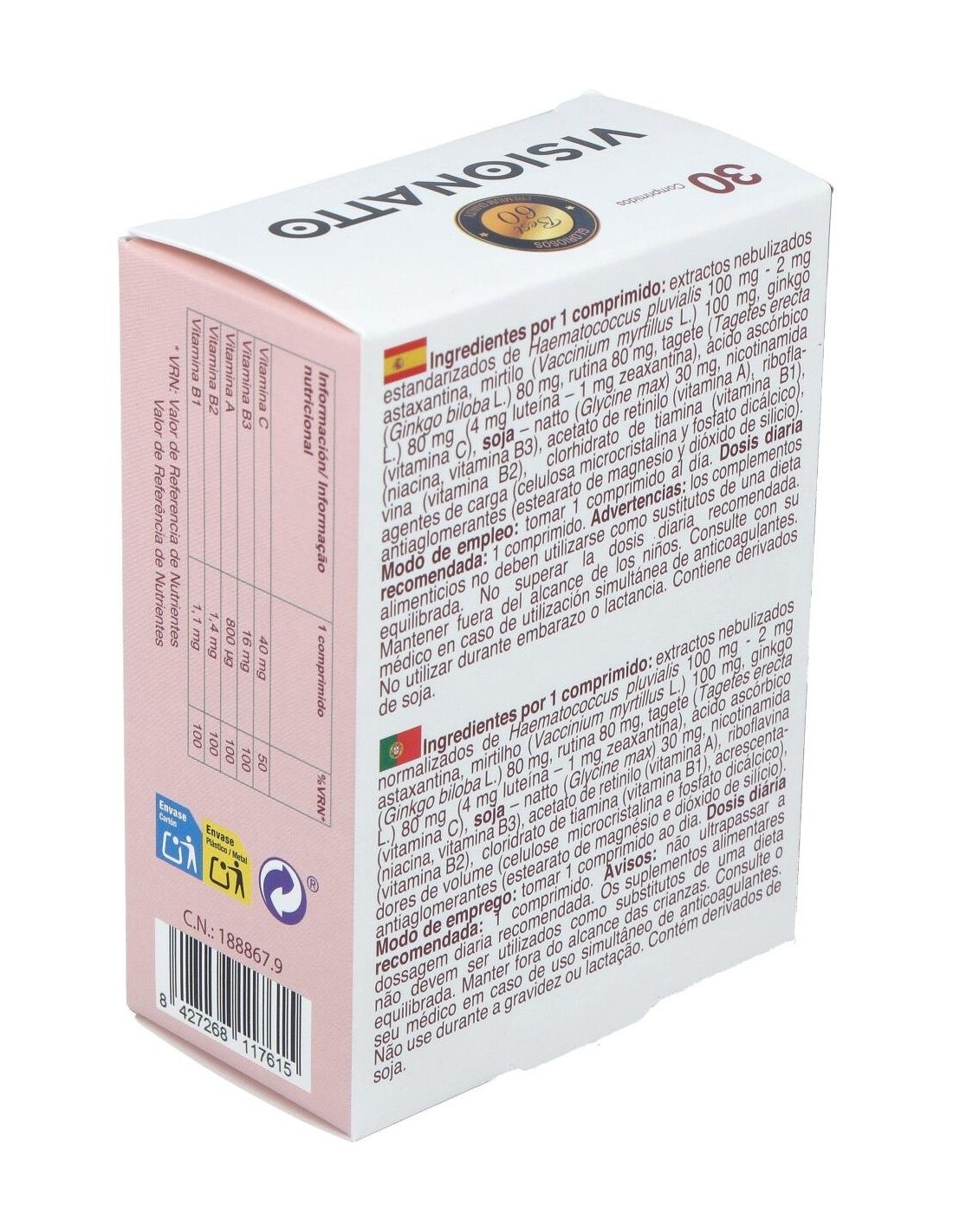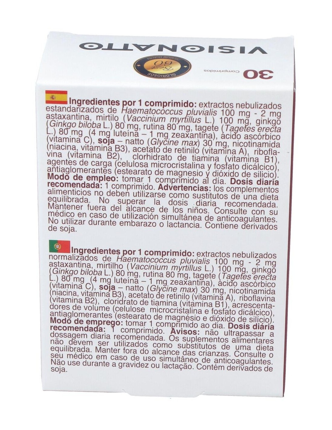 Ingredientes:Extractos nebulizados estandarizados de Haematococcus pluvialis 100 mg - 2 mg astaxantina, mirtilo (Vaccinium myrtillus L.) 100 mg, ginkgo (Ginkgo biloba L.) 80 mg, rutina 80 mg, tagete (Tagetes erecta L.) 80 mg (4 mg luteína 1 mg zeaxantina), ácido ascórbico (vitamina C), soja natto (Glycine max) 30 mg, nicotinamida (niacina, vitamina B3), acetato de retinilo (vitamina A), riboflavina (vitamina B2), clorhidrato de tiamina (vitamina B1), agentes de carga (celulosa microcristalina y fosfato dicálcico), antiaglomerantes (estearato de magnesio y dióxido de silicio).Modo de empleo:Tomar 2 cápsulas al día. Presentación:Envase de 30 comprimidos.Recomendaciones y advertencias:No contiene: gluten, crustáceos, frutos de cáscara, huevos, pescado y cacahuetes.