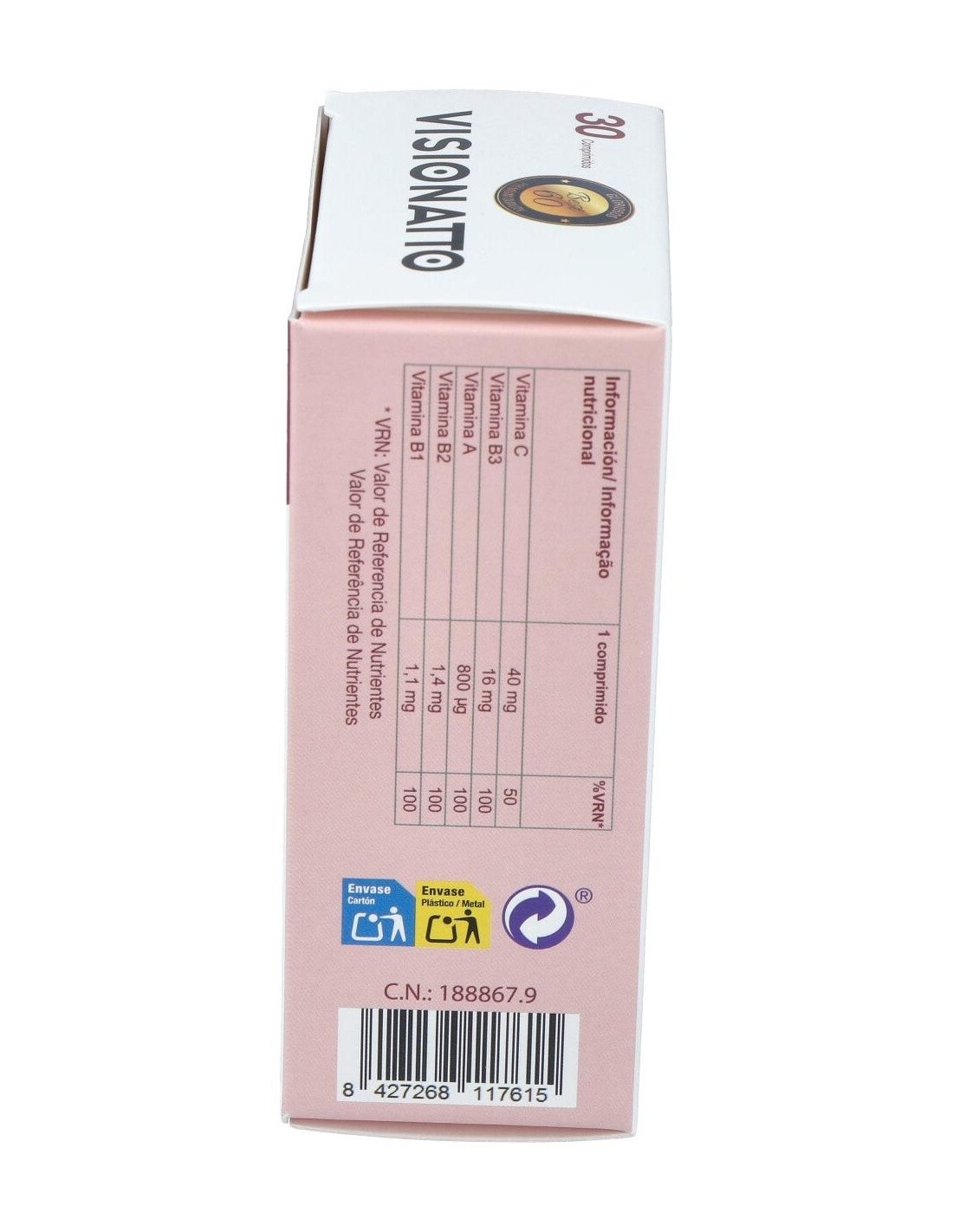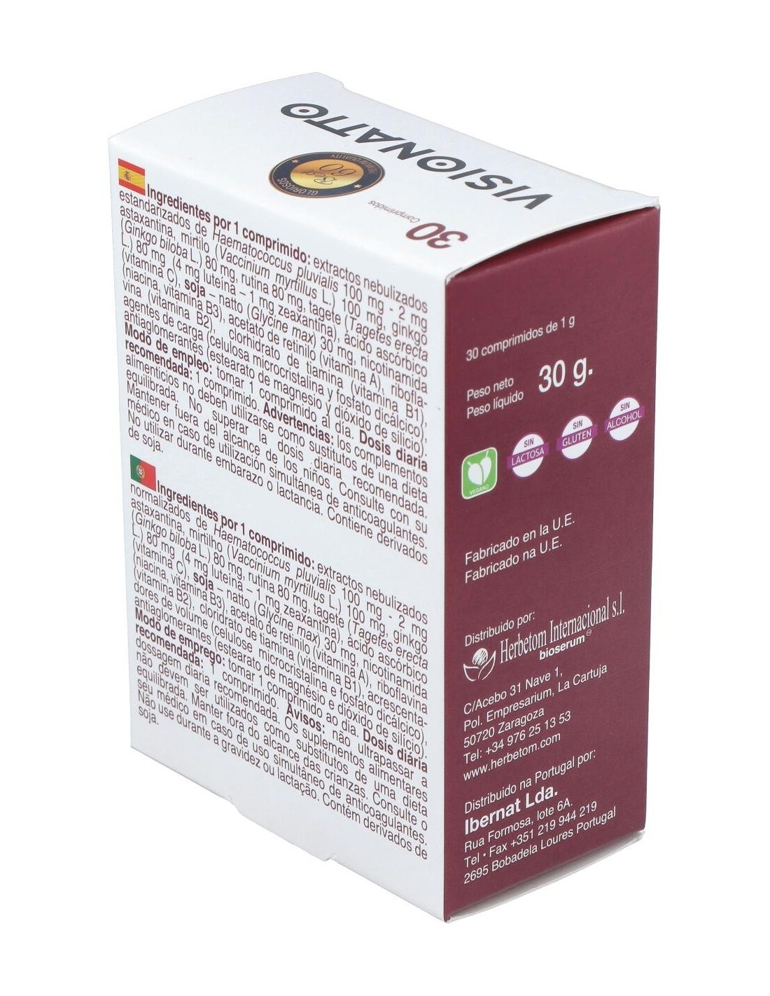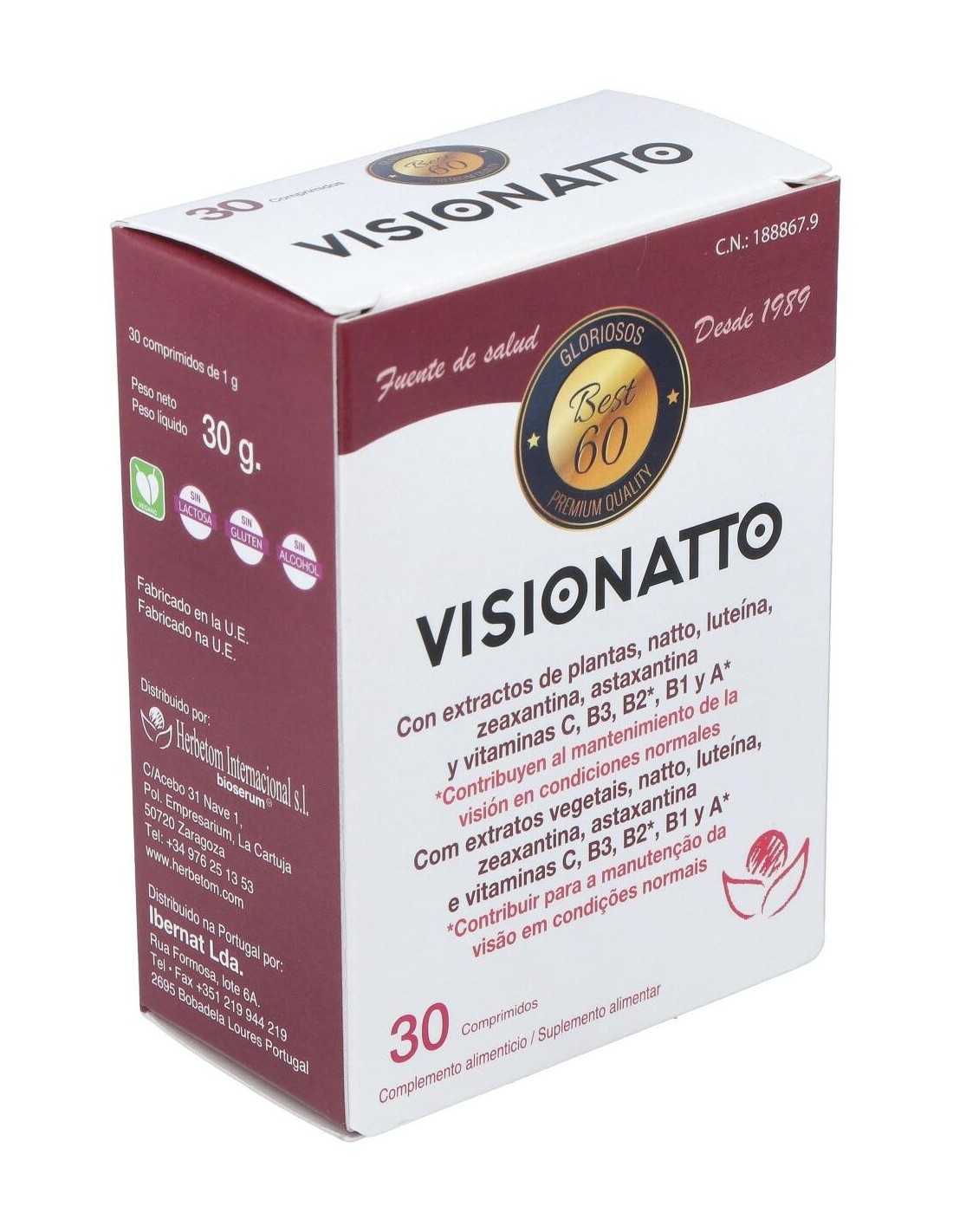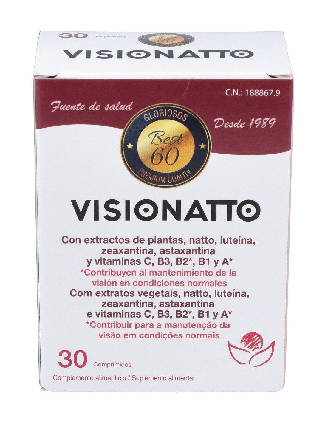 Las pantallas de los móviles y ordenadores, la sequedad del aire por la calefacción, realizar esfuerzos con la vista o el deterioro de la vista por la edad perjudica la salud de nuestros ojos. Además, tener un colesterol elevado, el consumo de tabaco, la edad y llevar una vida sedentaria puede aumentar el riesgo de que se formen coágulos en el interior de los vasos y se formen obstrucciones vasculares, pudiendo afectar a la vena central de la retina o bien a algunas de las ramas dentro del ojo. Visionatto es un conjunto de ingredientes activos y vitaminas que ayudan a mantener una buena salud ocular y contribuyen a una visión en condiciones normales. Composición activa por comprimido: