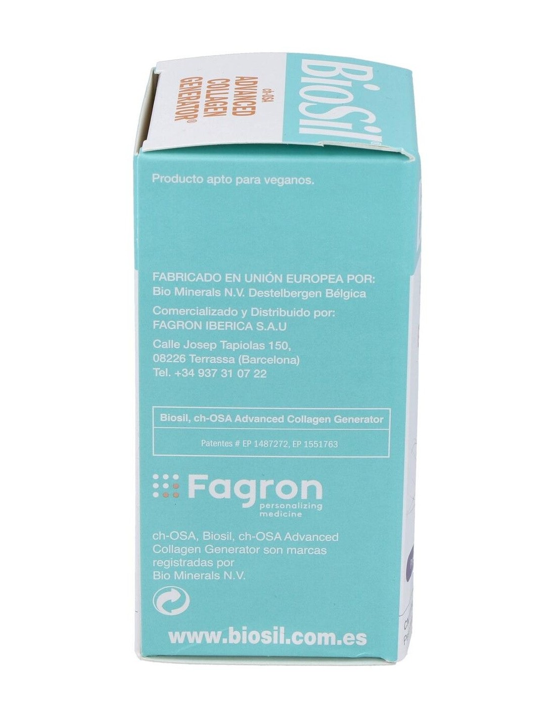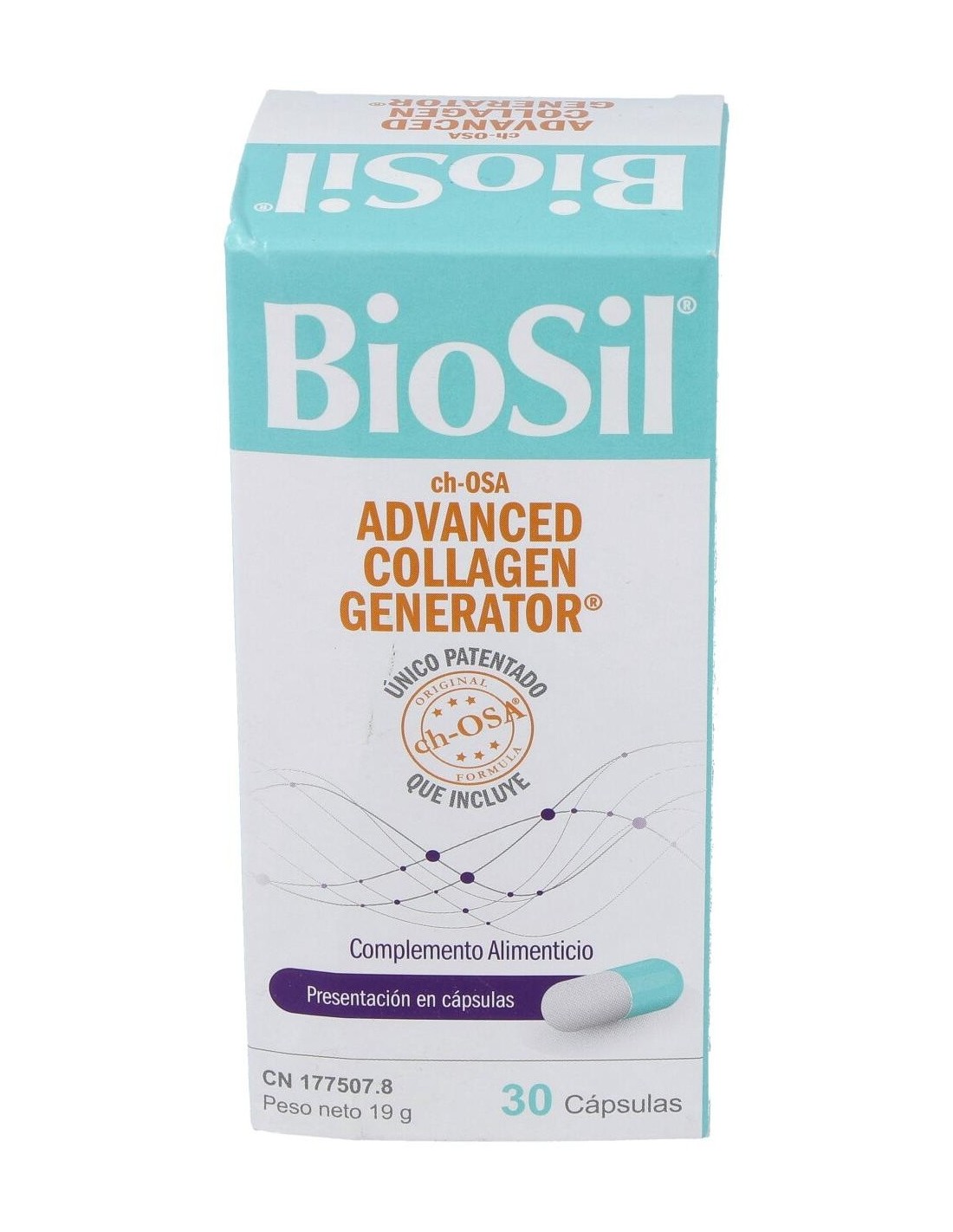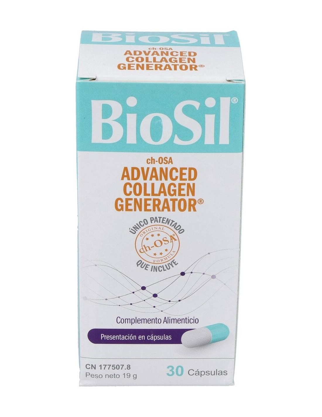 Cápsulas Generador Avanzado de Colágeno de la marca Biosil con una efectividad clínicamente comprobada, que ayuda a mantener la piel, cabello, uñas, huesos y articulaciones sanos, activando las células del propio cuerpo que general colágeno, ayudando a frenar el proceso de envejecimiento y aumentando la elasticidad de la piel.