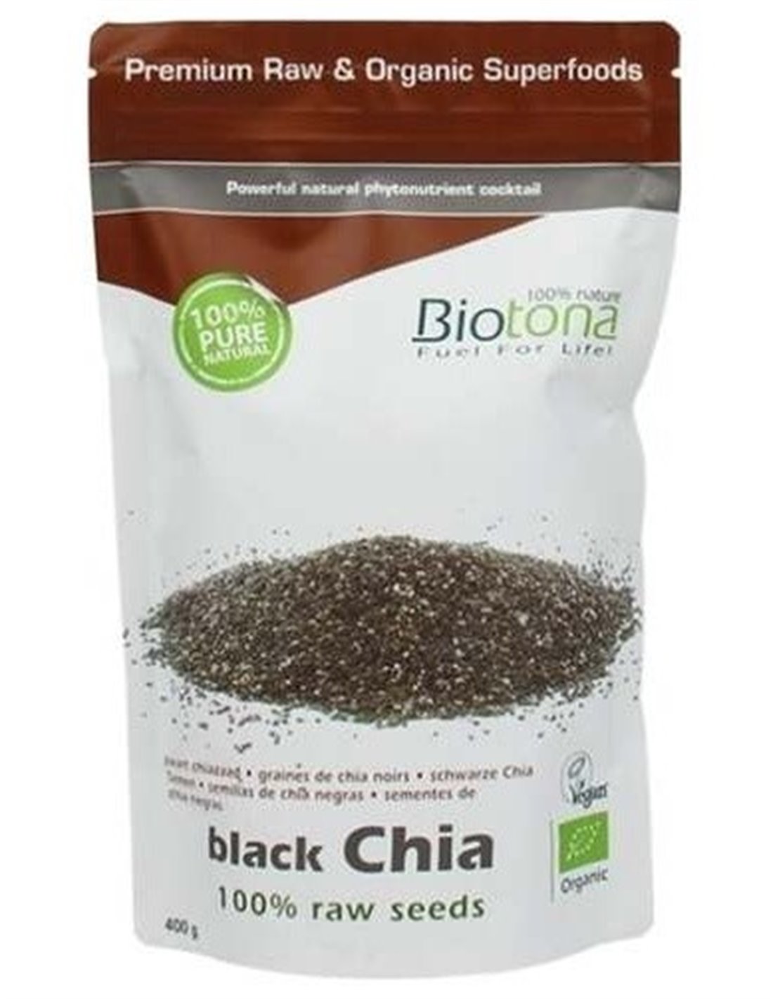 Black Chia Raw Seeds de Biotona son semillas de chía crudas, ideales para personas que buscan enriquecer su dieta con fibra y ácidos grasos omega-3, gracias a su contenido natural y sin procesar.