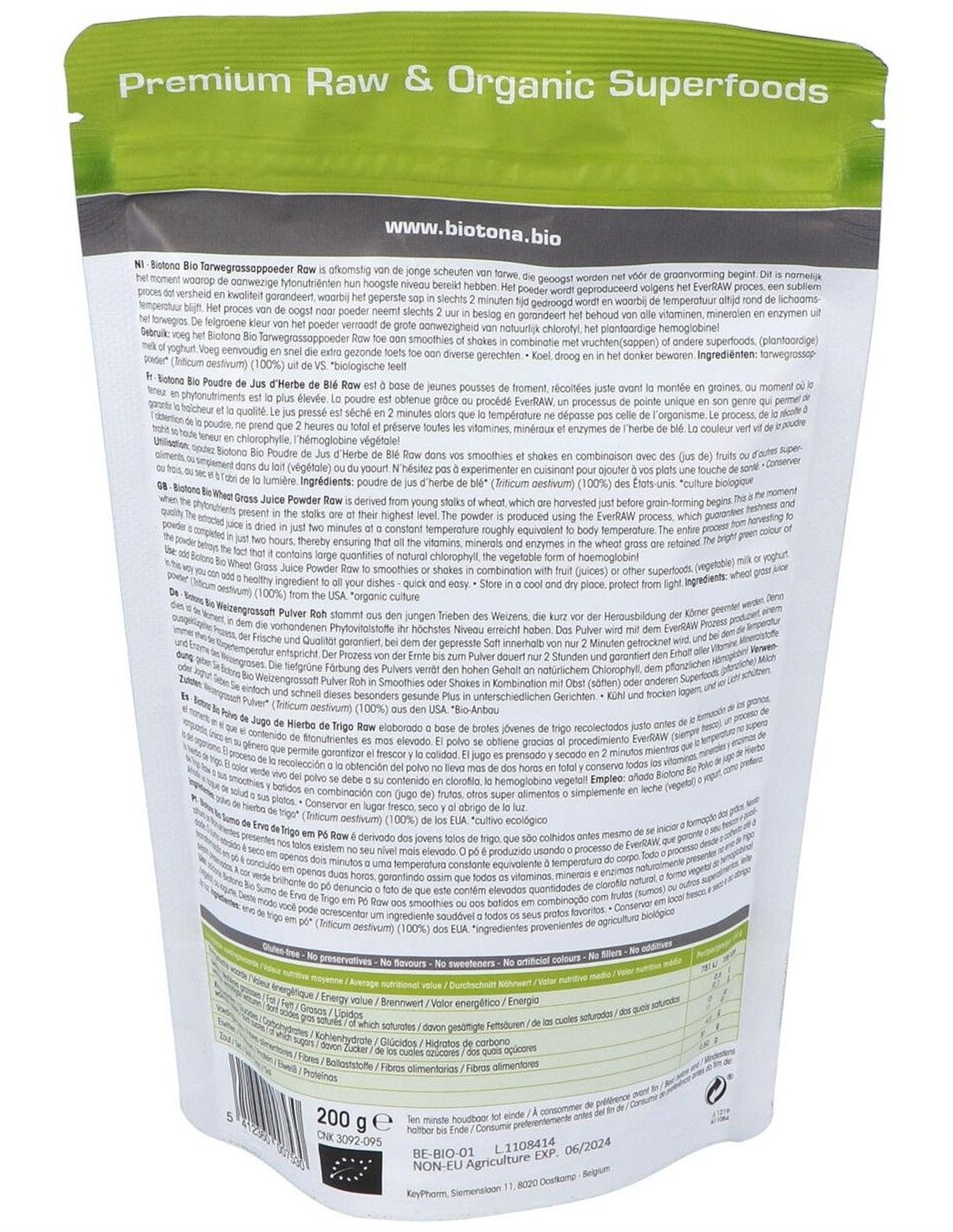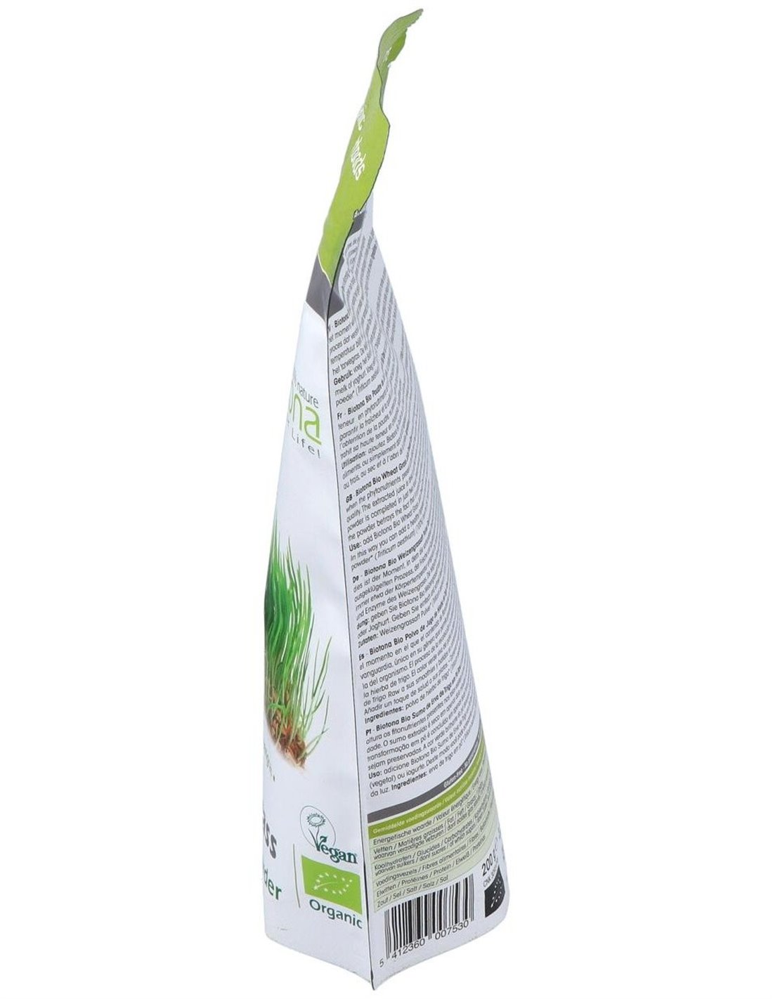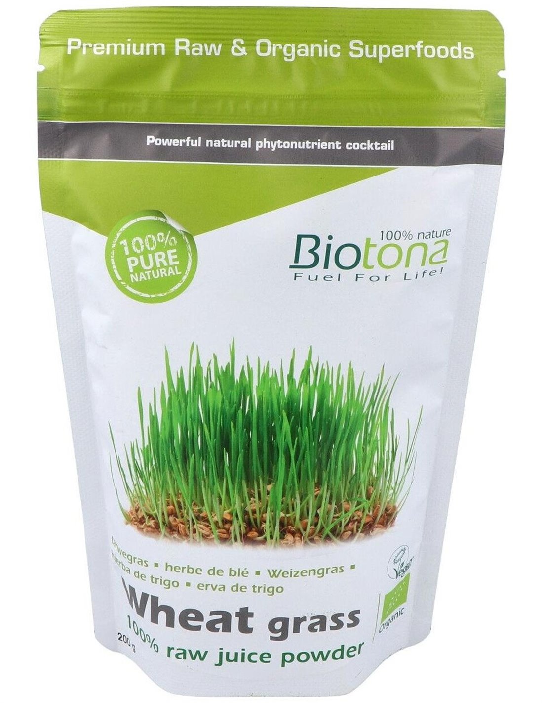 El Wheat Grass Raw Juice Powder de Biotona es un suplemento en polvo para personas que buscan incorporar nutrientes vegetales. Proporciona extracto concentrado de hierba de trigo mediante un proceso de prensado en frío.