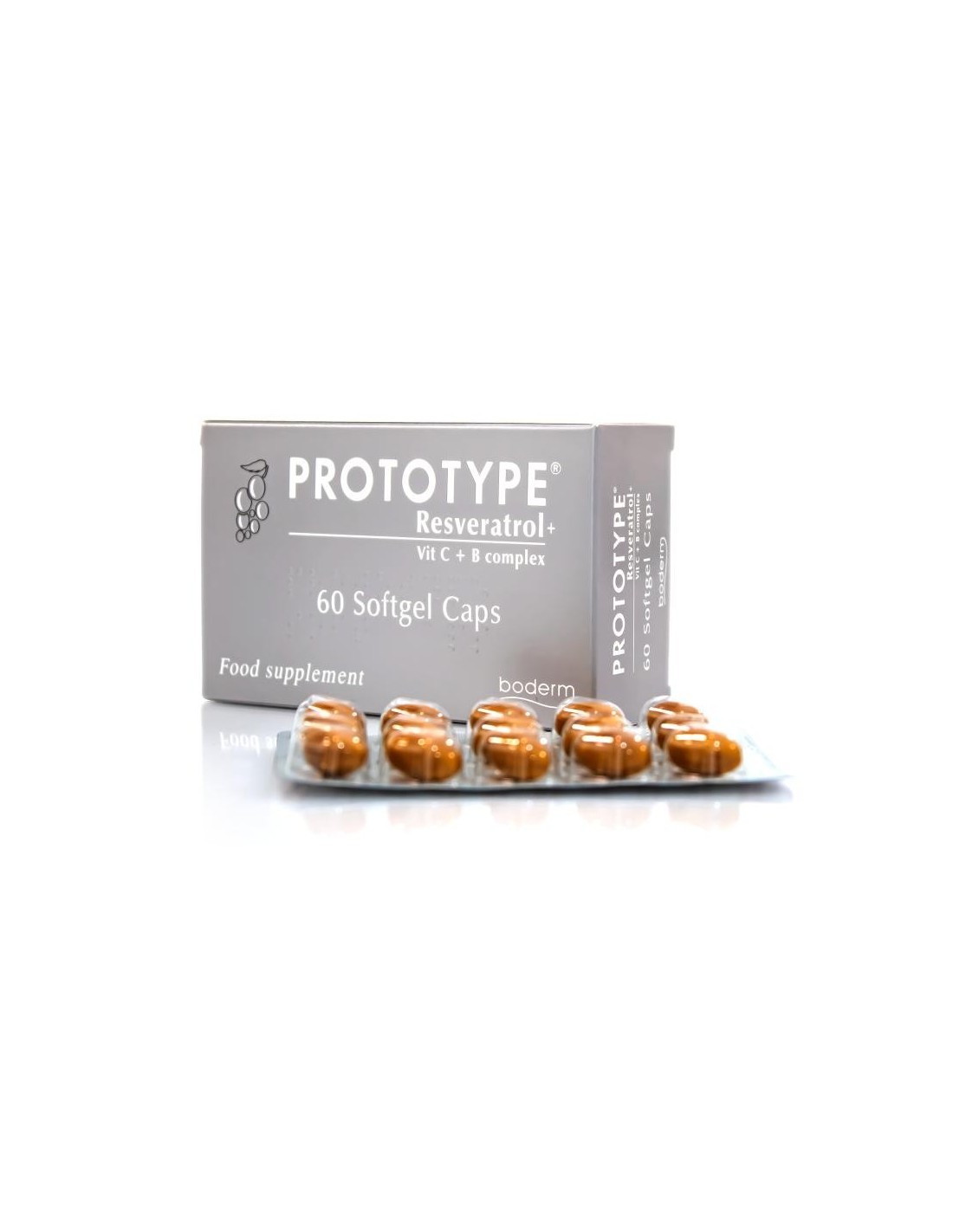 Las cápsulas de gel suave PROTOTYPE contienen resveratrol natural (un componente beneficioso del vino tinto ), de la raíz de la planta Polygonum cuspidatum, que es la mayor fuente de resveratrol en la naturaleza. Las cápsulas PROTOTYPE también contienen vitamina C y complejo vitamínico B. La vitamina C se caracteriza por su actividad antioxidante, y se considera esencial para ayudar a la síntesis de colágeno, para mantener la piel en condiciones normales.