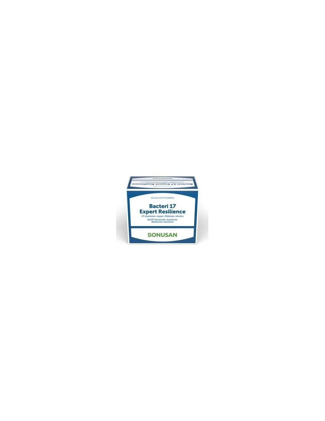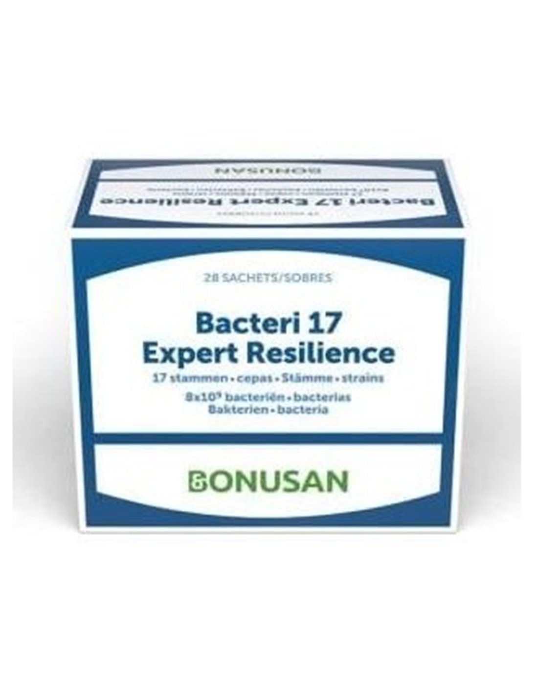 Las bacterias son microorganismos. Estos diminutos organismos unicelulares viven a nuestro alrededor y también en el exterior e interior de nuestro cuerpo. En el tracto intestinal viven cerca de 100 billones (1014) de microorganismos, con un peso total de entre 1 y 3 kg. Al conjunto de bacterias en el intestino también se le denomina flora intestinal o microbioma. El microbioma contiene aproximadamente tantas bacterias como células hay en el cuerpo humano. ¿Qué hacen las bacterias? Las bacterias existen desde mucho antes que los humanos; llevan poblando la Tierra desde hace ya 3500 millones de años. Sin ellas, la vida en nuestro planeta no sería posible. Son, pues, unos organismos importantísimos. Una de las características de las bacterias es que, gracias a la evolución, se pueden adaptar a casi cualquier entorno; entre otros, a las condiciones existentes en nuestro cuerpo. Las bacterias viven en la piel, la boca, la nariz, las vías urinarias y los órganos sexuales. La mayoría, sin embargo, se encuentran en los intestinos. ¿Por qué son útiles las bacterias? Las bacterias no siempre tienen buena fama, ya que pueden provocar muchas enfermedades desagradables. A estas bacterias que causan enfermedades también se las llama bacterias patógenas. Pero no todas las bacterias son patógenas y causan enfermedades; también existen bacterias que son esenciales para nuestro cuerpo. Las barreras naturales de nuestro cuerpo, como el intestino, albergan todo tipo de bacterias diferentes. Lo importante es mantener un buen equilibrio entre las distintas cepas bacterianas.Las ventajas de Bacteri 17 Expert Resilience de BonusanCuantas más cepas tenga un suplemento bacteriano, mejor. Con nada menos que 17 cepas, Bacteri 17 Expert Resilience de Bonusan ofrece una cantidad y diversidad de cepas bacterianas sin precedentes. Todas las cepas están presentes en el microbioma humano de forma natural.¿Qué contiene Bacteri 17 Expert Resilience de Bonusan? En determinadas situaciones, puede ser útil emplear un suplemento bacteriano de amplio espectro. Bacteri 17 Expert Resilience contiene 7 especies de lactobacilos (bacterias lácticas) y 5 especies de bifidobacterias, así como lactococos, pediococos, estreptococos y enterococos. Todas las cepas han sido investigadas científicamente en profundidad. Además, Bacteri 17 Expert Resilience contiene 8 mil millones de bacterias garantizadas hasta la fecha de caducidad. Los productos Bacteri de Bonusan no contienen ningún añadido innecesario ni otras vitaminas o minerales. Esto permite garantizar una mayor viabilidad de las bacterias y controlar la capacidad de rehidratación de las cepas bacterianas presentes. Las bacterias se producen y secan en circunstancias controladas. El secado garantiza que las bacterias se conserven durante más tiempo, siempre que se almacenen a temperatura ambiente, en un entorno seco y protegido (cápsulas o sobres). Los productos bacterianos necesitan un excipiente para poder conservarse. En el caso de Bacteri 17 Expert Resilience, utilizamos maltodextrina, fructooligosacáridos (FOS) e inulina como excipientes. Los FOS y la inulina son fibras alimentarias fermentables. Bacteri 17 Expert Resilience de Bonusan está envasado en unos prácticos sobres de dosis individuales. ¿Por qué se utilizan sobres? Los sobres ofrecen a las bacterias la mejor protección. Gracias a su envoltorio de lámina de aluminio, las bacterias están perfectamente protegidas de la humedad, el aire, la luz y otras influencias ambientales. ¿Cómo se utiliza este suplemento?Disuelve el contenido del sobre en un vaso con agua tibia a un máximo de 37°C, es decir, a temperatura corporal. Las temperaturas más elevadas influyen negativamente en la viabilidad de las bacterias. Al disolver el polvo en agua, las bacterias tiene la oportunidad de salir de la fase de latencia y activarse. Esto las hace más resistentes al ácido del estómago y la bilis, y más bacterias sobreviven este difícil pasaje. El suplemento se puede beber directamente. Se recomienda beber el contenido de pie. Cuando estamos de pie, los músculos del estómago se encuentran en una posición que acelera el paso por el estómago. Además, para obtener el mayor efecto posible, se recomienda tomar el suplemento Bacteri con el estómago vacío antes de irse a dormir. Otro buen momento para tomarlo es media hora antes de desayunar o en combinación con una comida rica en hidratos de carbono y baja en grasas.Bacterias intestinales de alta calidadAl desarrollar la gama Bacteri, se ha intentado aproximarse lo máximo posible a la composición natural del microbioma. Esta gama de productos consta de diferentes suplementos que se pueden emplear según la necesidad. Bacteri 17 Expert Resilience ofrece la mayor diversidad y cantidad de cepas.Todas las cepas de este producto de amplio espectro se encuentran en la lista de QPS (presunción cualificada de seguridad) y, por tanto, se han considerado seguras en numerosos estudios científicos y han sido aprobadas por la EFSA (Autoridad Europea de Seguridad Alimentaria) para su uso en alimentos. Se indican los números de cepas de todas las cepas añadidas.La cantidad de bacterias presentes en un suplemento se expresa con la abreviatura UFC, que significa "unidad formadora de colonias". La cantidad de UFC se indica en cientos o miles de millones y se suele expresar como "mil millones de UFC" o "1x109 UFC". Las UFC indicadas en los productos Bacteri de Bonusan quedan garantizadas desde el momento de producción hasta la fecha de caducidad.Bacteri 17 Expert Resilience de Bonusan es apto para: