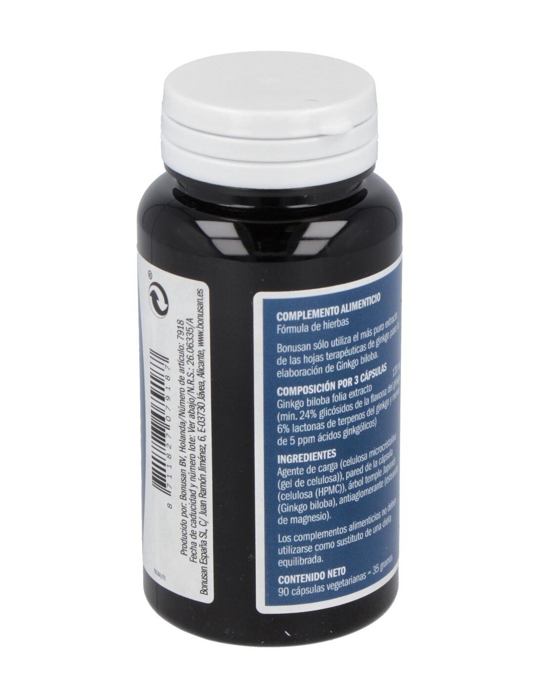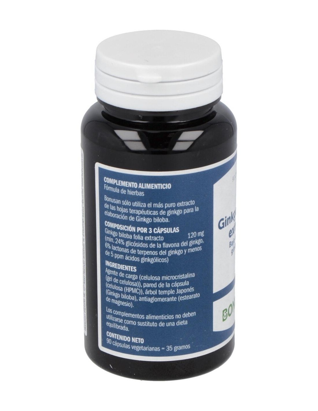El ginkgo biloba ha sido utilizado desde tiempos inmemoriales para fomentar una mente clara. Los efectos han sido cada vez más respaldados por un número creciente de laboratorios europeos. A efectos de producción del extracto de ginkgo biloba, Bonusan sólo utiliza el más puro extracto de las hojas terapéuticas de ginkgo. Esto garantiza un suministro eficaz de sangre al cerebro y tejidos, mejorando rápidamente su concentración y memoria. Ideal, entonces, si está un poco más ocupado en su trabajo, tiene que estudiar o tiene una vida familiar ajetreada. Para efectos a largo plazo, el ginkgo puede tomarse durante largos periodos de tiempo sin problemas. Composición por dosis diaria recomendada (3 cápsula):120 mg de extracto de ginkgo biloba (24% glicósidos de la flavona del ginkgo y 6% lactonas de terpeno del ginkgo). Modo de empleo:Tomar 1 cápsula 3 veces al día con la comida o inmediatamente después de ella. Es posible aumentar la dosificación hasta un máximo de 6 cápsulas por día. Para poder juzgar bien el impacto, se aconseja una ingesta de 8 a 12 semanas como mínimo. Presentación:Bote de 90 cápsulas.