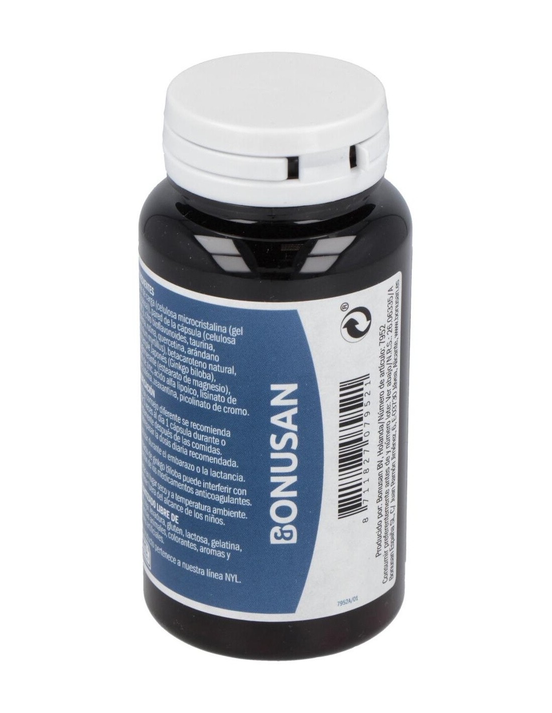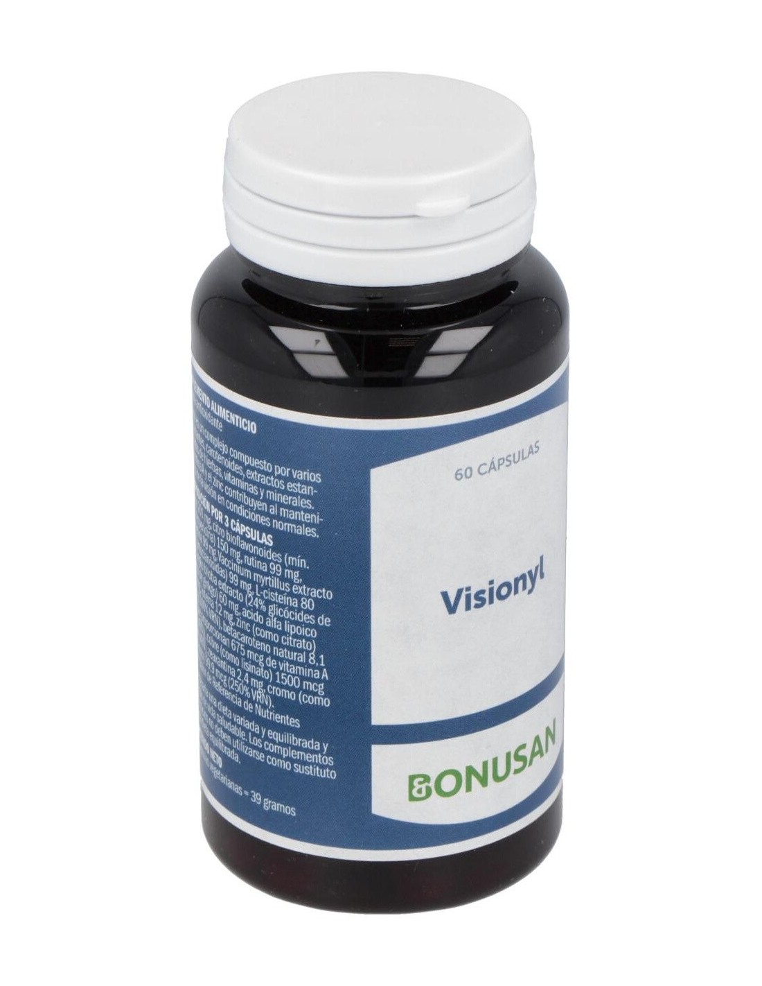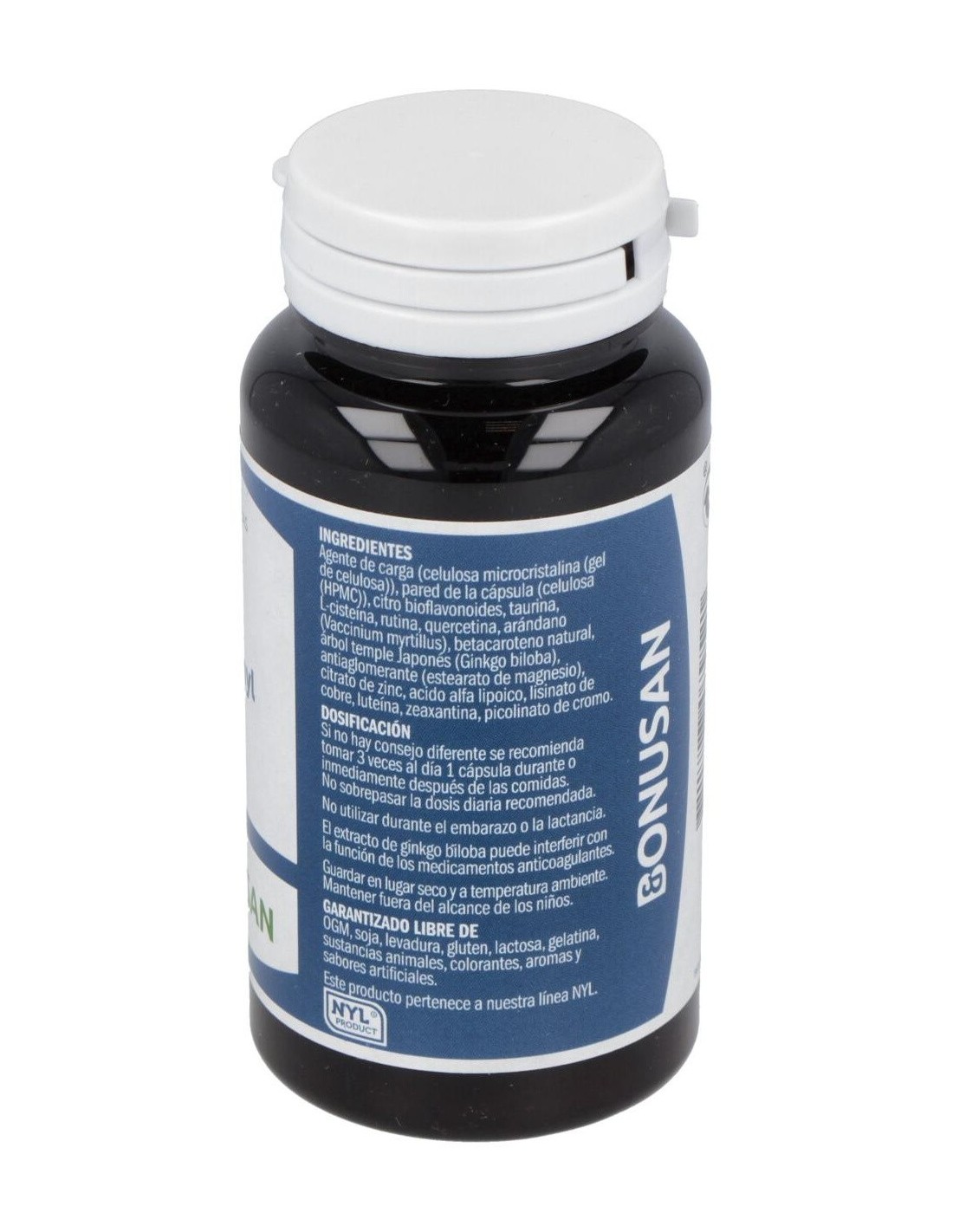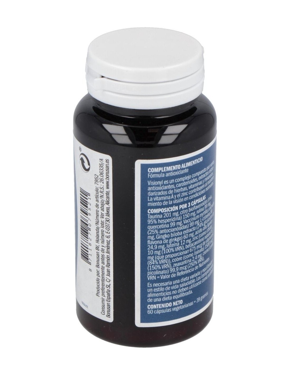 El cuerpo humano no es capaz de producir luteína y zeaxantina, parte de las manchas amarillas de los ojos, por lo que Bonusan ha desarrollado especialmente Visionyl. El producto contiene luteína. El efecto antioxidante de los arándanos ayuda a mantener la salud de los ojos y una buena vista. El Ginkgo también apoya a la visión. Todos nuestros productos de la línea NYL son óptimas fórmulas combinadas con un potente efecto adicional, resultando en una mejor facilidad de uso. Utilice Visionyl diariamente, sobre todo cuando sus ojos empiecen a envejecer. Composición por dosis diaria recomendada (3 cápsulas):