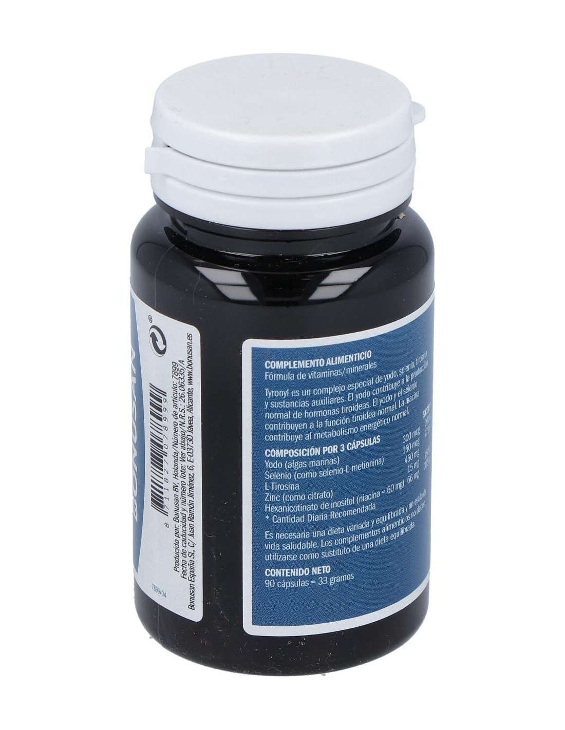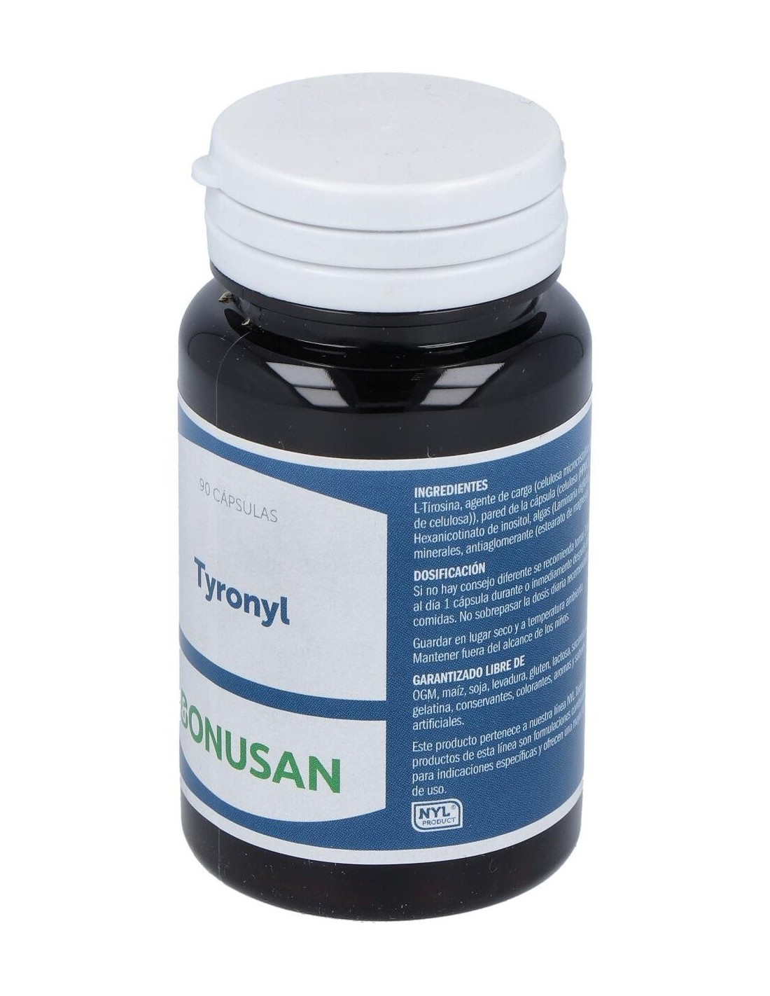 Tirosina, pared de la cápsula (hidroxipropilmetilcelulosa), agente de carga (celulosa microcristalina), inositolhexanicotinato, Laminaria digitata (kelp), citrato de zinc, antiaglomerante (sales magnésicas de ácidos grasos), selenio-L-metionina.