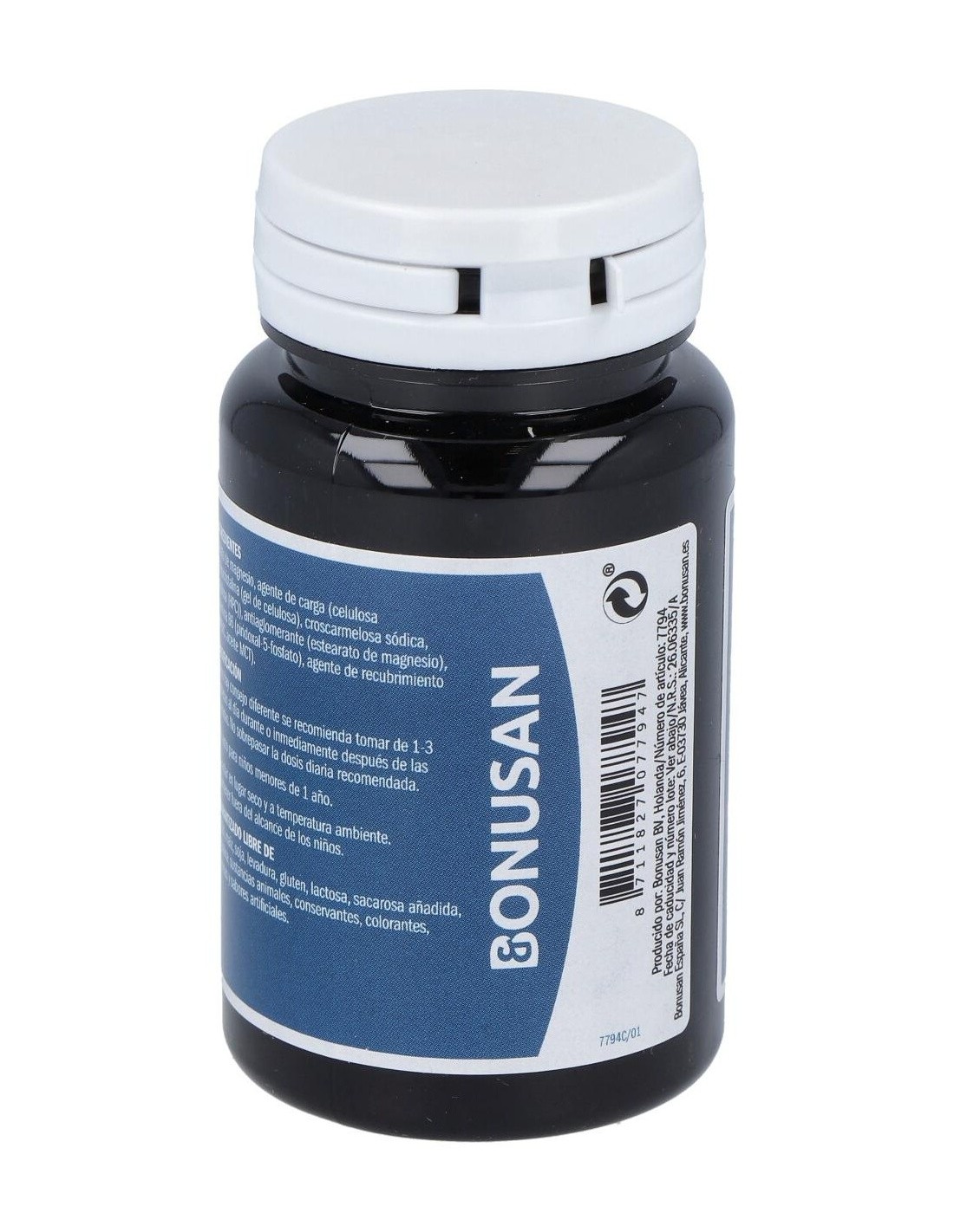 Citrato de magnesio, agente de carga (hidroxipropilcelulosa, celulosa microcristalina, goma de celulosa entrelazada), antiaglomerante (sales magnésicas de ácidos grasos), piridoxal 5'-fosfato, agente de recubrimiento (hidroxipropilmetilcelulosa, glicerina, hidroxipropilcelulosa).