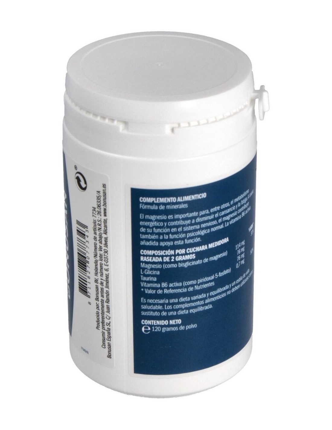 Bisglicinato de magnesio, acidulante (ácido cítrico), sabor (aroma con sabor a limón), glicina, taurina, piridoxal 5'-fosfato.