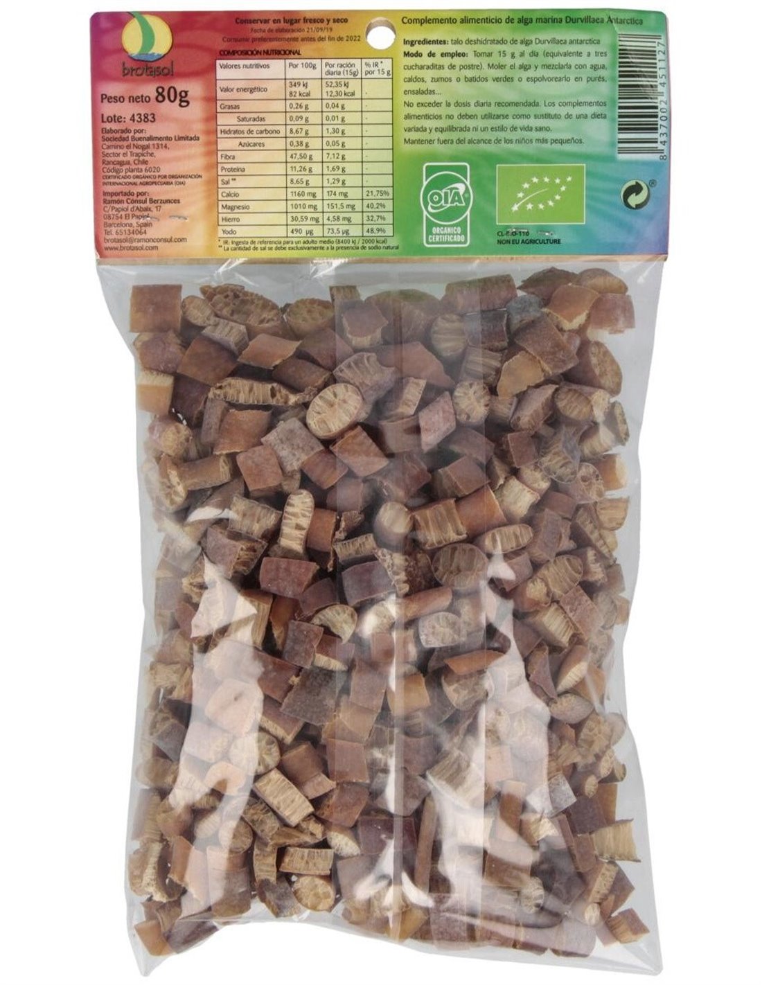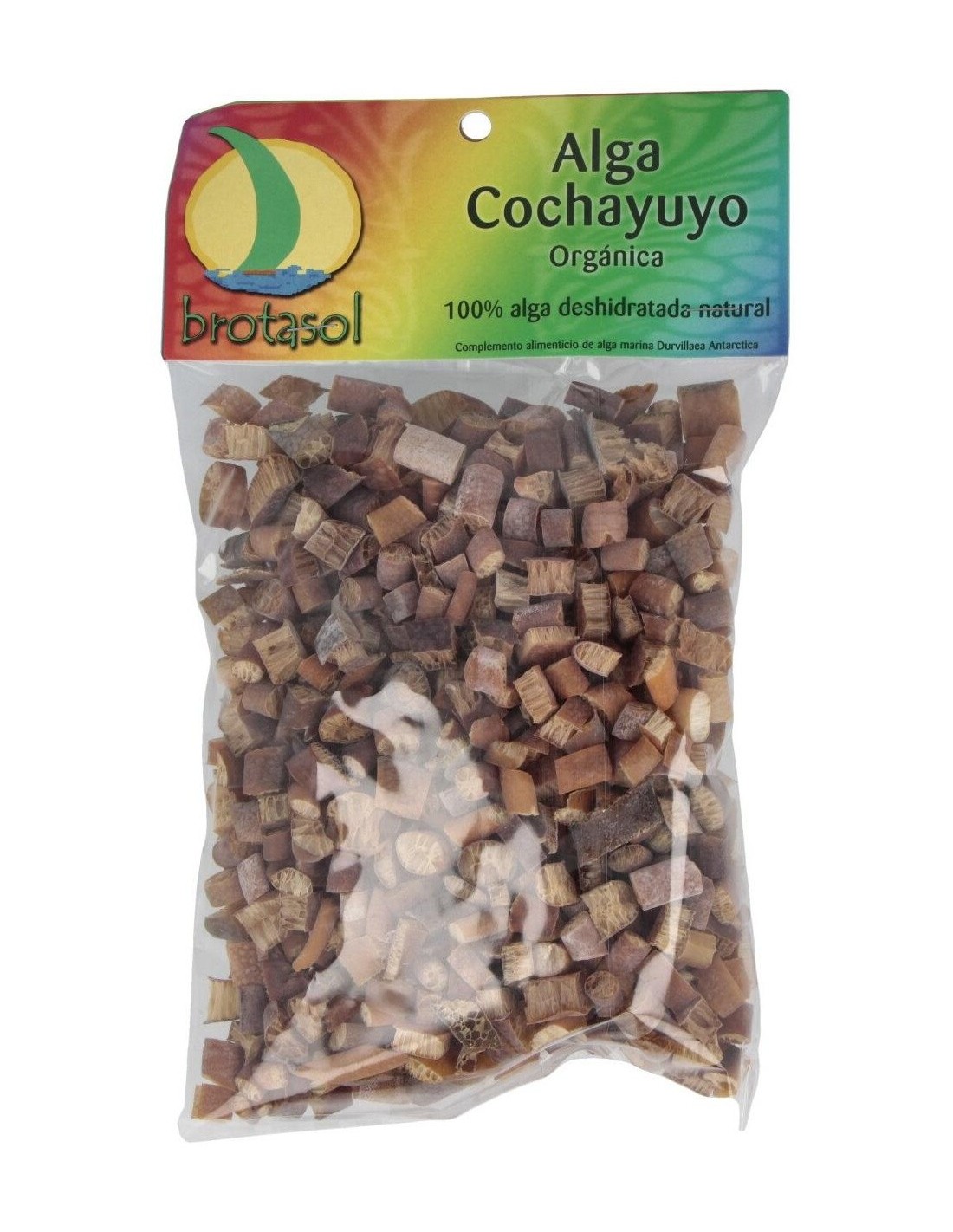 Complemento alimenticio de Alga Cochayuyo, contiene proteínas y fibra Rica en minerales y oligoelementos, especialmente en magnesio, calcio, hierro y yodo. Muy bajo contenido en grasas.