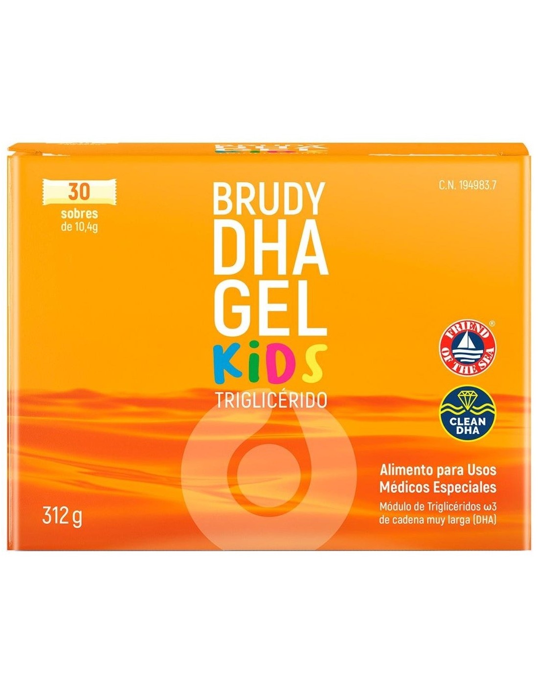 Emulsión bebible de triglicérido de DHA en forma de gel, edulcorado con fructosa y sabor a naranja. Producto de venta en farmacias, con receta médica.