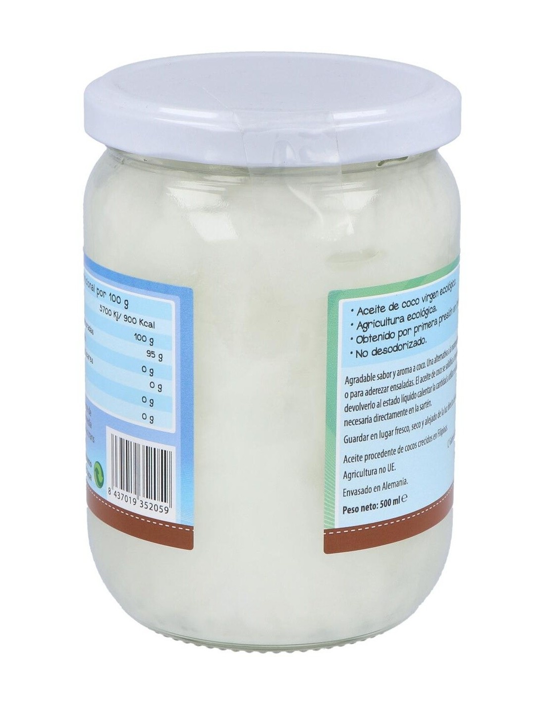 Aceite de coco virgen extraído de la parte tierna de cocos procedentes de plantaciones con certificados biológicos de Sri Lanka, India y Filipinas.Presenta un alto contenido en triglicéridos de cadena media (TCM), ácido laúrico y otros ácidos grasos en menor proporción.Tiene un agradable sabor y aroma a coco. Una alternativa a la mantequilla u otros aceites. Ideal para cocinar o para aderezar ensaladas.Puede usarse en aplicación externa como hidratante de la piel en general y como acondicionador de cabello.El aceite de coco se solidifica a temperaturas inferiores a 18°C. Para devolverlo al estado líquido, calentar la cantidad a utilizar en baño maría o bien poner directamente en la sartén.Guardar en lugar freso, seco y alejado de la luz directa del sol. Ingredientes:100% aceite de coco virgen ecológico, procedente de agricultura ecológica. Obtenido por primera presión en frío, sin calor ni químicos. Modo de empleo:Tomar de 1 cucharada de una a tres veces al día (10-30 ml). Se puede utilizar como aceite para untar o como aderezo para ensaladas. Para cocinar se puede sustituir por mantequilla, margarina, manteca u otros aceites, para cocer o freír a temperaturas hasta los 180ºC.Presentación:Frasco de 500 ml.