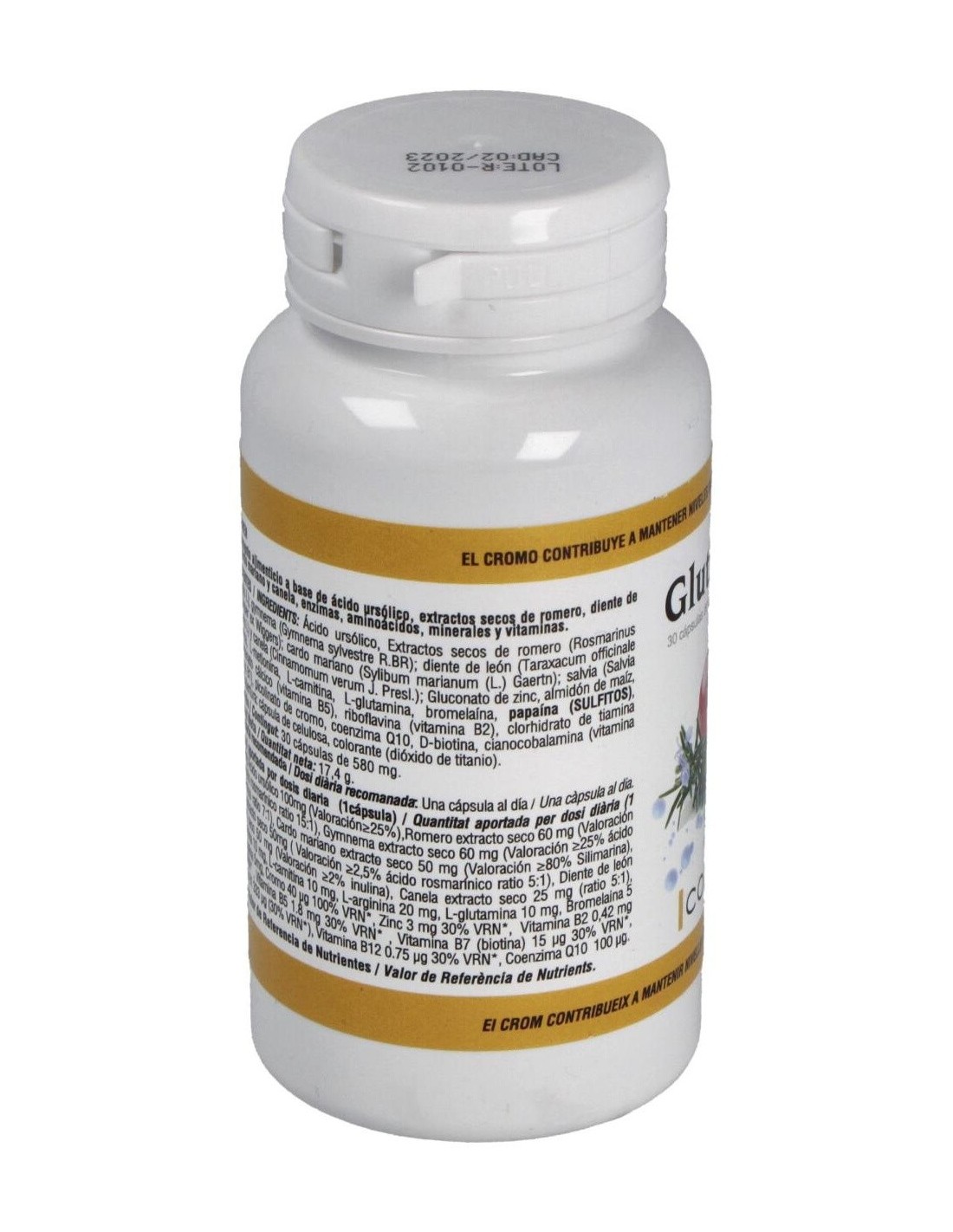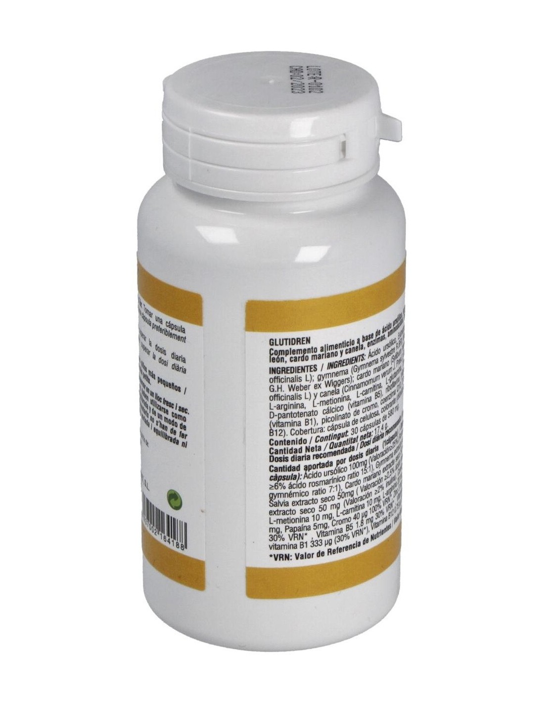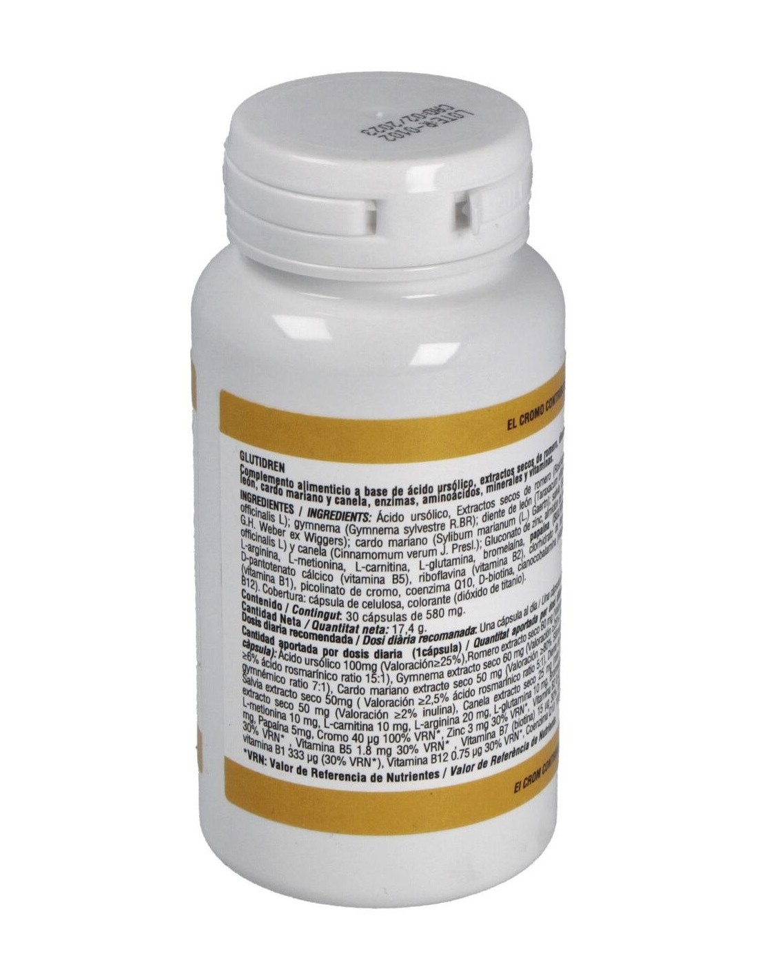 Ácido Ursólico (100mg), Extractos secos de Romero (Rosmarinusofficinalis L) (60 mg): Gymnema (Gymnema sylvestre R.BR) (60 mg): Diente de León (Taraxacum officinale G.H. Weber ex Wiggers) (50 mg): Cardo Mariano (Sylibum marianum (L.) Gaertn) (50 mg), Salvia (Salvia officinalis L) (50 mg) y Canela (Cinnamomum verum J. Presl.) (25 mg): Gluconato de zinc, almidón de maíz, L-arginina (20 mg), L-metionina (10 mg), L-carnitina (10 mg), L-glutamina (10 mg), Bromelaína, Papaína (5 mg), D-pantotenato cálcico (vitamina B5 1,8 mg), Riboflavina (vitamina B2 0,48 mg), clorhidrato de Tiamina (vitamina B1 333 µg), Picolinato de cromo (40 µg), Coenzima Q10 (100 µg), D-Biotina (15 µg), Cianocobalamina (vitamina B12 0,75 µg). Cobertura: cápsula de celulosa, colorante (dióxido de titanio).