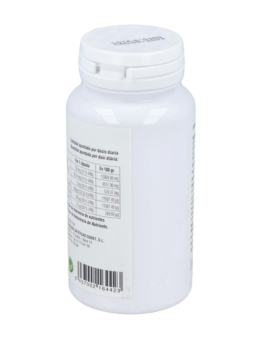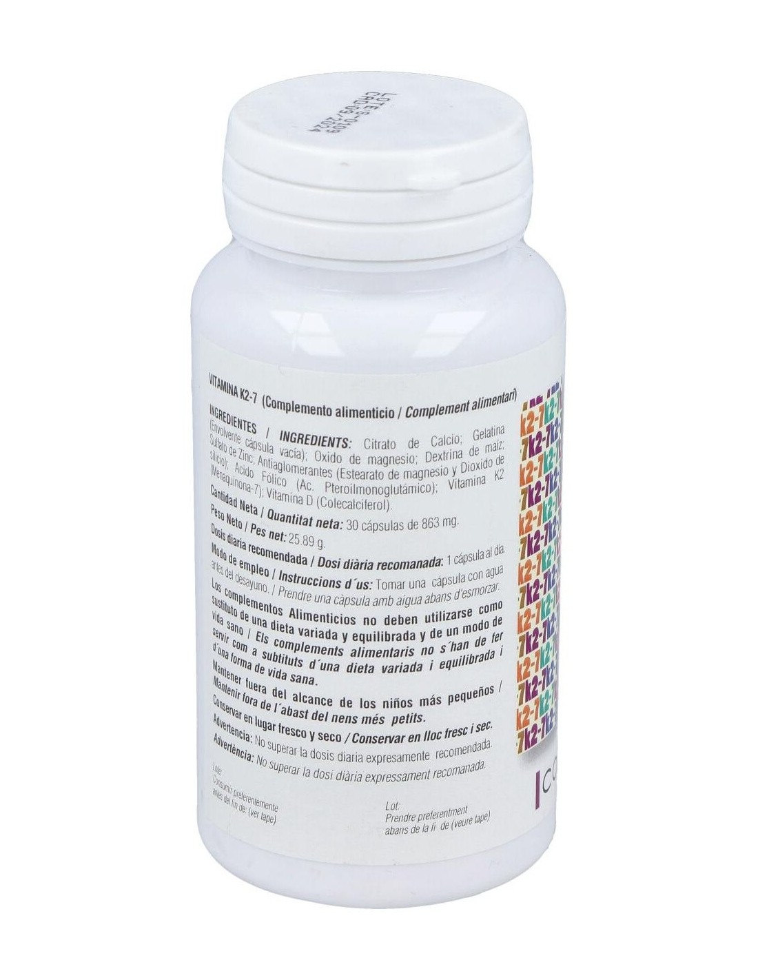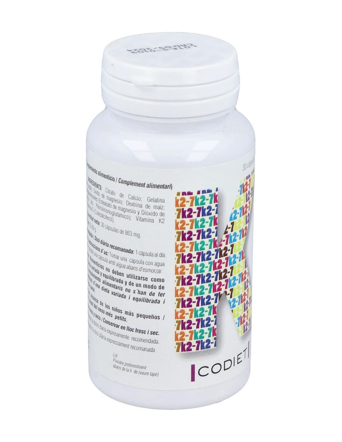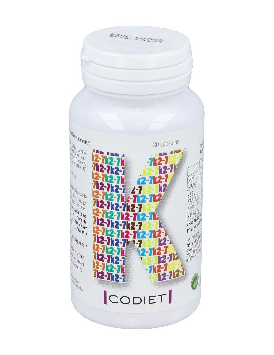 Complemento alimenticio en formato cápsulas vegetales, elaborado a base de vitamina K2-7 o menaquinona, que es la forma de vitamina K más activa y que permanece más tiempo en el organismo.La vitamina K contribuye al mantenimiento normal de los huesos, a la coagulación normal de la sangre, a mejorar la salud cardiovascular y a regular el crecimiento celular.Contiene además vitamina D3 en su forma de colecalciferol, que contribuye a una mayor absorción y aprovechamiento del calcio y fósforo en el organismo.