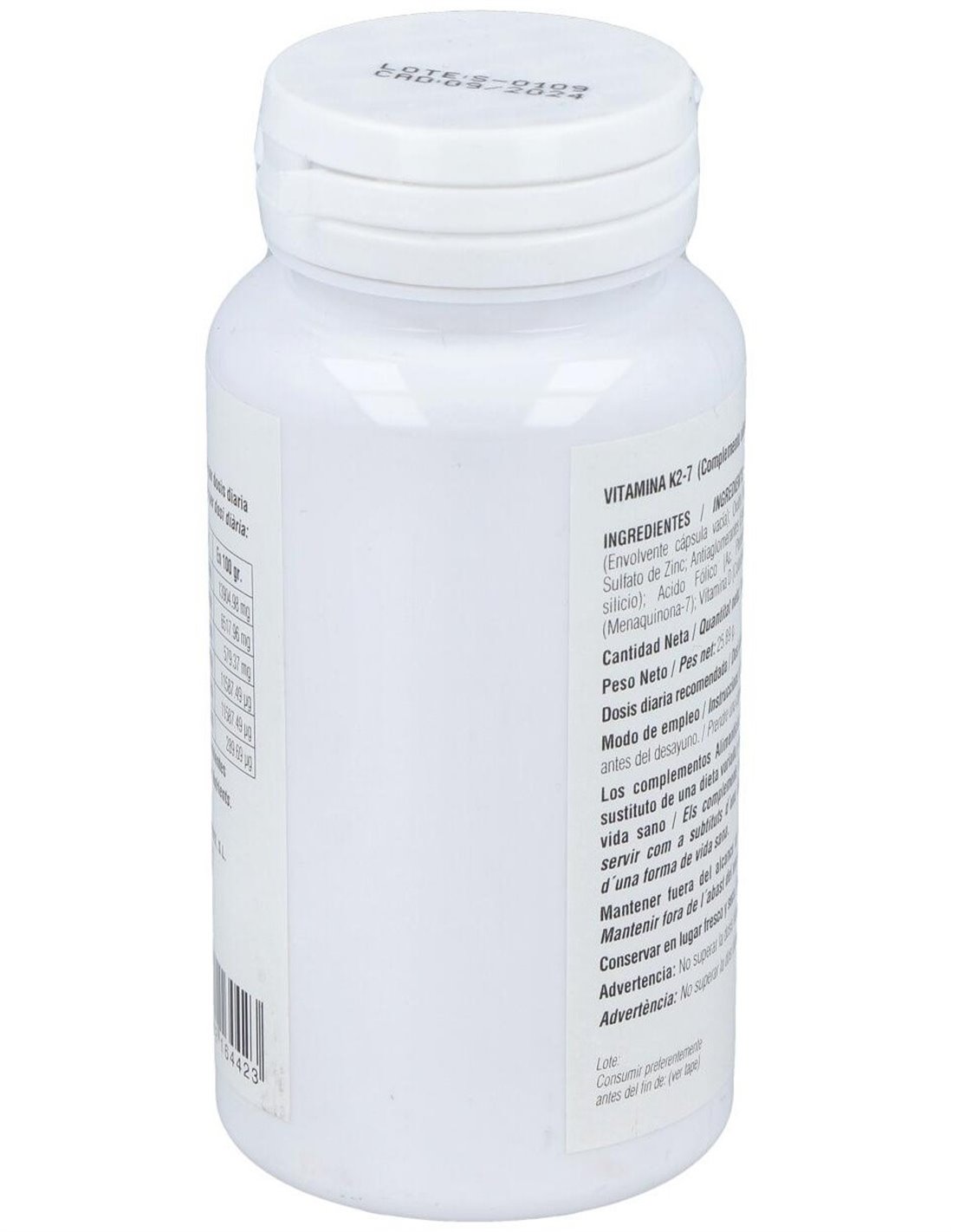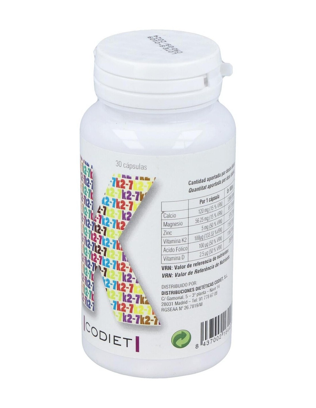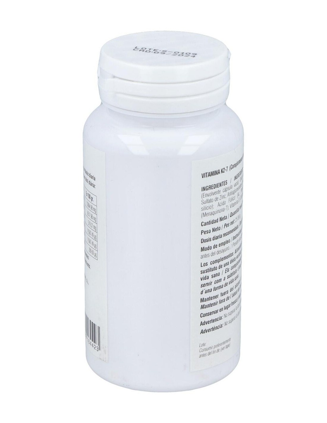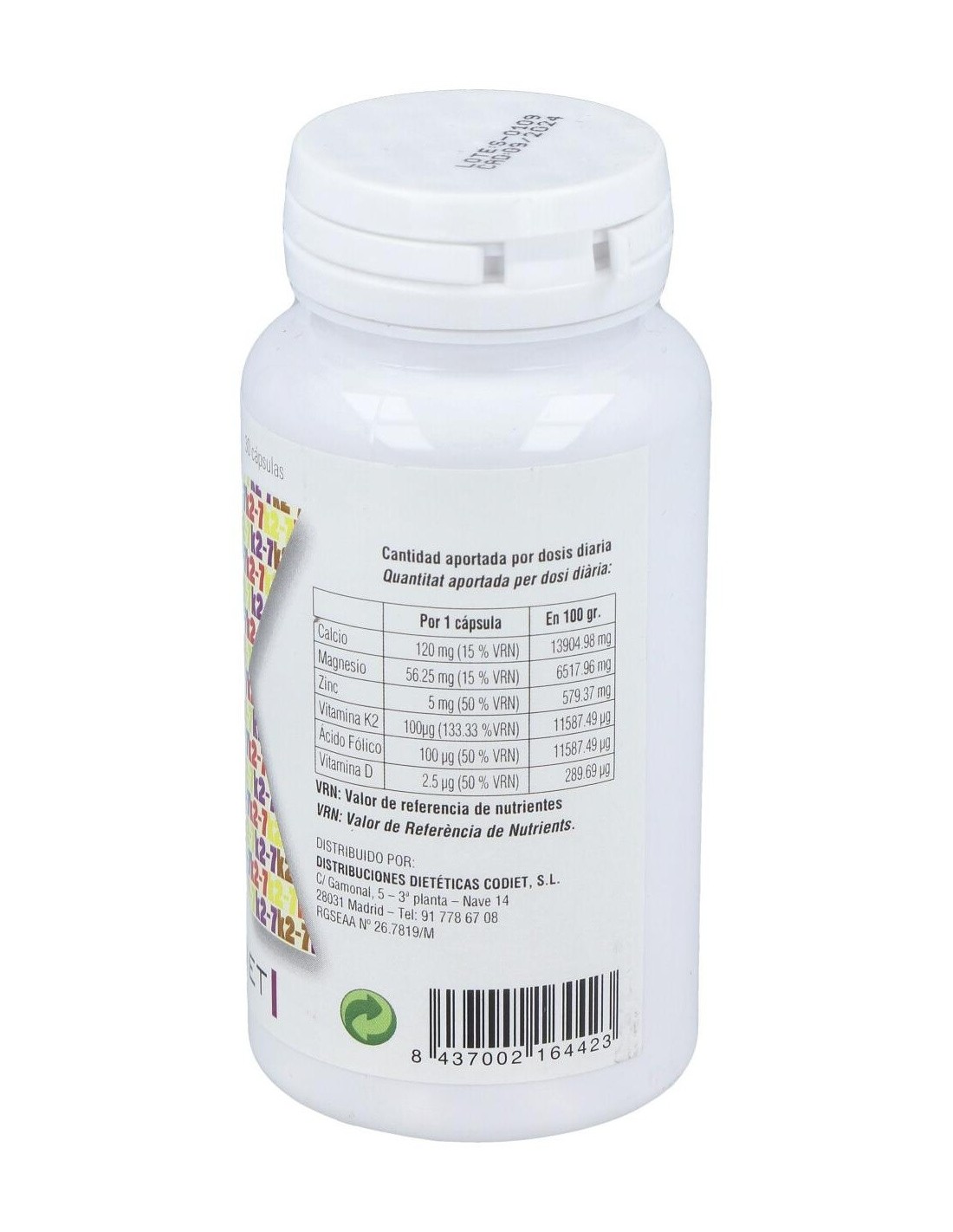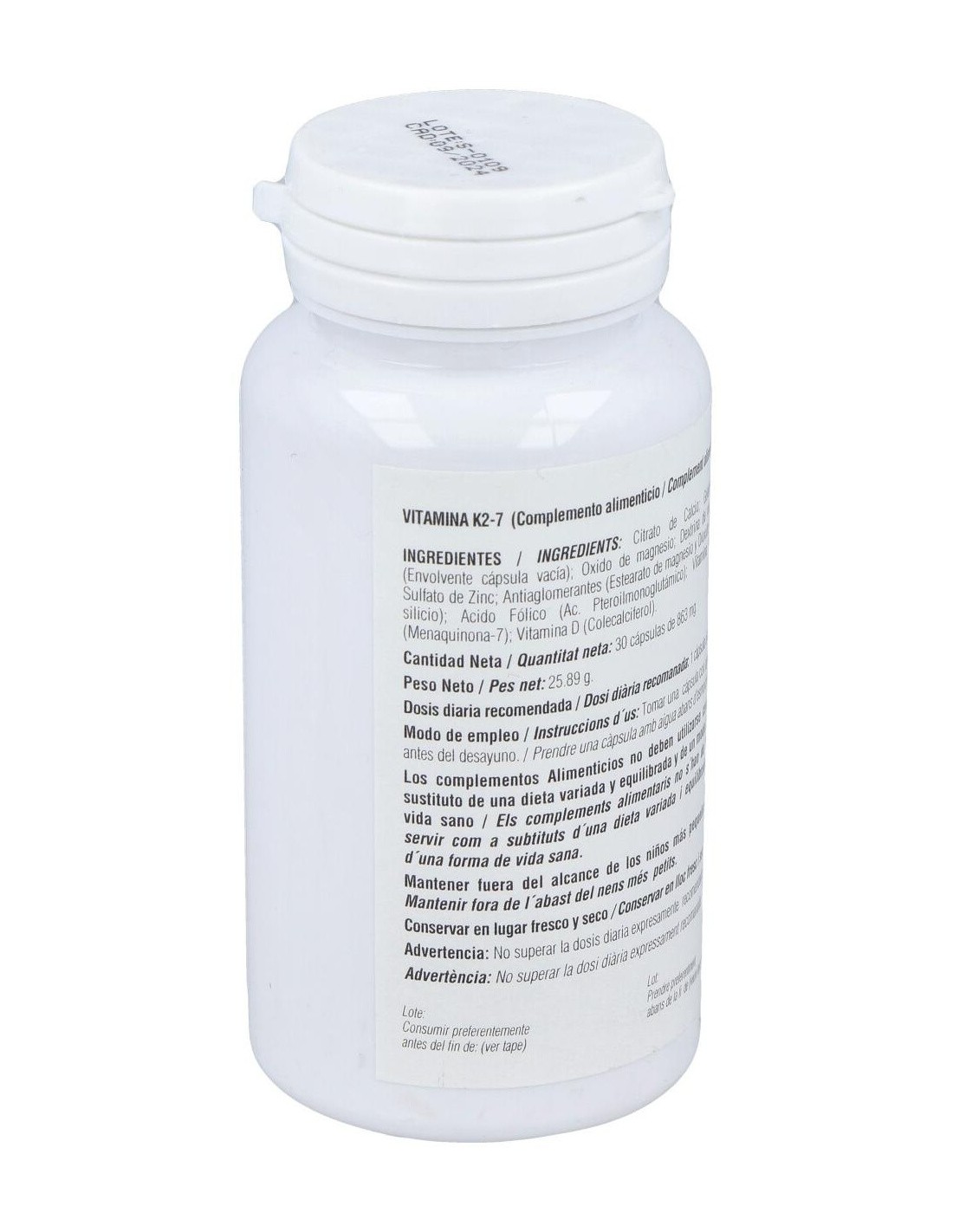 Complemento alimenticio en formato cápsulas vegetales, elaborado a base de vitamina K2-7 o menaquinona, que es la forma de vitamina K más activa y que permanece más tiempo en el organismo.La vitamina K contribuye al mantenimiento normal de los huesos, a la coagulación normal de la sangre, a mejorar la salud cardiovascular y a regular el crecimiento celular.Contiene además vitamina D3 en su forma de colecalciferol, que contribuye a una mayor absorción y aprovechamiento del calcio y fósforo en el organismo.