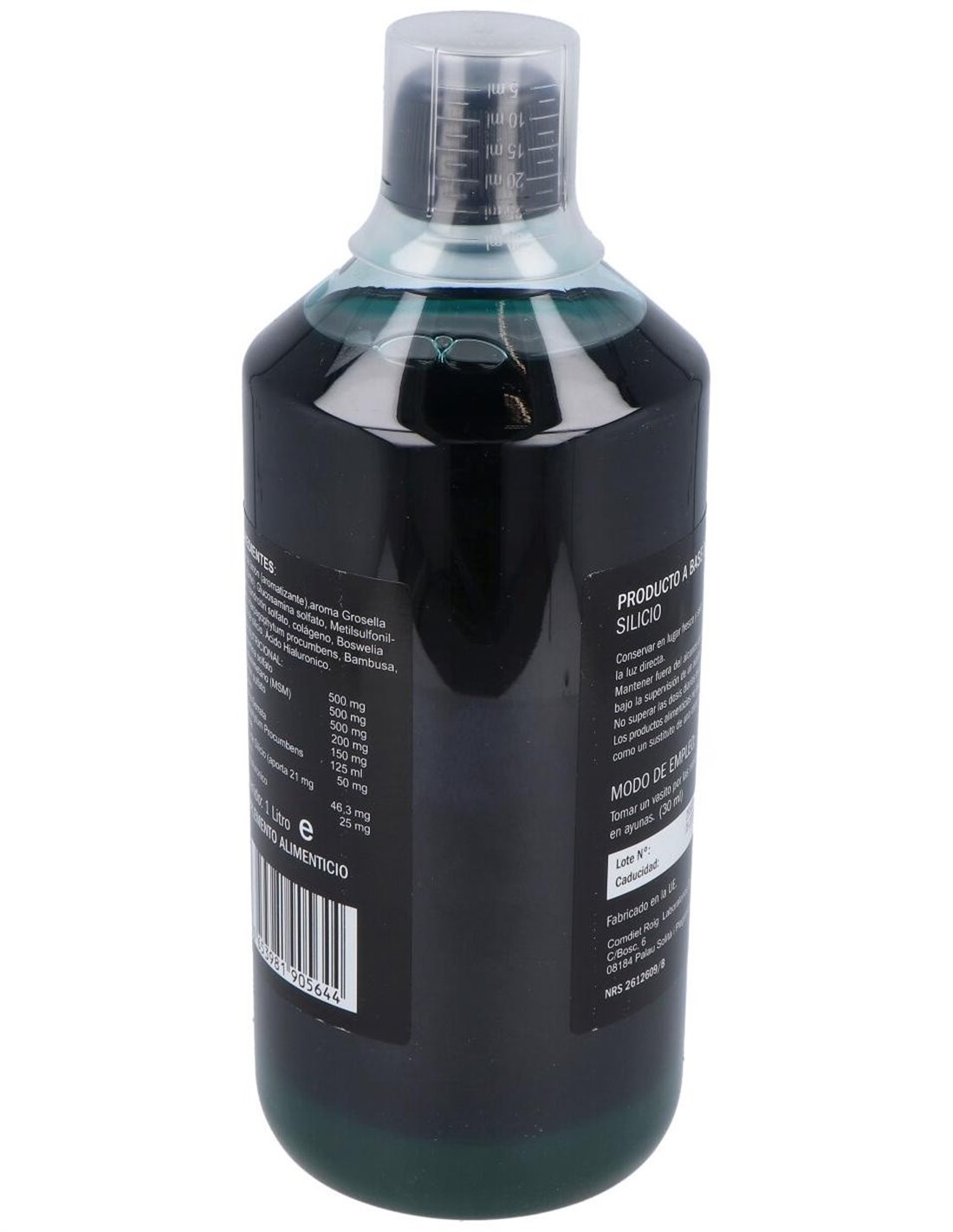 Sulfato de glucosamina 500 mg, sulfato de condroitina 500 mg, MSM 500 mg, colágeno marino hidrolizado 200 mg, boswellia serrata (ext fluido) 150 mg, harpagophytum procumbens (ext. fluido) 125 mg, bambusa arundinacea (ext seco) 50 mg, silicio (dióxido) 46,3 mg (aporta 21 mg), ácido hialurónico 25 mg, agua, concentrado de limón (aromatizante),concentrado de grosellero negro (saborizante), benzoato sódico, sorbato potásico, ácido cítrico, sucralosa (edulcorante), colorante azul, miel (espesante).